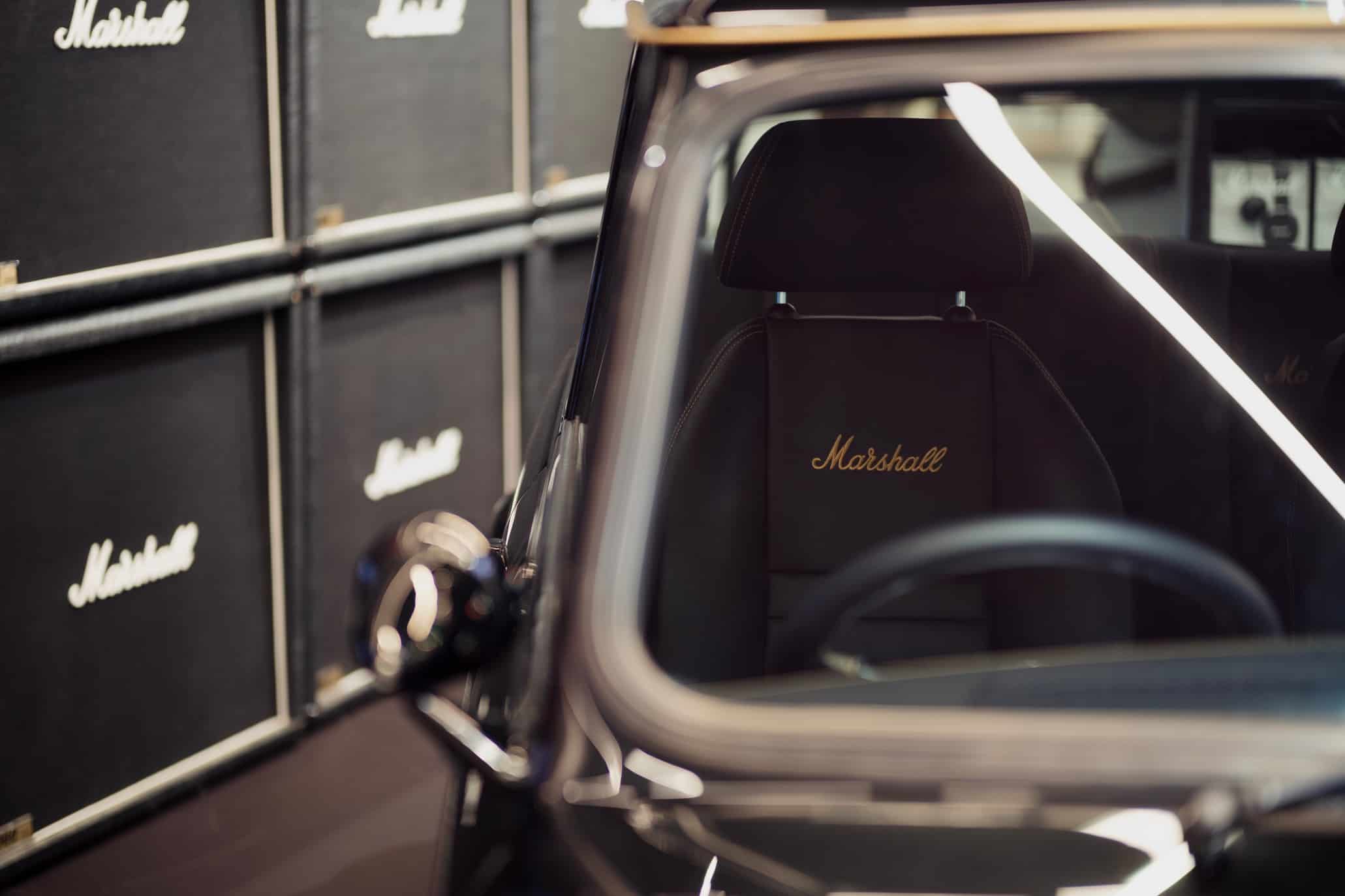 Stepping inside, there’s more of that gold for the revamped cabin as the striking color adorns the switchgear, center console, handbrake lever, door handles, and even the pedals where you’ll notice the skip track, pause, and play icons. As for the door cards, they’re covered in a special fabric serving as a visual nod to Marshall’s amplifiers. The seats are hand-trimmed in black leather with gold contrast stitching and “Marshall” logos embroidered on the backrests.