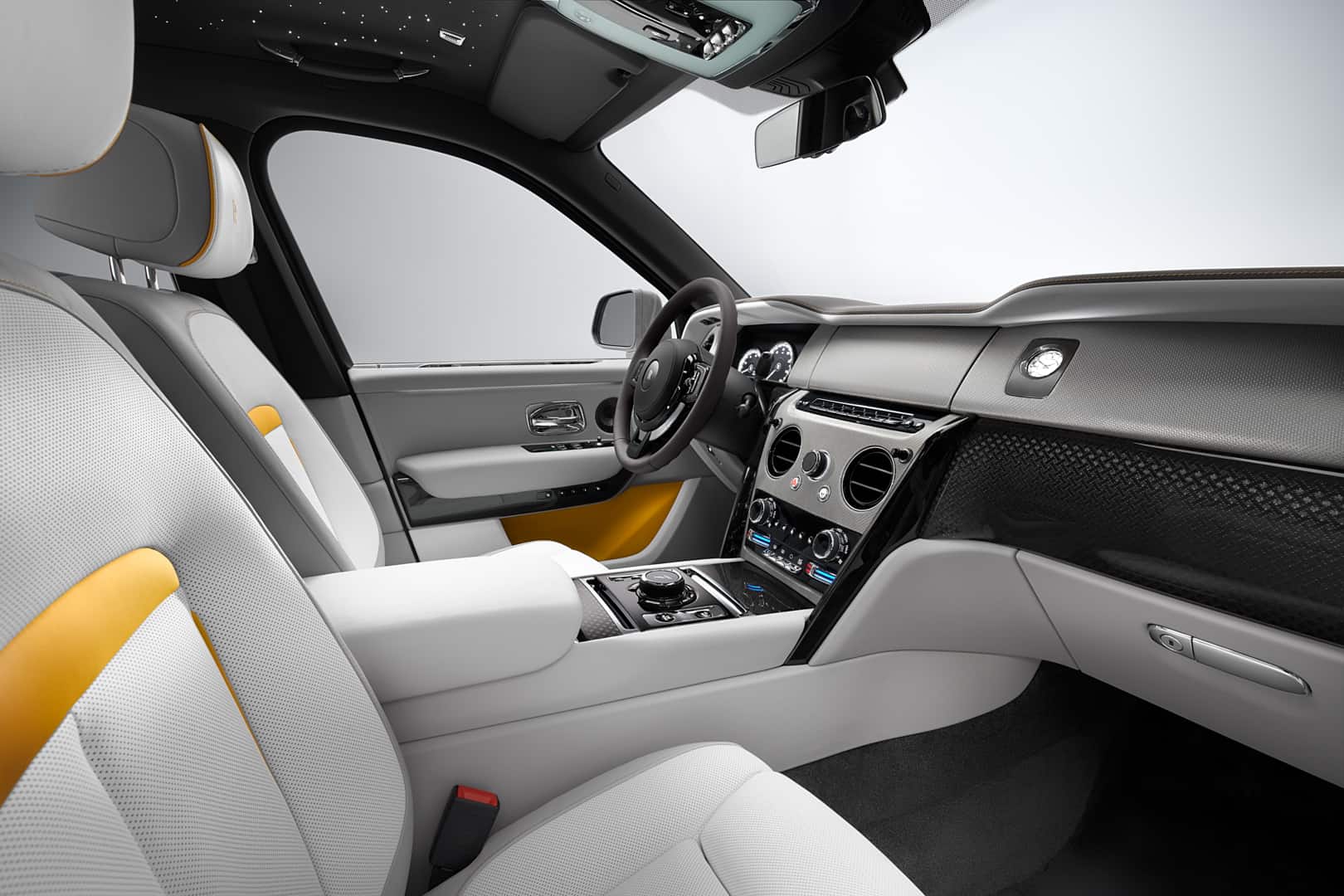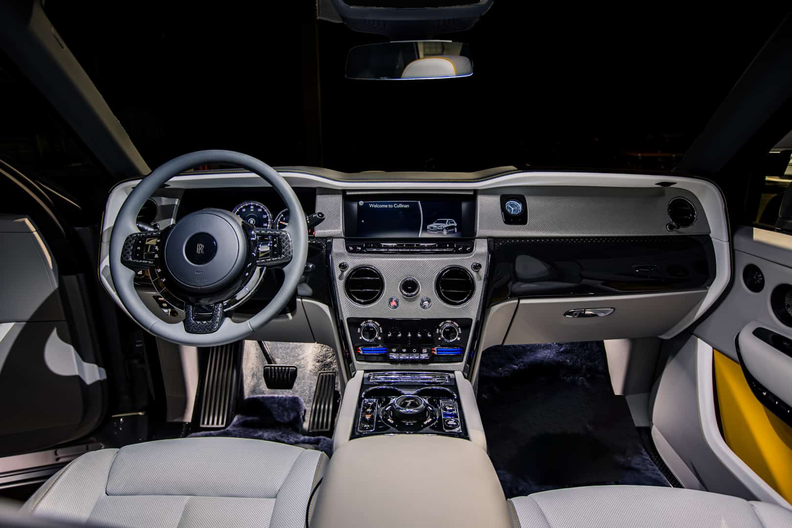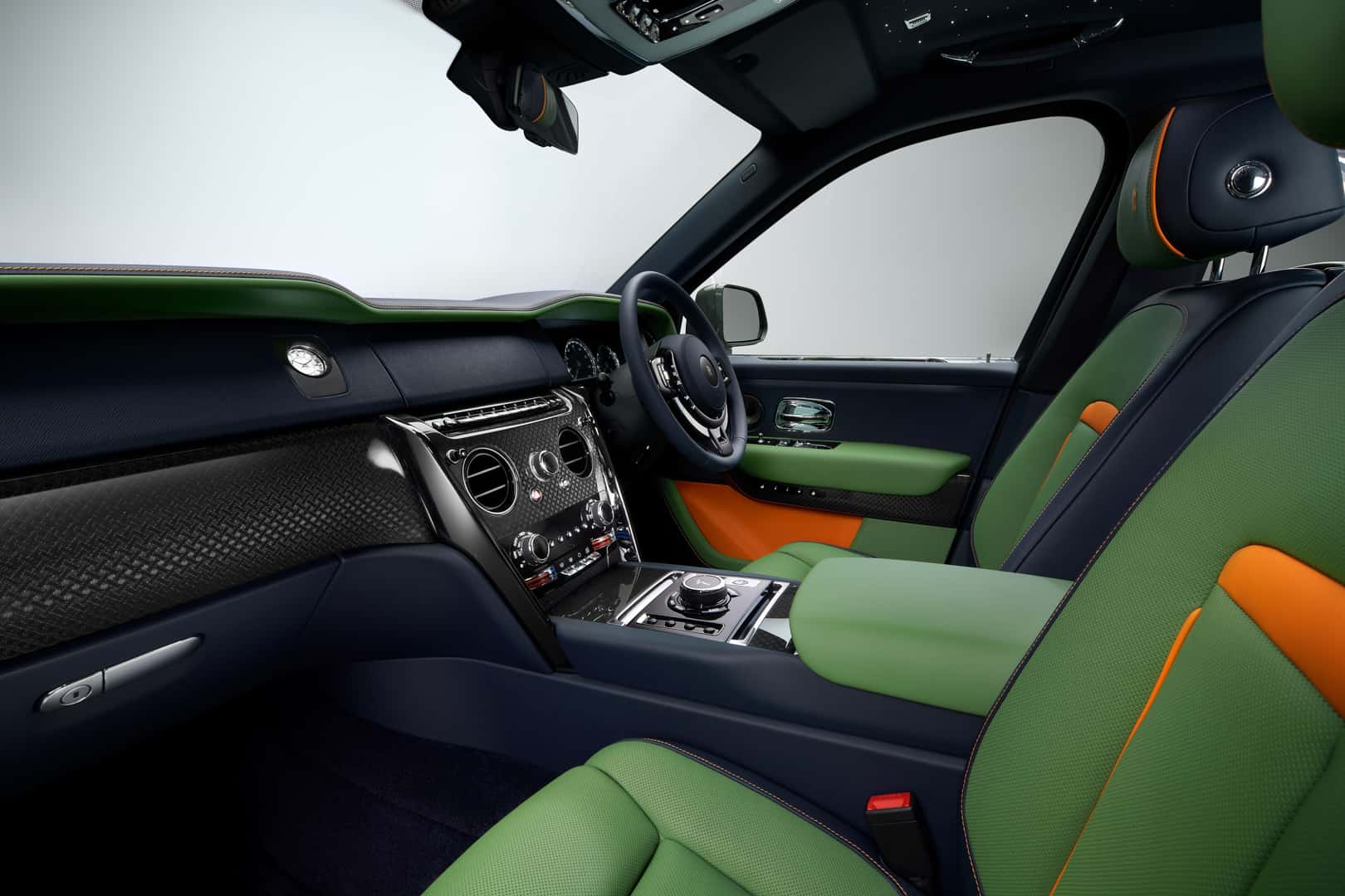 The other bespoke Roller, the Cullinan FuShion, is based on the Cullinan Black Badge and it gets some funkier color choices. Again, it all starts with the interior. One of the two interior options is a combination of Military Green, Navy Blue, and Mandarin and it’s my favorite interior of the bunch. The other interior is a combination of Arctic White and Cashmere Grey but with some Forge Yellow accents. Depending on the interior color choice, four exterior colors can be chosen: Military Green, Burnout Grey, Forge Yellow, and Tempest Grey.