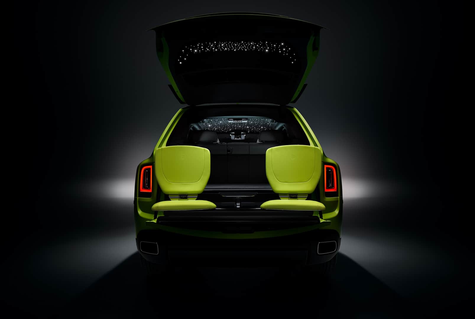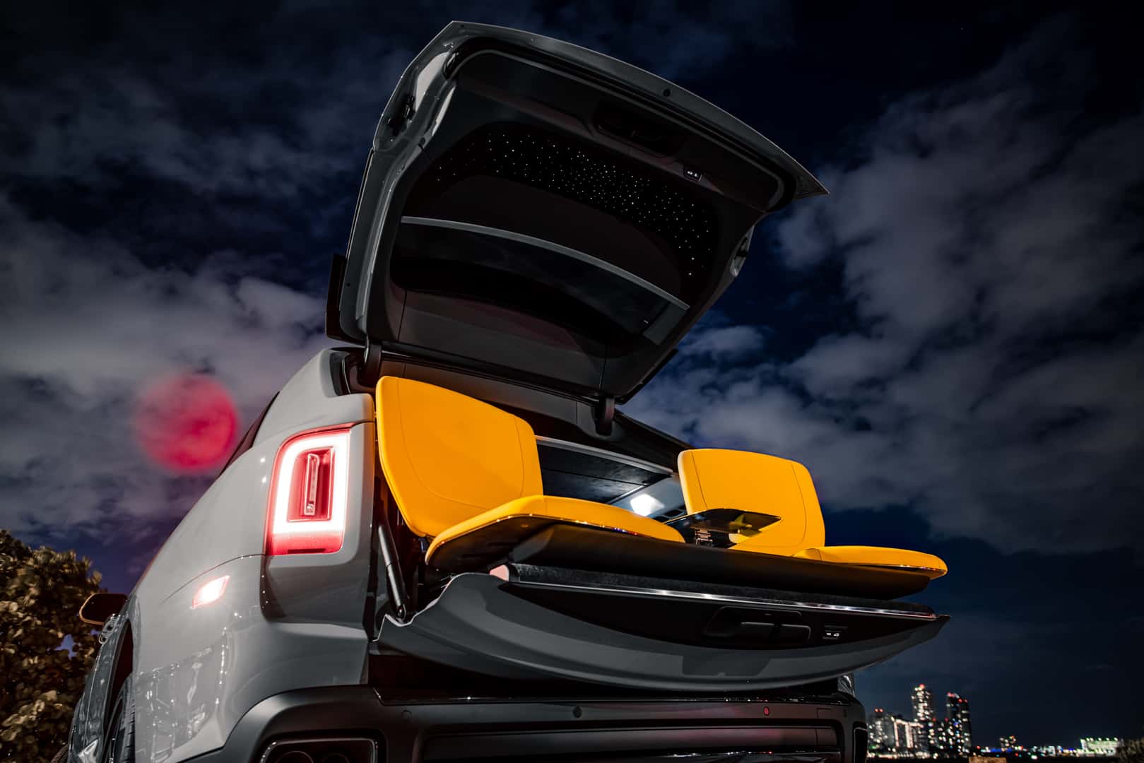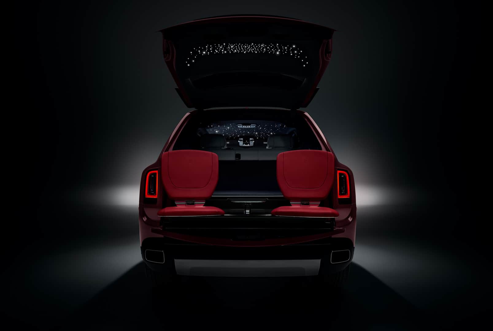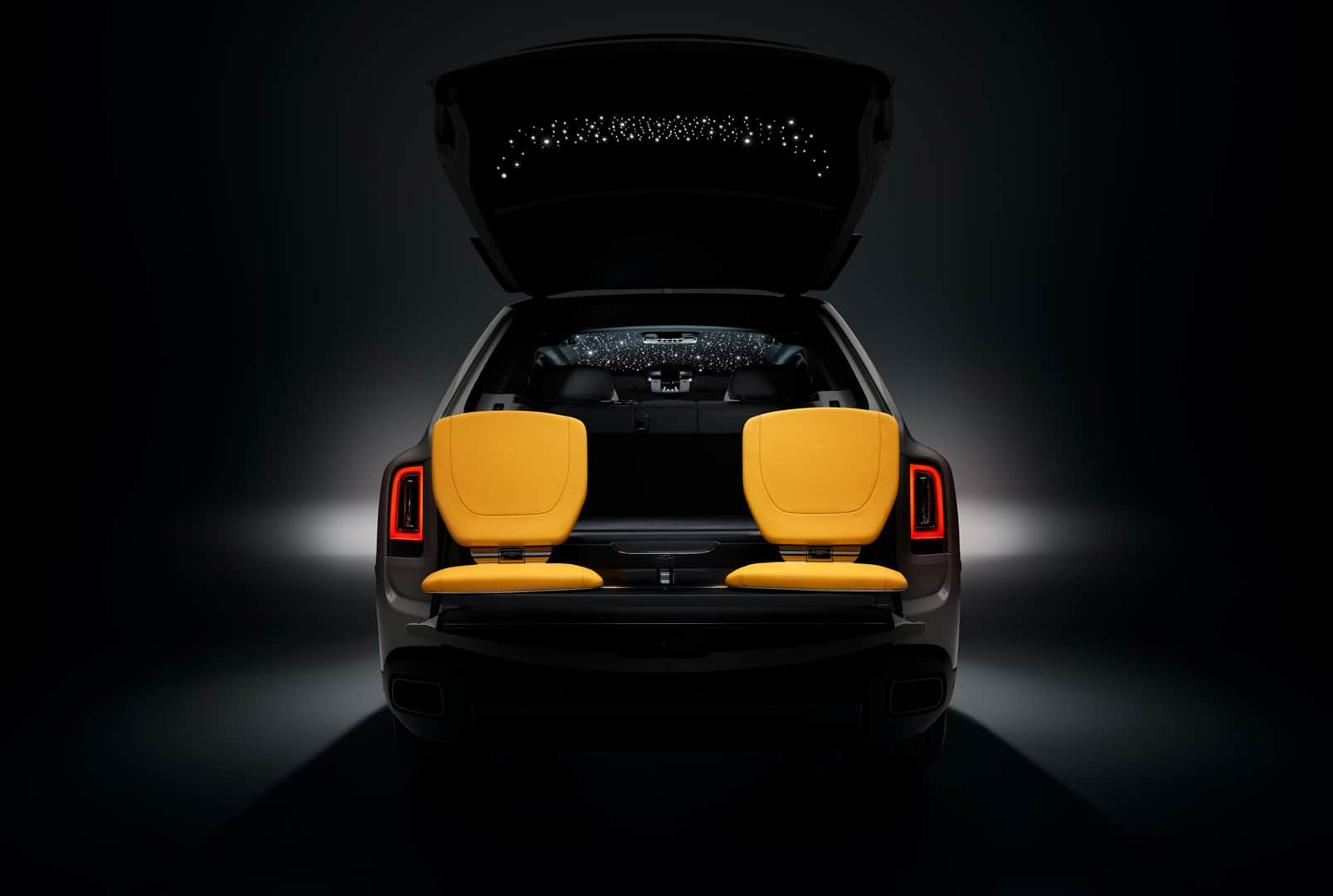 Specifically for these two models, the now-famous Starlight Headliner is extended to the inside of the tailgate, so when passengers are in the rear Viewing Suite—in which two seats pop up from open tailgate—they still have LED “stars” above them. And, of course, a custom luggage set is made to match whichever interior color is chosen.