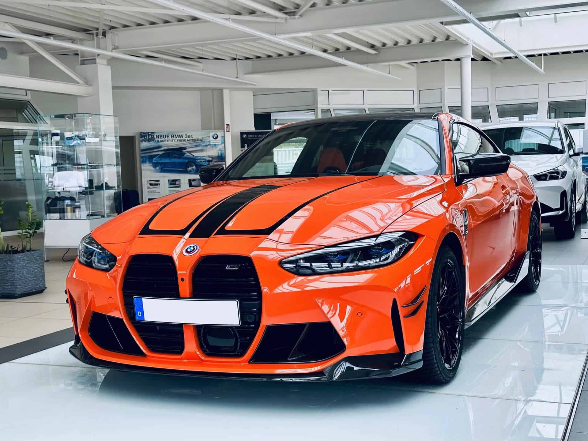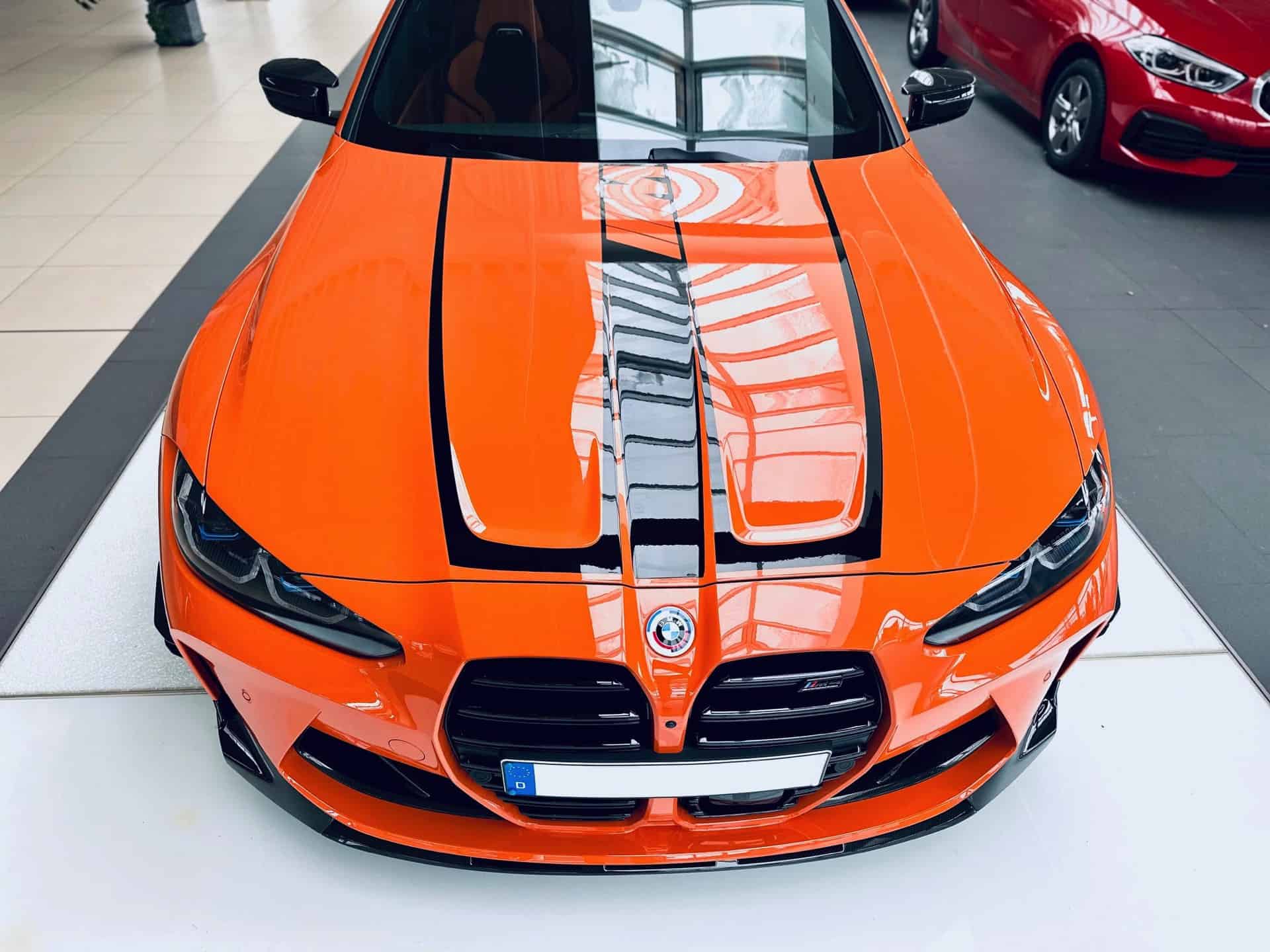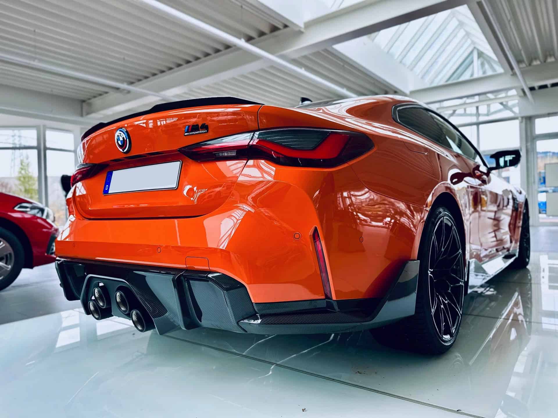 Configuring the M4 G82 can turn out to be an extremely lengthy process since BMW offers extensive customization options to spec your ideal performance coupe. Those looking for a shouty build might take inspiration from this eye-catching specification of a Competition model with rear-wheel drive. Painted in Fire Orange akin to the M3 E92 Lime Rock Park Edition, the high-spec version has the recently introduced black M decals on the hood and trunk lid.