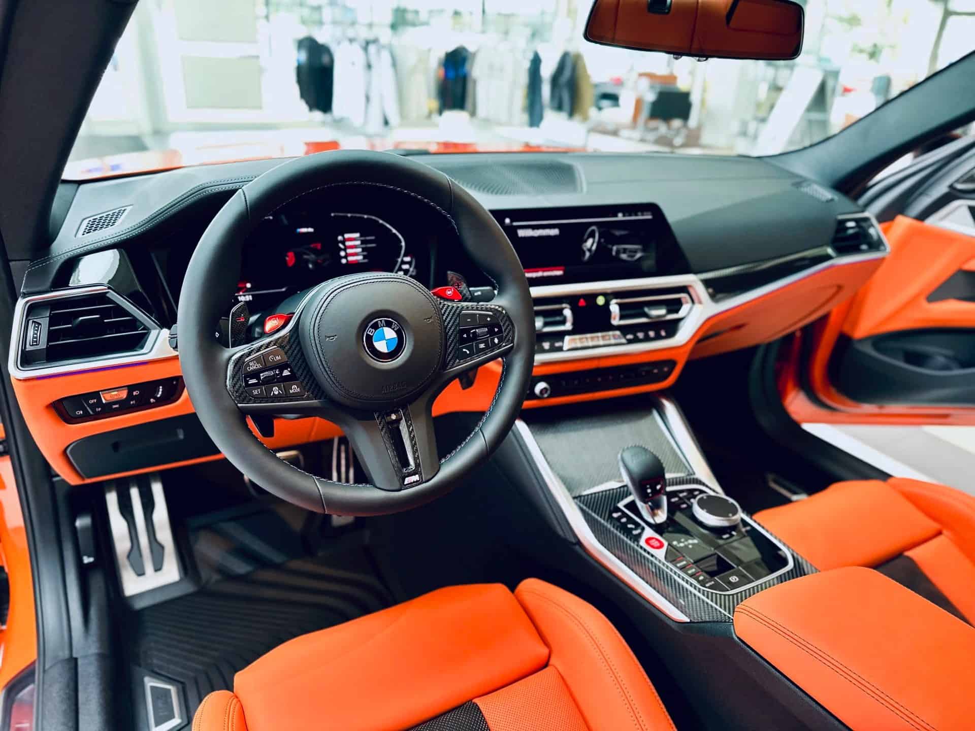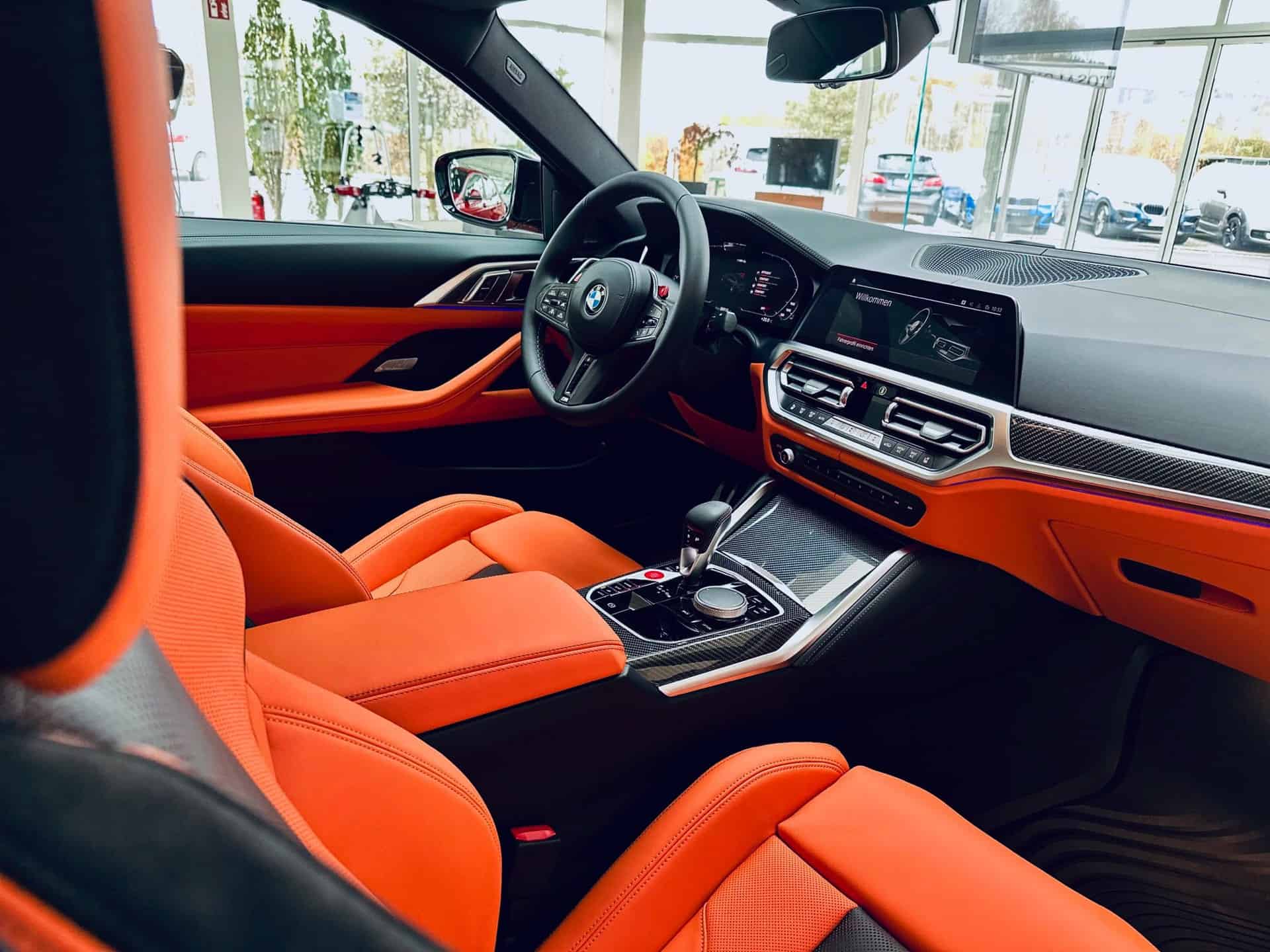 The vibrant color has a correspondent on the inside where the car has been configured with the full Merino leather upholstery in Kyalami Orange with black accents. Those 50 years of M anniversary emblems we saw on the outside are not carried over inside, but that should be fairly easy to sort out. Also missing are the Alcantara upgrades available via the M Performance Parts catalog.