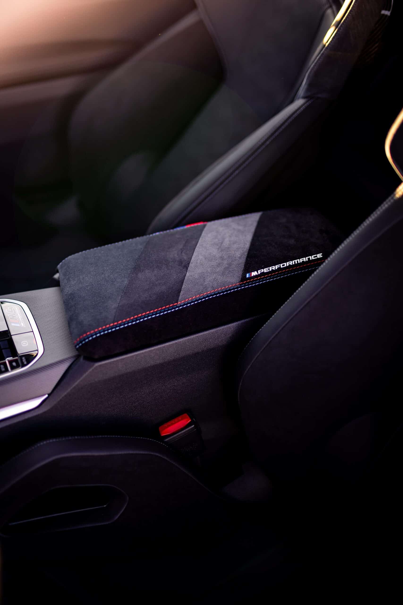 The M4 Competition Coupe for Essen also happens to have a few upgrades on the inside where the shift paddles are made from carbon fiber. In addition, the central armrest has been covered in Alcantara with contrasting stitching by using the three M colors. Other niceties include the carbon bucket seats, M door pins, and M Performance branding for the door sills bathed in carbon, which has also been used extensively for the dashboard and steering wheel.