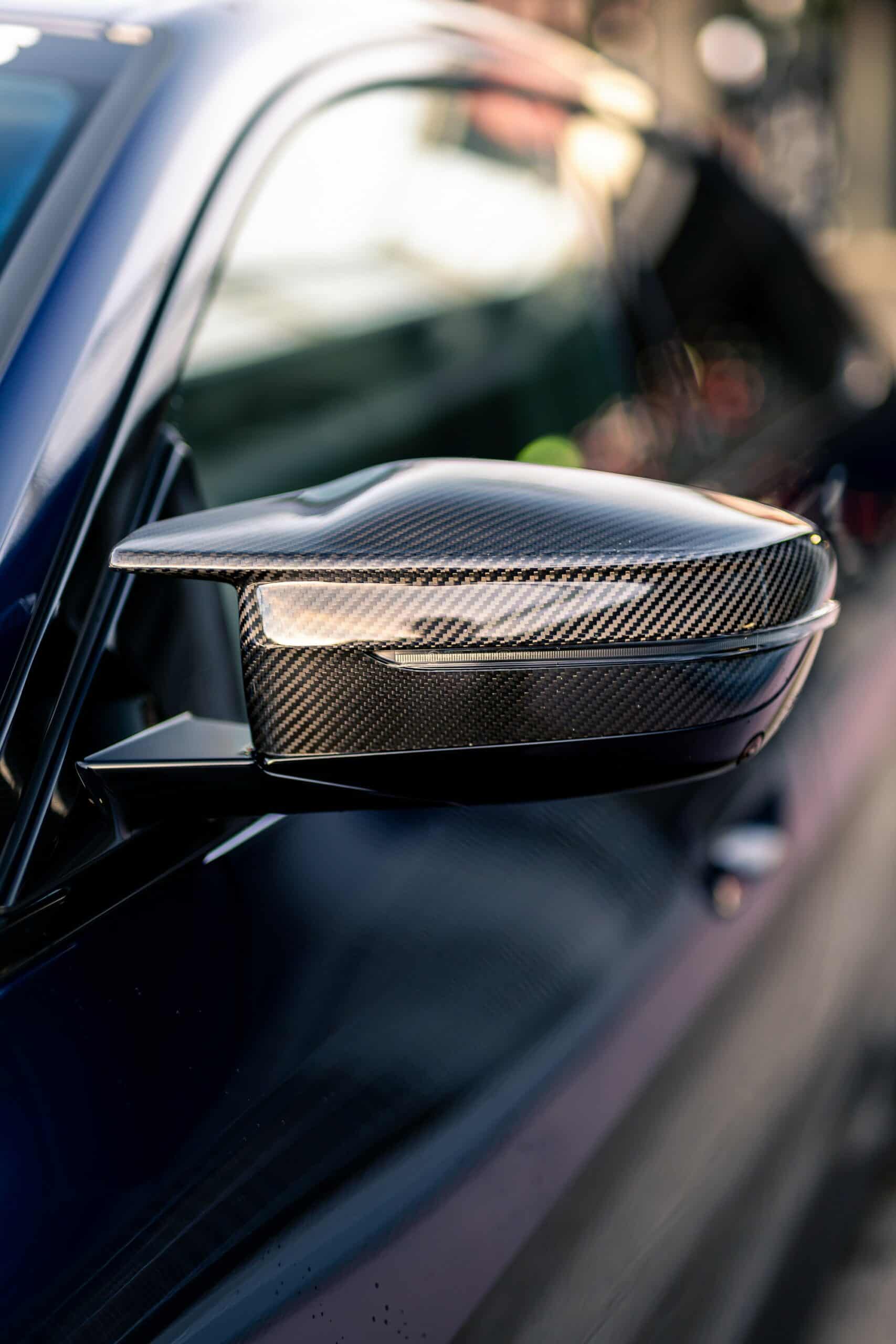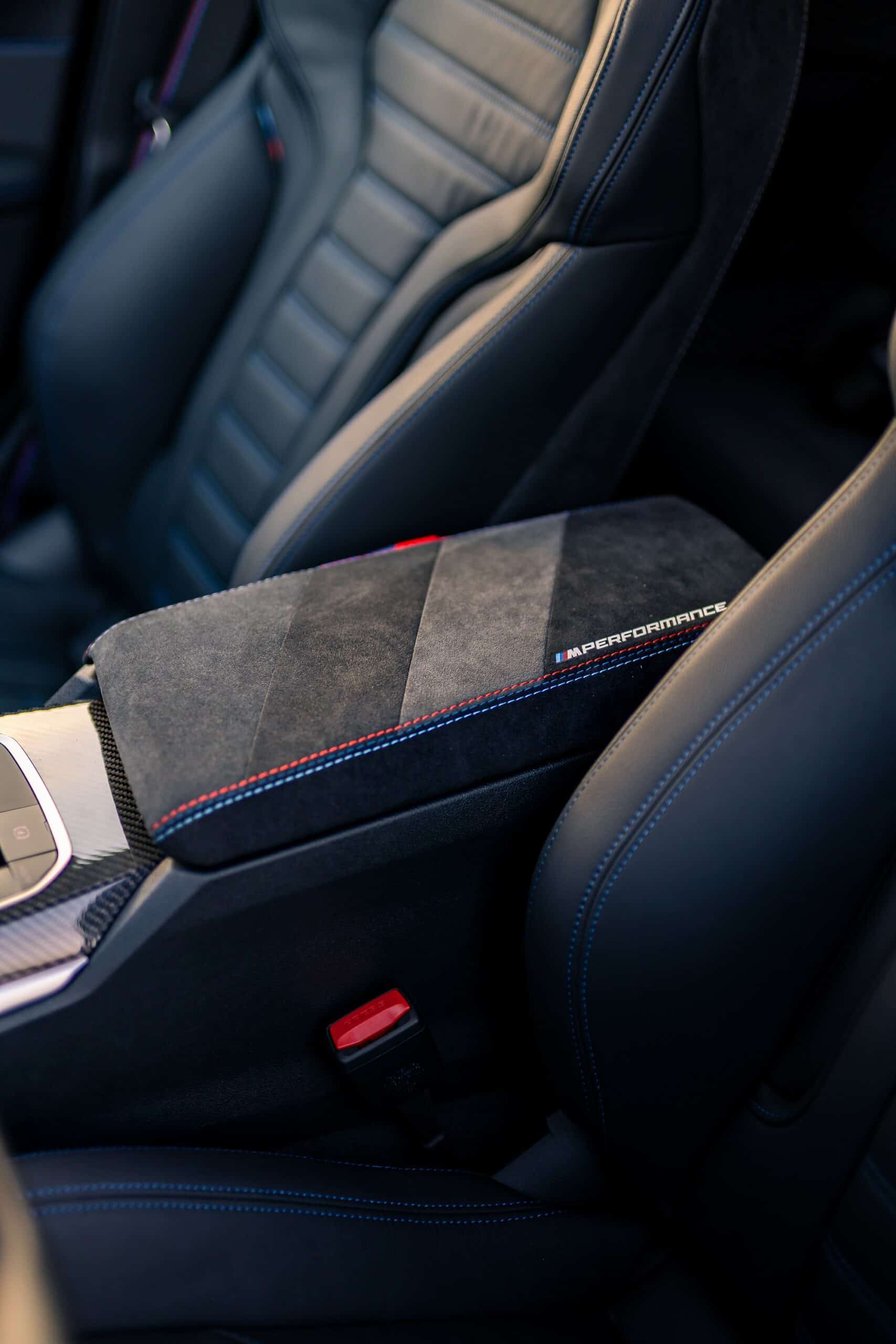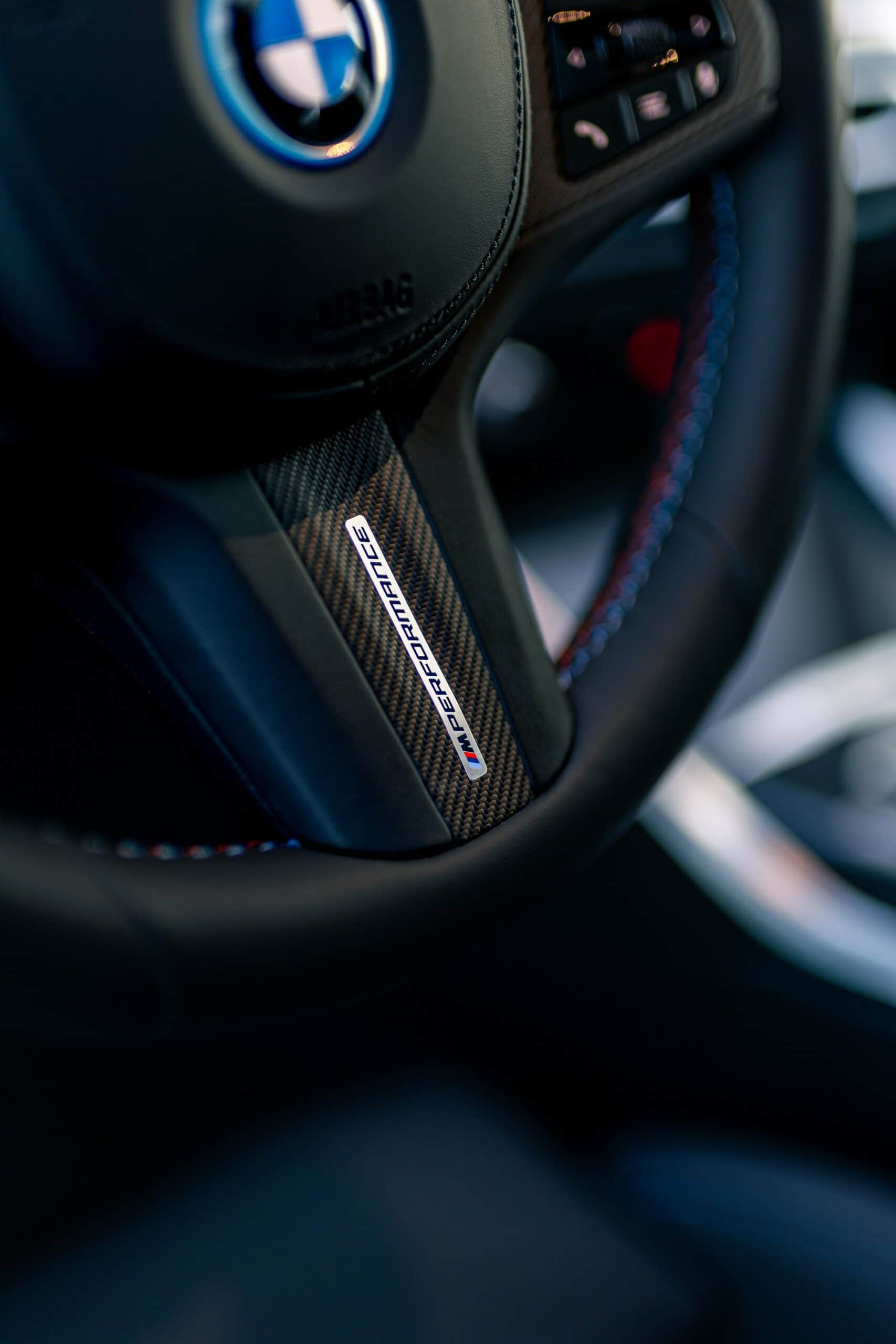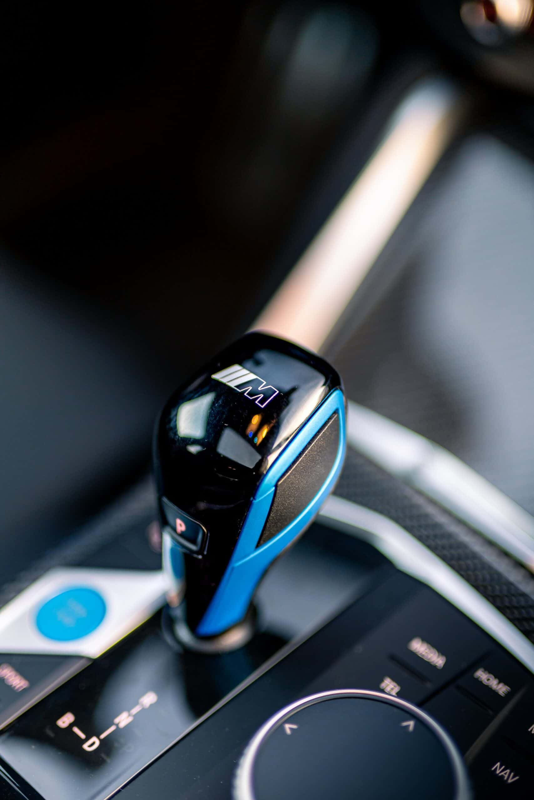 Compared to a regular i4 M50, the showcar has an M Performance steering wheel with a carbon spoke, Alcantara on the sides, and contrasting stitching in the three well-known color. The gear lever has carbon fiber inserts to go along with the other trim pieces on the inside made from the same durable material.