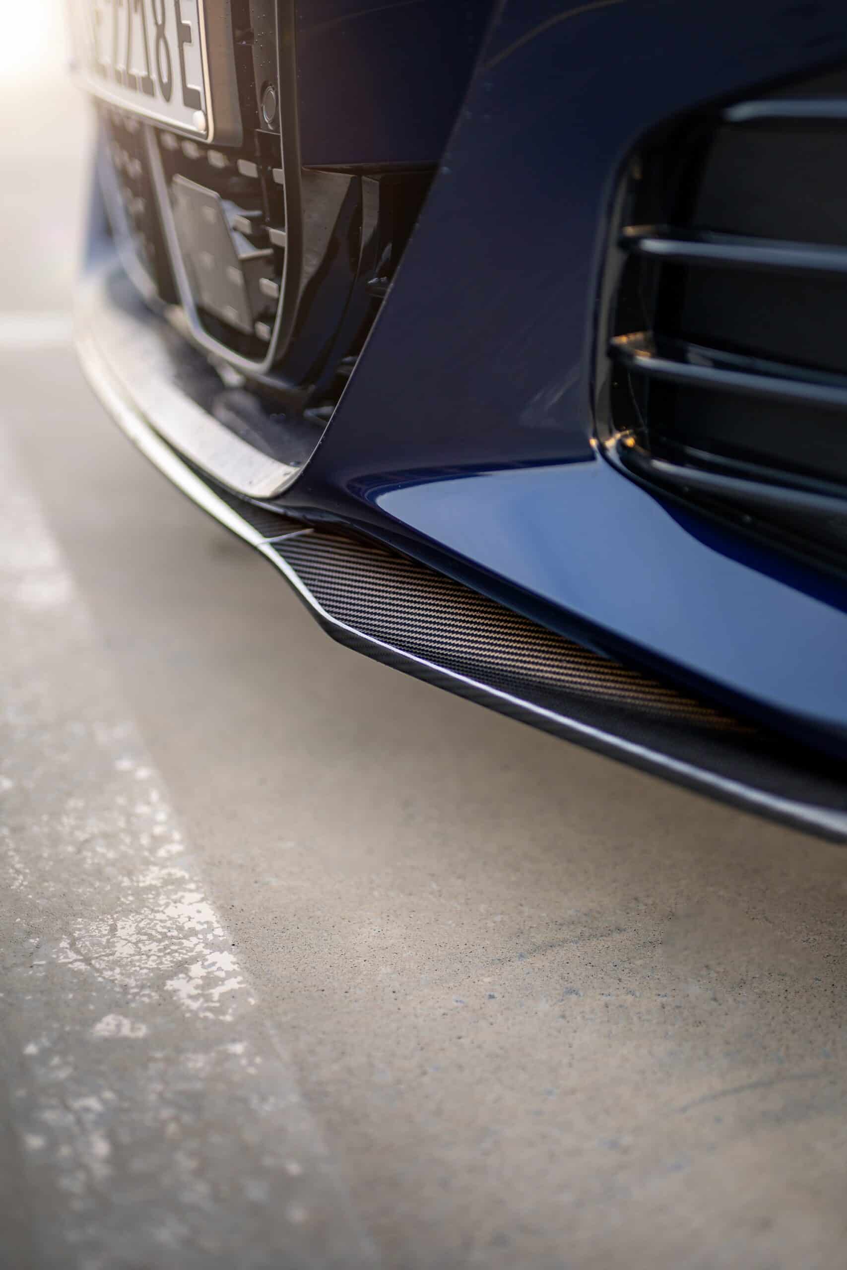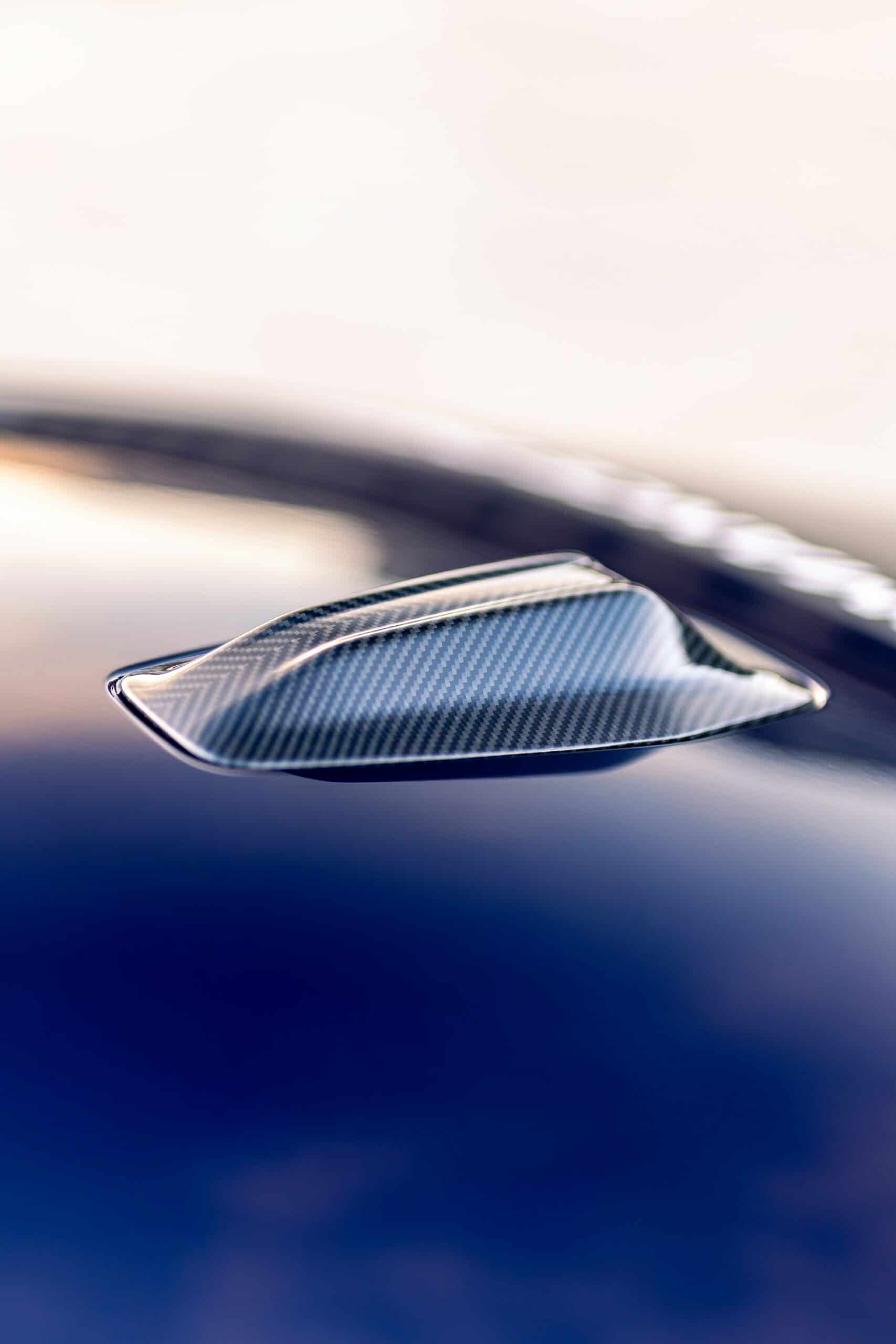 The electric gran coupe also wears an Individual paint by having an attractive Tanzanite Blue finish complemented by carbon fiber exterior accents. The front spoiler lip and tailgate-mounted spoiler are made from the lightweight material, and so are the side mirror caps and rear diffuser. BMW even covered the shark fin antenna in carbon fiber, along with the air inlet trims at the front and the rear apron.