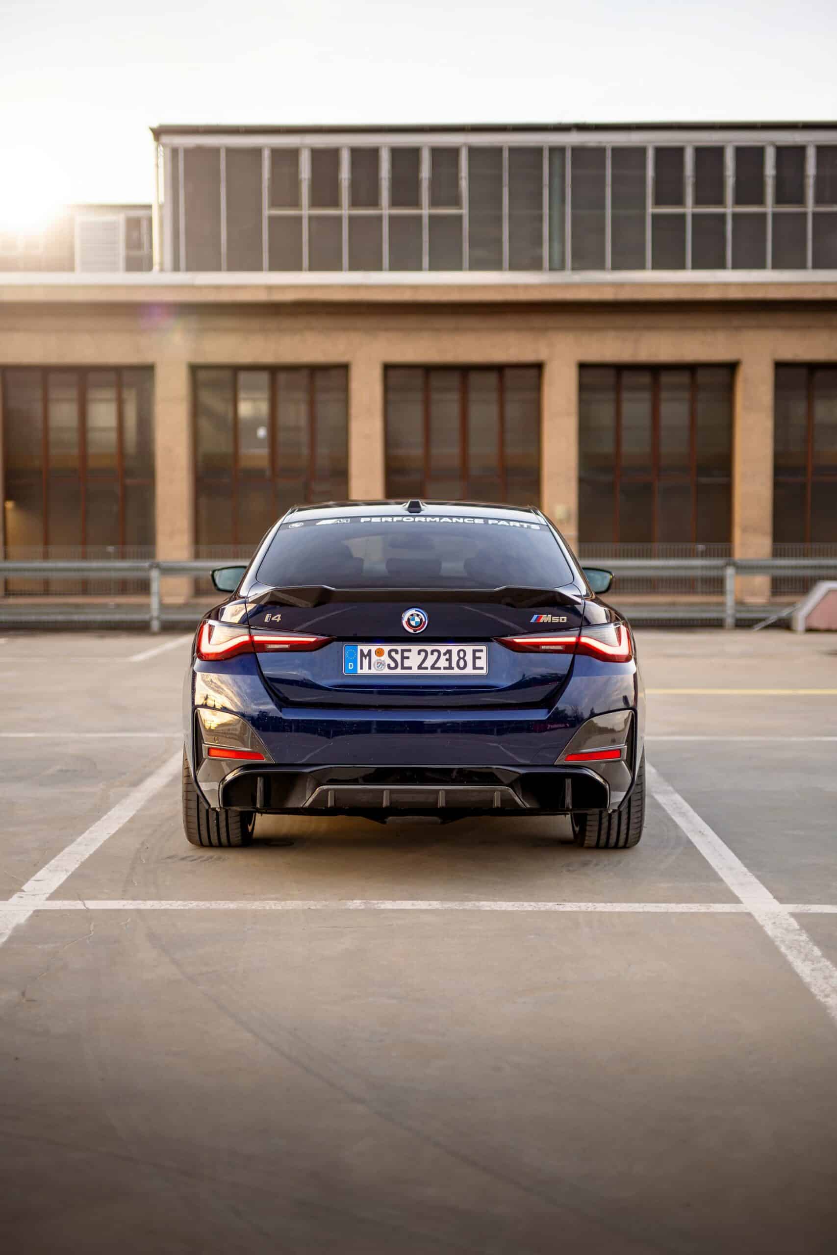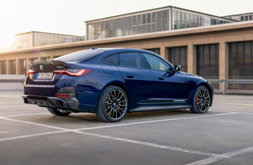 The i4 M50 wears a side decal in Frozen Black and sits on optional diamond-cut 20-inch alloy wheels (868 M) with a Night Gold and Black finish. The vintage Motorsport emblems have replaced the regular BMW roundels as a final reminder the M division celebrates its 50th anniversary in 2022. The “world’s most powerful letter” also adorns the valve stem caps while “M Performance Parts” stickers are noticeable on the upper part of the windshield and rear glass.