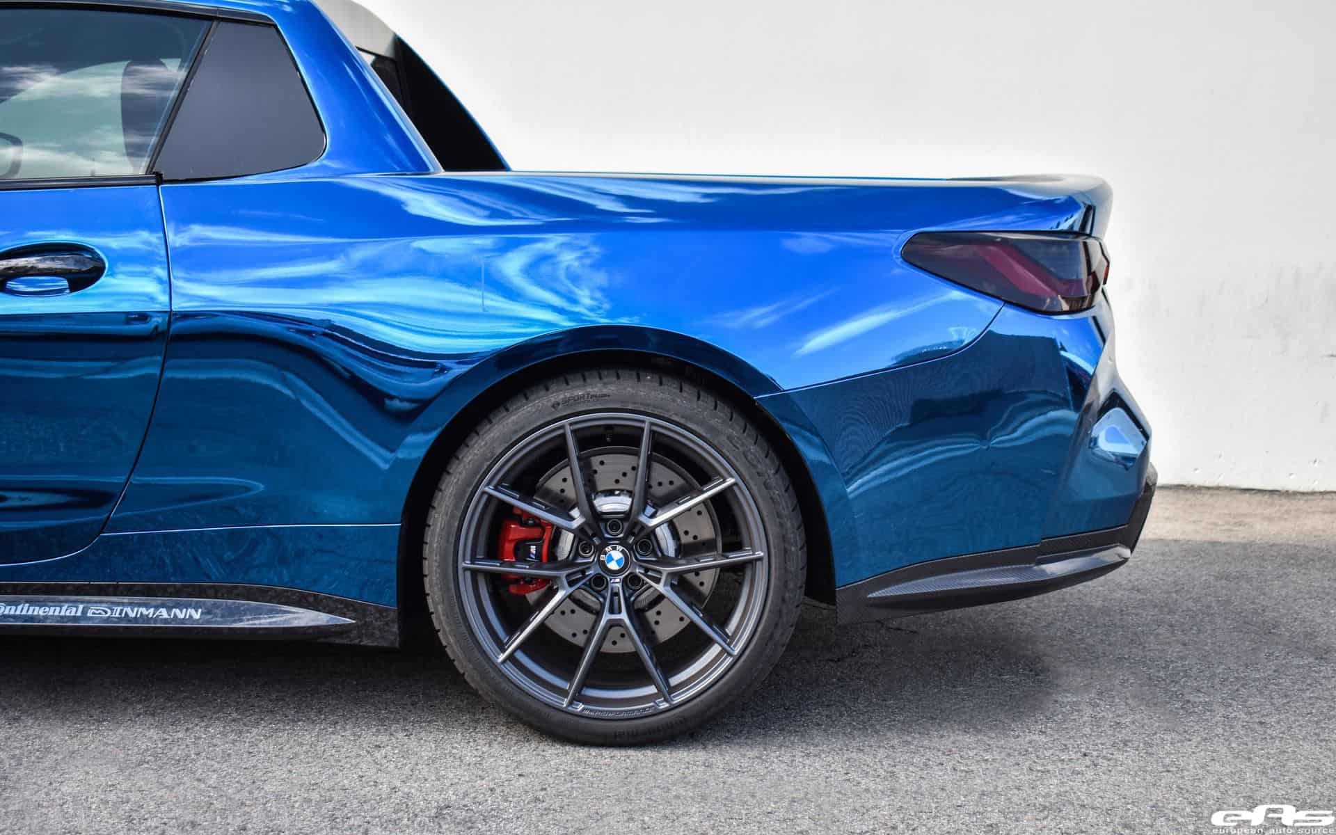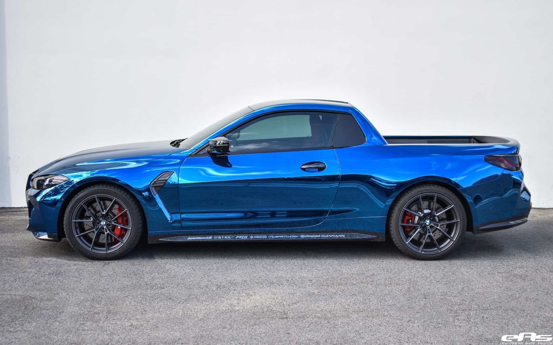 Someone had the idea to take a brand-new G82 BMW M4 and turn it into a sports ute, similar to the performance utes of Australia. The job only took around three weeks, to make sure it was done in time for SEMA, and it’s surprisingly impressive, hilarious, and fantastic. The build was done by Dinmann, who did it to show off their carbon fiber line of parts and very few things catch eyeballs like a reflective blue BMW M4 ute.