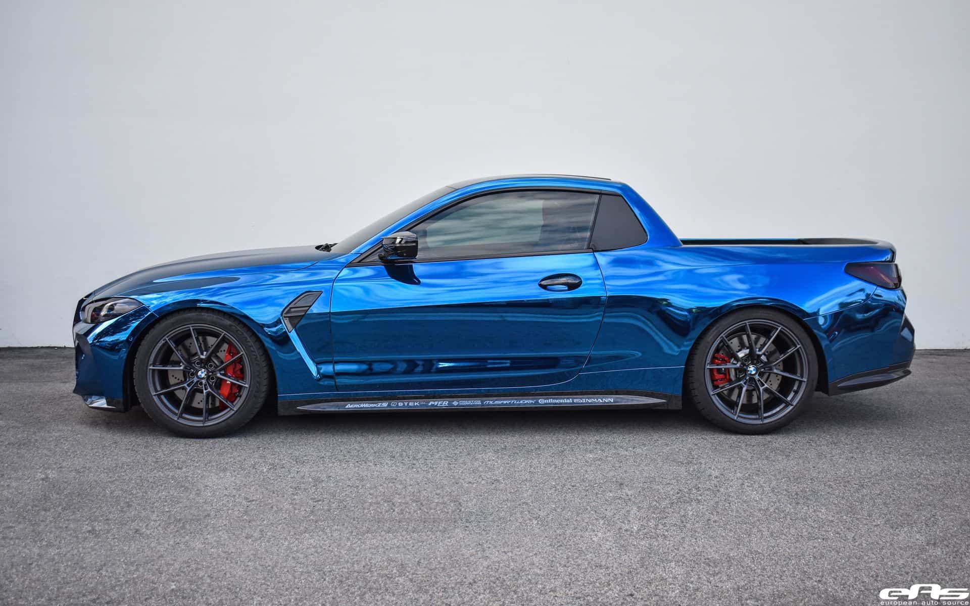 Someone had the idea to take a brand-new G82 BMW M4 and turn it into a sports ute, similar to the performance utes of Australia. The job only took around three weeks, to make sure it was done in time for SEMA, and it’s surprisingly impressive, hilarious, and fantastic. The build was done by Dinmann, who did it to show off their carbon fiber line of parts and very few things catch eyeballs like a reflective blue BMW M4 ute.