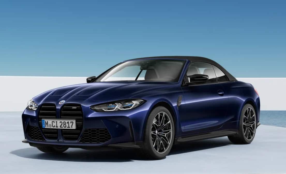 Whoever configured this car went to town with the options by choosing to combine the Tanzanite Blue paint with a Kyalami Orange leather interior. We only see the Competition-spec M4 Convertible xDrive with the roof up, but the contrast between the body and upholstery is more evident when the top is down. Unlike the M3 Sedan and M3 Touring, the M4 models have yet to switch to the iDrive 8. It should happen at some point in 2023.