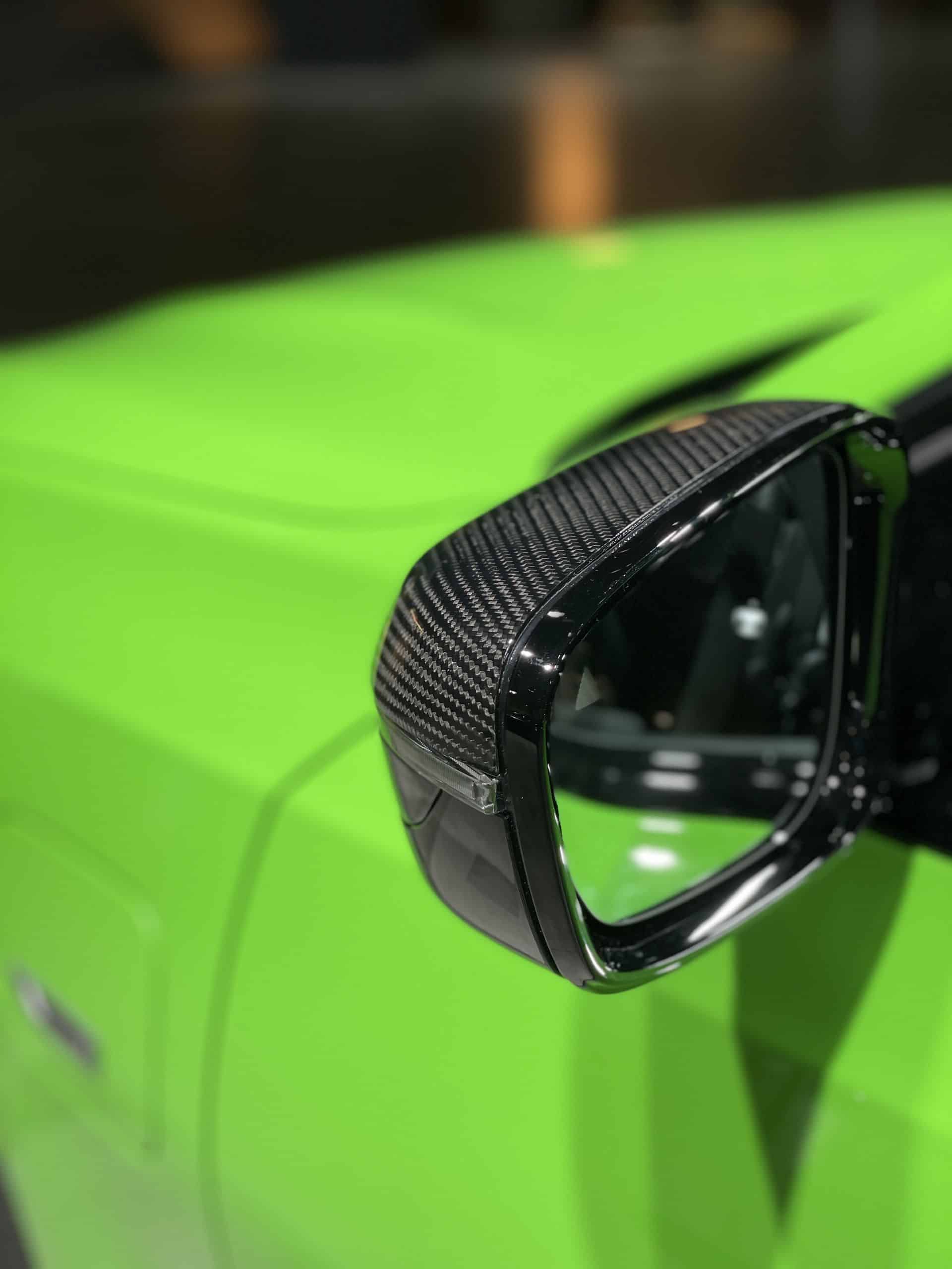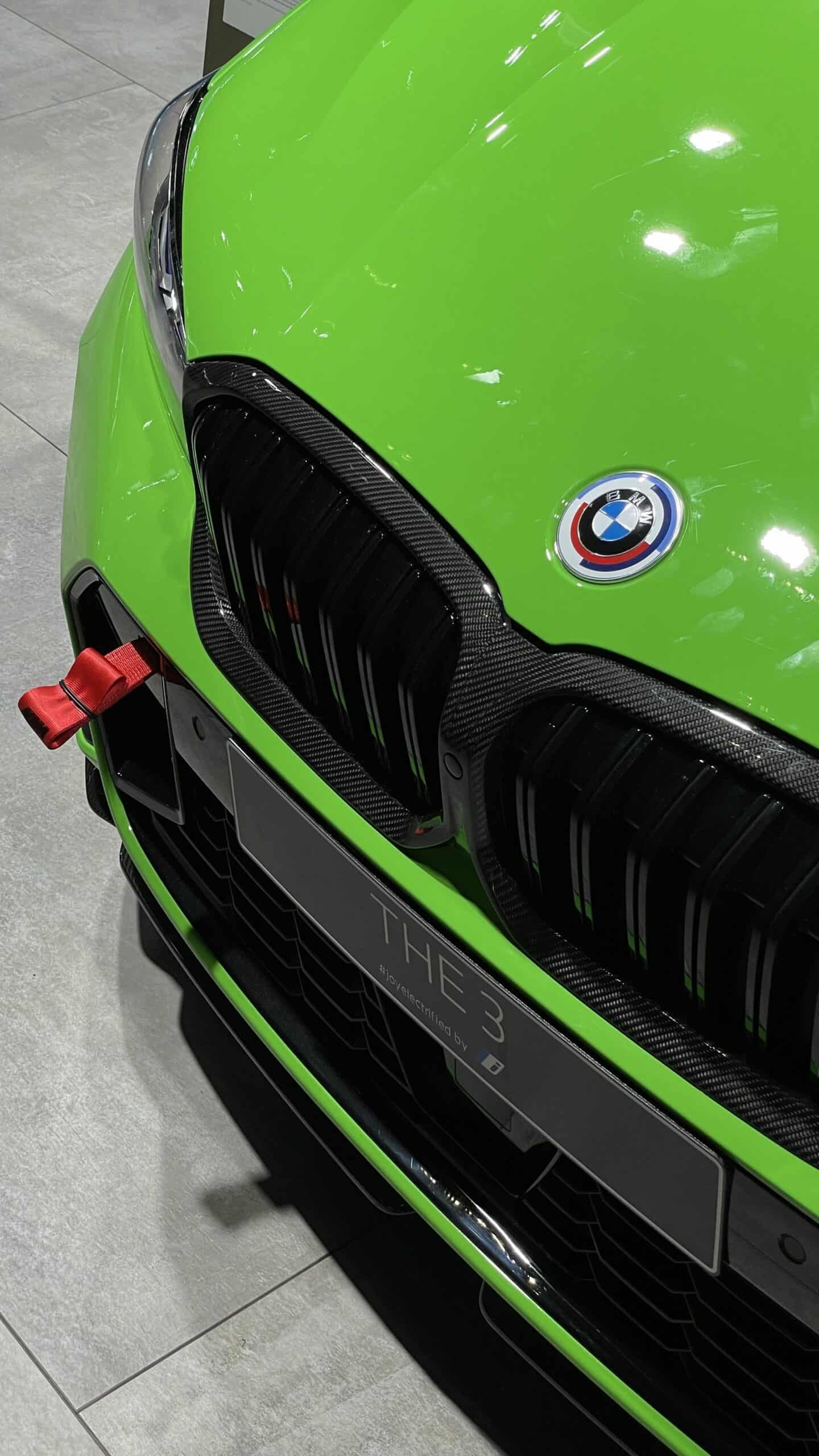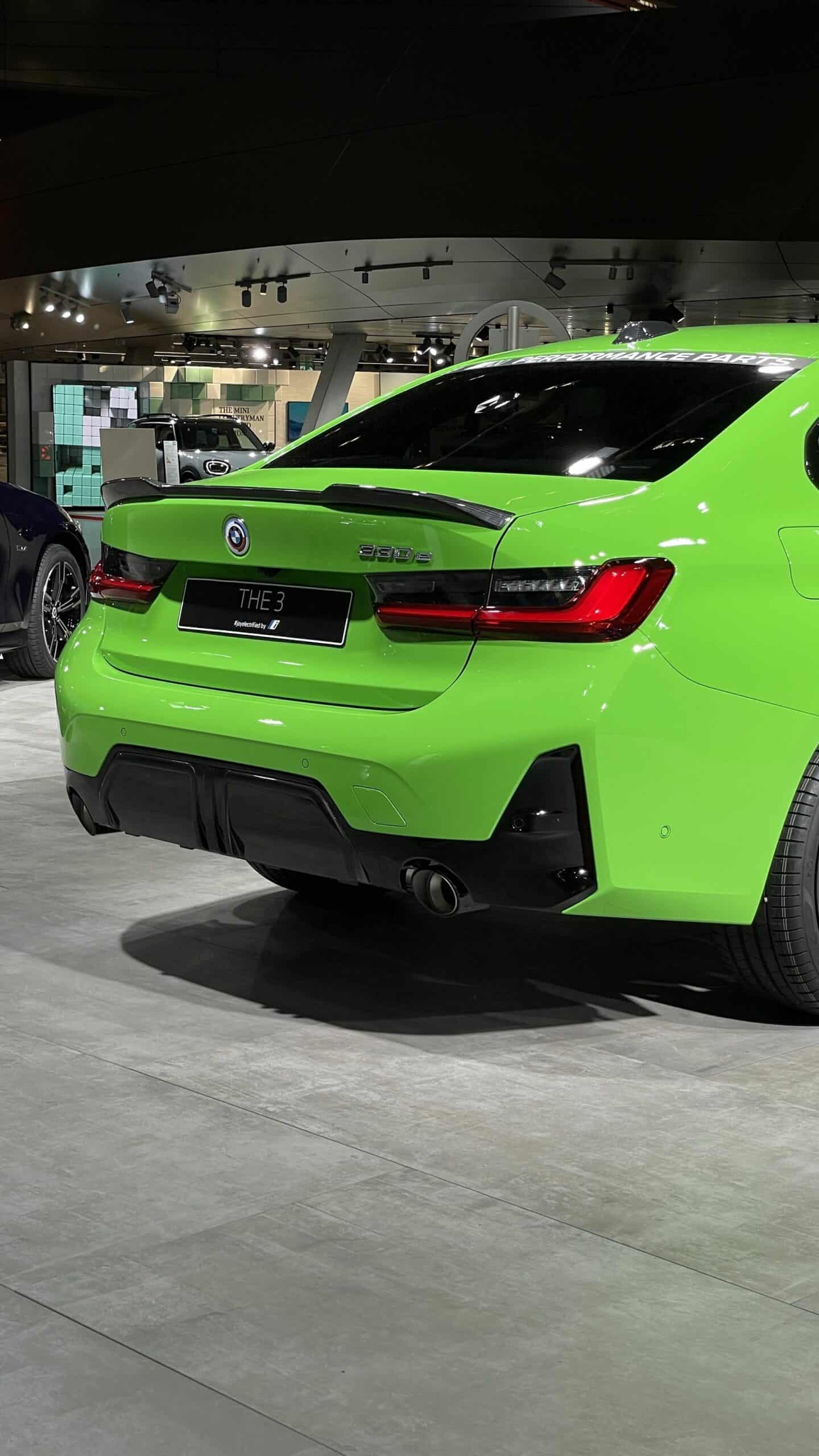 This BMW 330e is fitted with a full suite of M Performance parts, which gives it carbon fiber grille trim, a carbon fiber rear lip spoiler, a carbon fiber front splitter, and new black wheels. So it looks like a sportier, M Performance car and not a sensible hybrid. But making it look even sportier and angrier is its Verde Mantis paint.