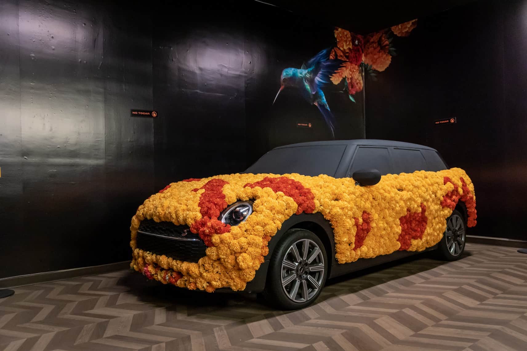 Mind you, those are artificial Mexican marigolds, and you’ll notice the remaining exposed areas of the car were given a matte black look. MINI showcased the unique Clubman in the performance-oriented S specification with a mural of a hummingbird in the background. It’s a representative bird of the Mexican culture and around 57 species can be found locally.