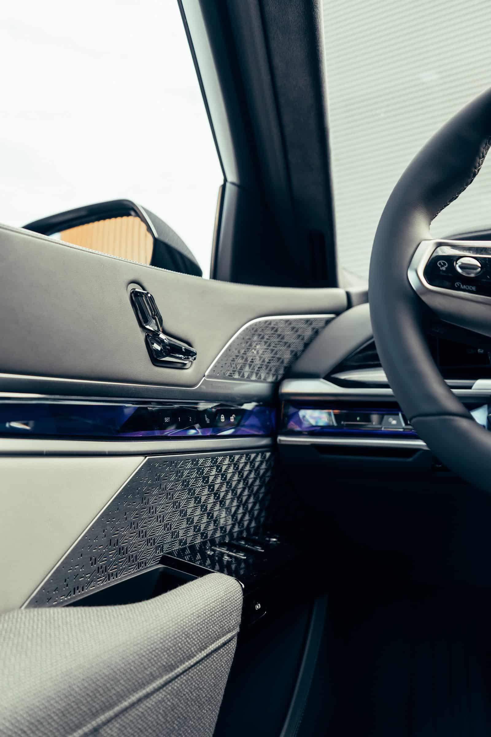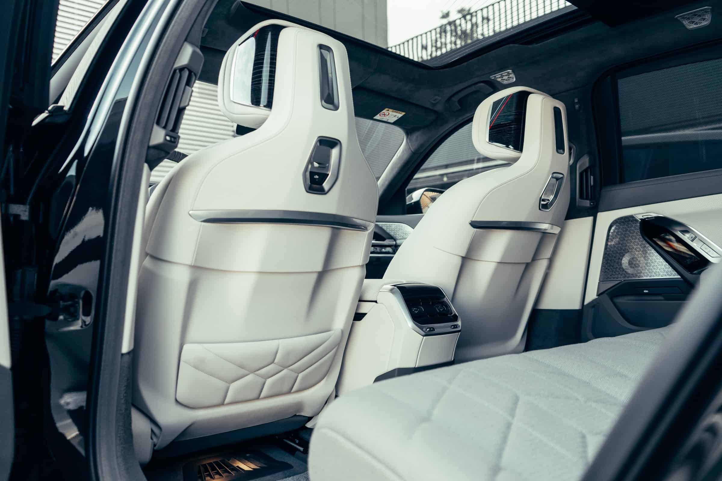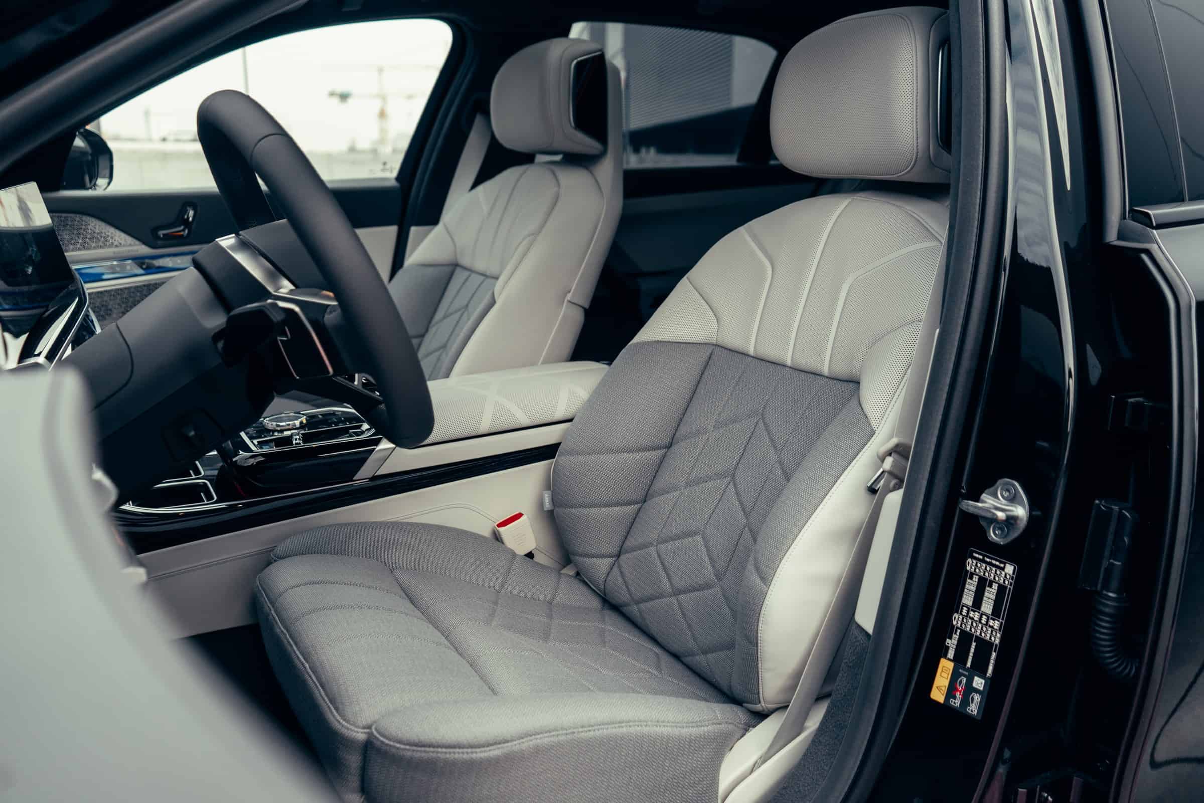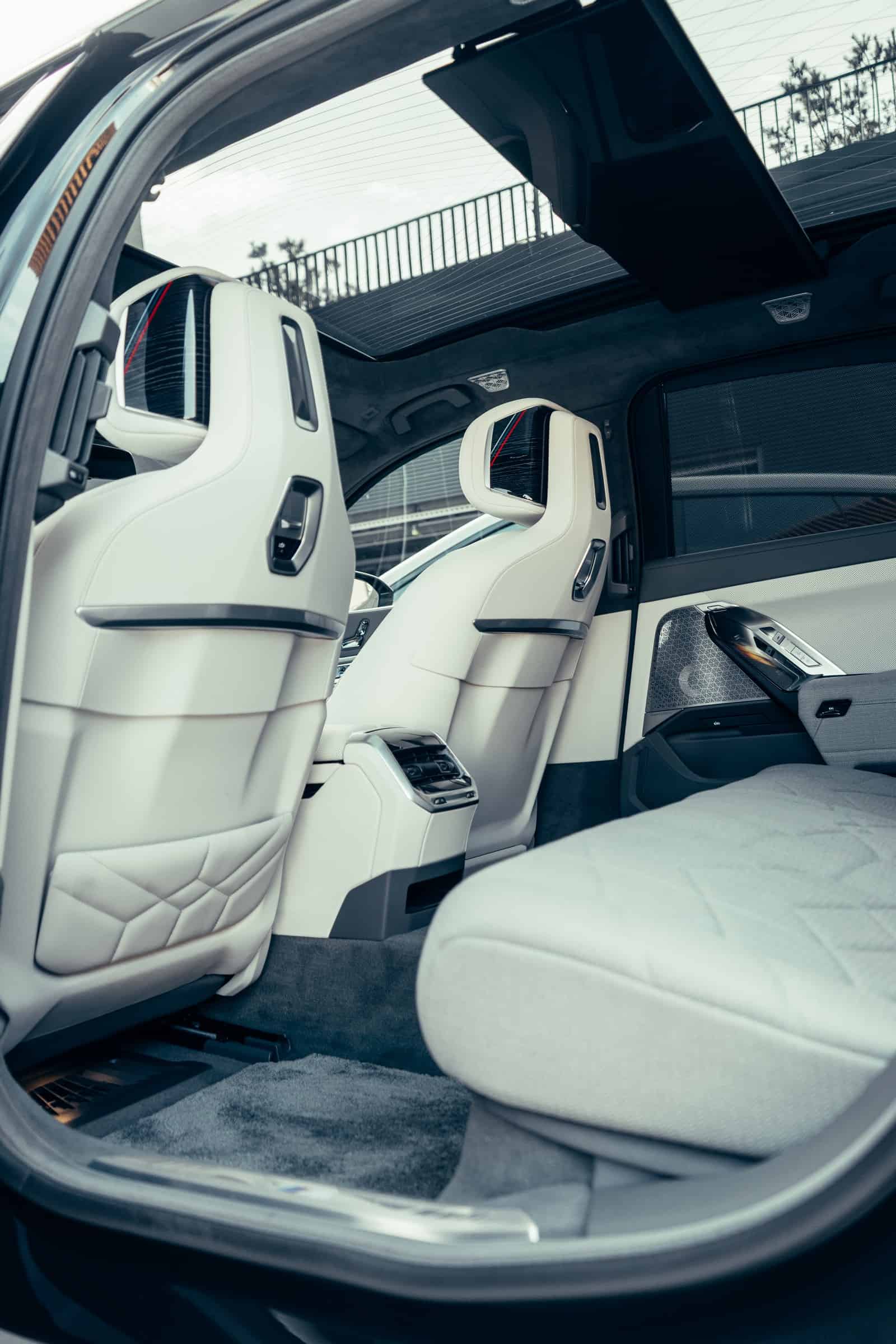 The all-black exterior with its dark 21-inch wheels is contrasted by the light-colored leather in the upper section of the seats while the lower sections have a darker cashmere cloth. Yes, a €200,000 car has cloth on the inside as BMW believes the Smoke White/Atlas Grey upholstery with wool/textile surfaces provides a “new haptic quality to the interior and combines sustainability with luxury.”