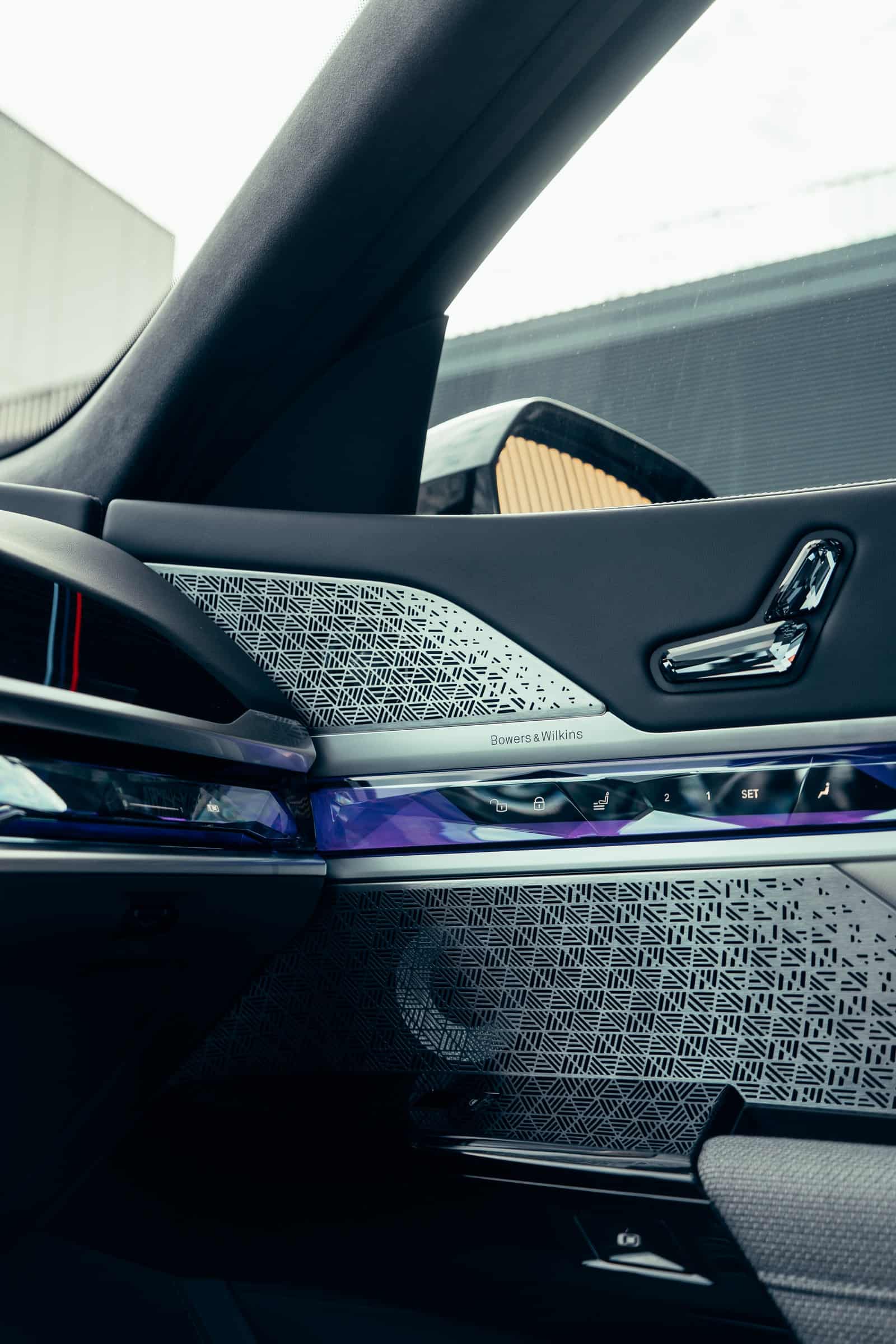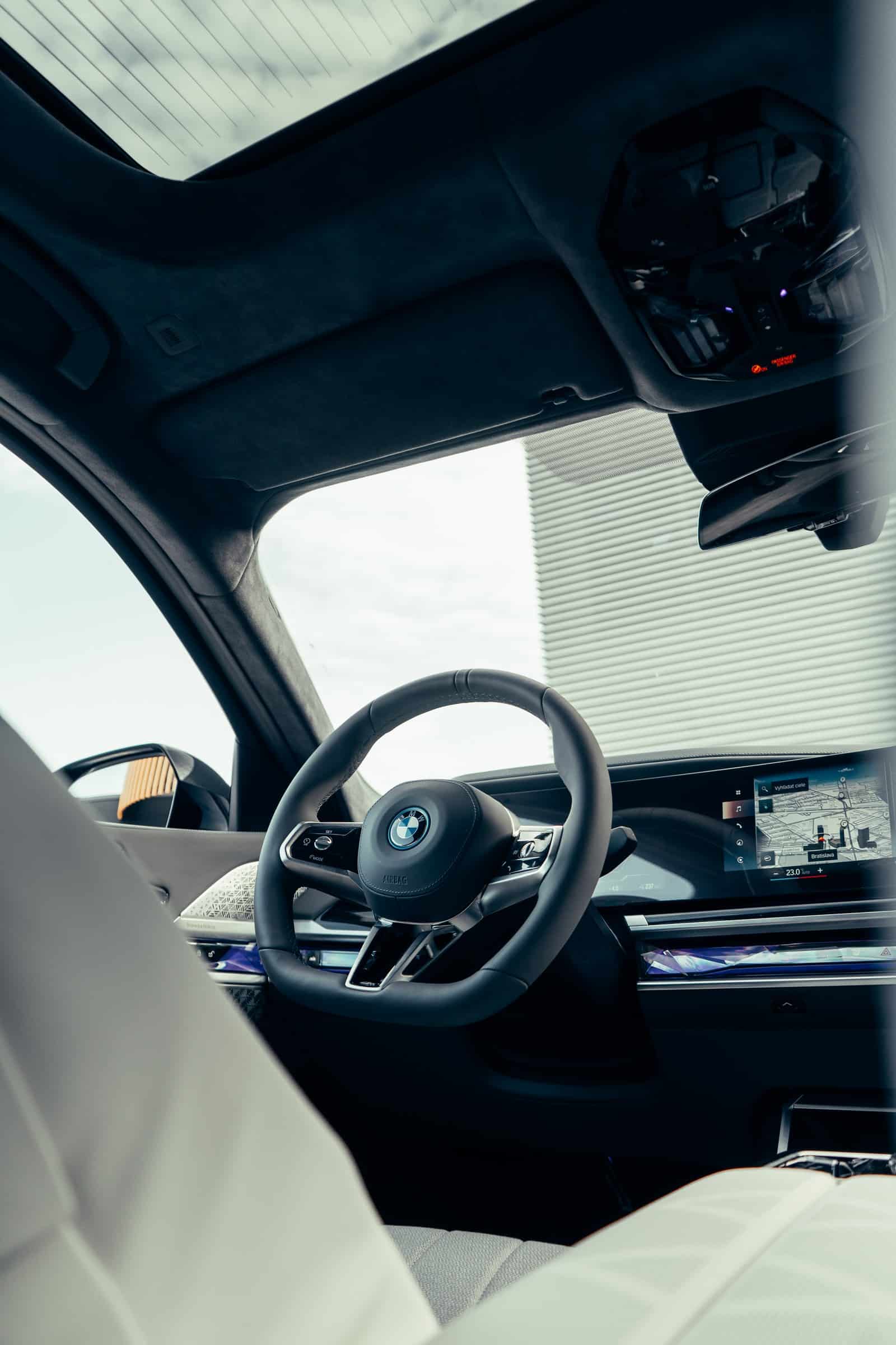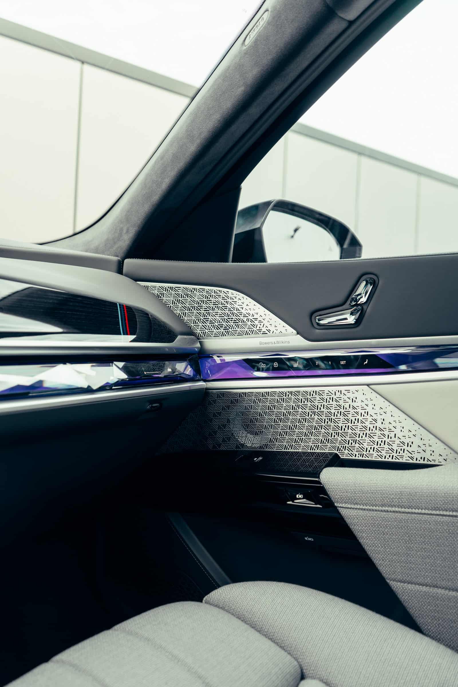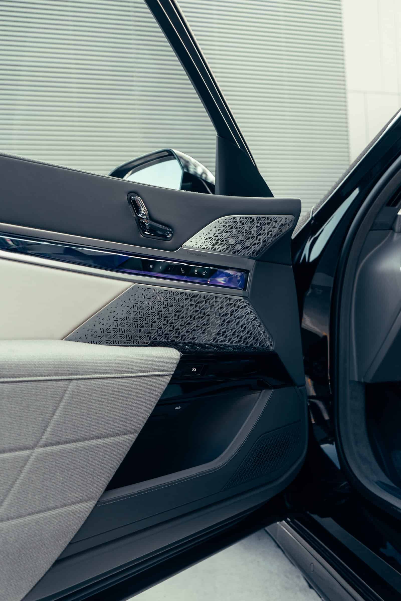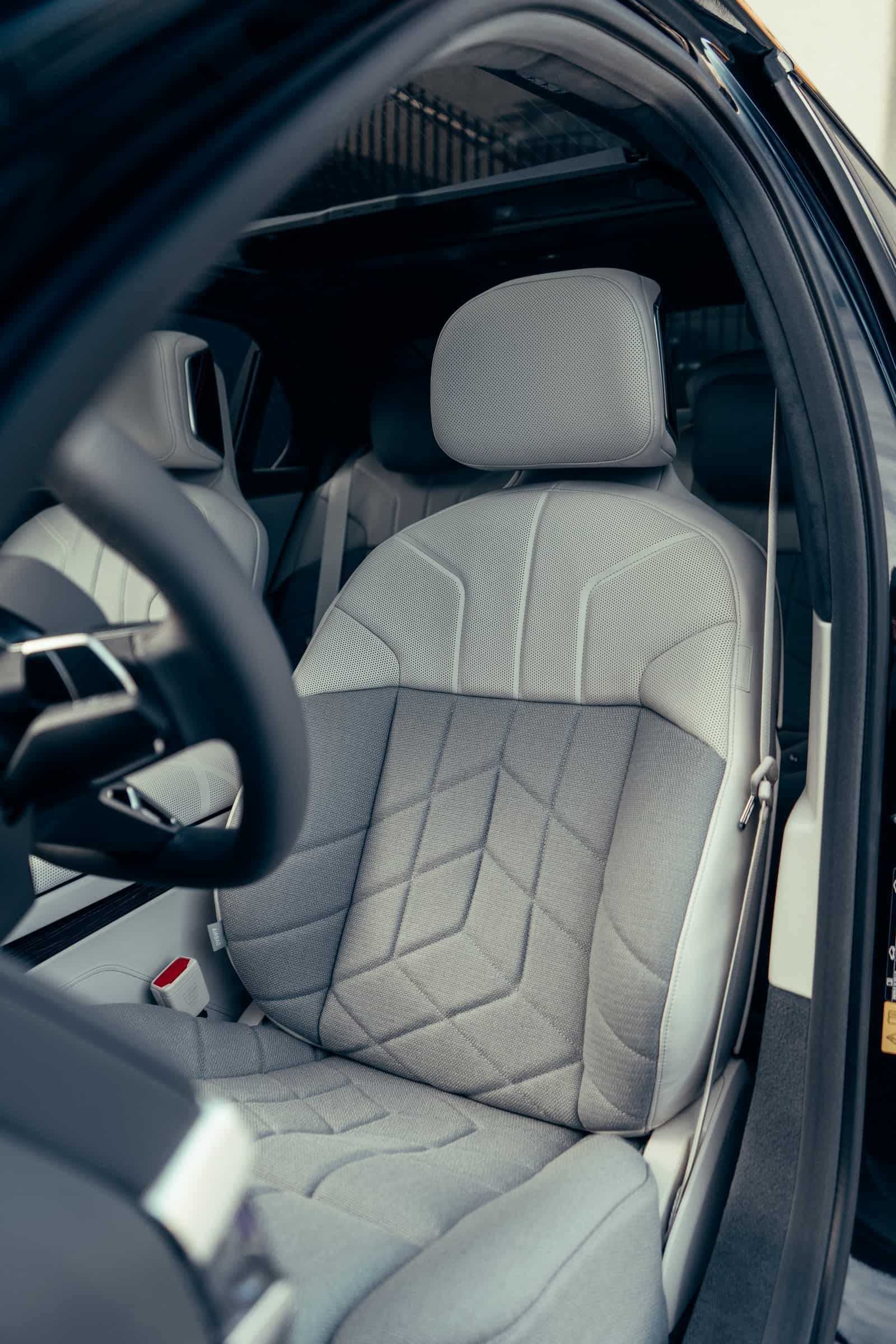 The all-black exterior with its dark 21-inch wheels is contrasted by the light-colored leather in the upper section of the seats while the lower sections have a darker cashmere cloth. Yes, a €200,000 car has cloth on the inside as BMW believes the Smoke White/Atlas Grey upholstery with wool/textile surfaces provides a “new haptic quality to the interior and combines sustainability with luxury.”