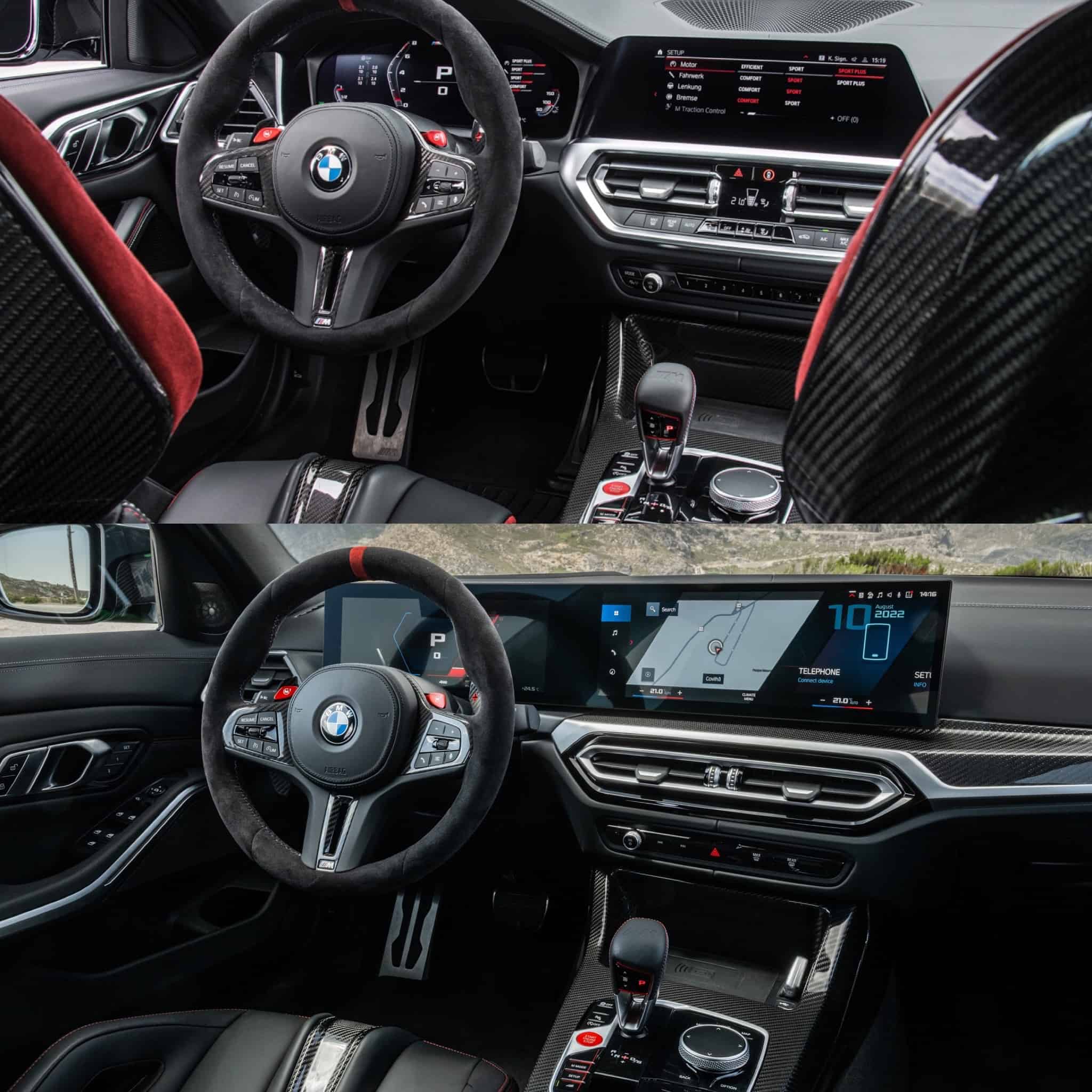 BMW really copy and pasted here. Aside from the back seats being obviously different, as the M3 CS is a sedan with a rear bench seat and the M4 CSL is a coupe with a rear seat-delete, the two cars are virtually identical inside. They both have black and red color schemes as their only options, both have Alcantara steering wheels, and both have carbon fiber sport buckets. The M4 CSL can be optioned with manually-adjustable racing buckets and the M3 CS cannot. And the M3 CS’ seats have more accents, but they’re mostly the same. Even the center armrest, or lack thereof, is the same.