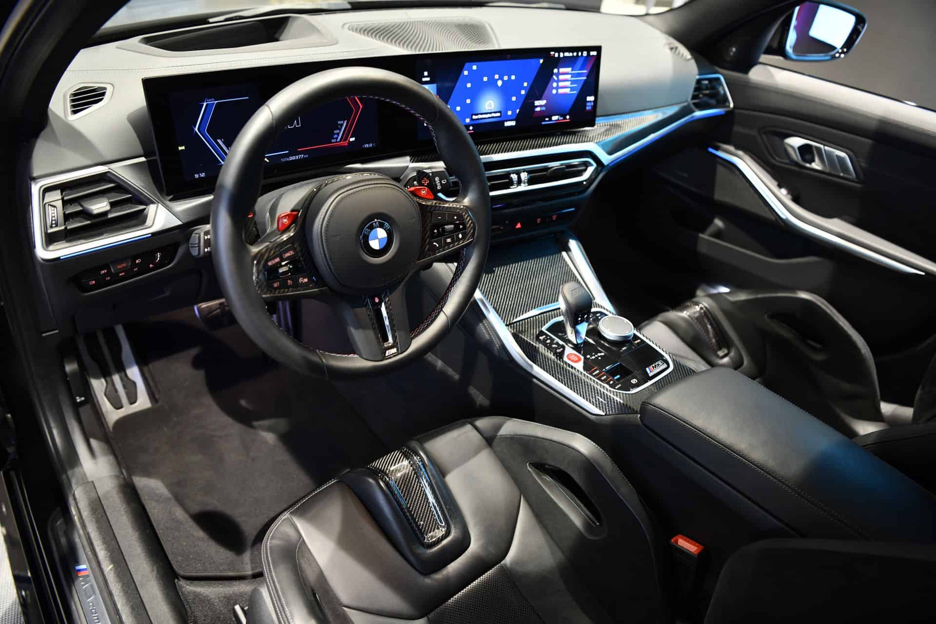 The M3 Touring’s murdered-out theme with black wheels, brake calipers, and kidney grille continues inside where the optional carbon front bucket seats come in dark Merino leather. Much like the exterior has carbon fiber accents, the lightweight material has been generously applied on the center console, dashboard, and steering wheel.