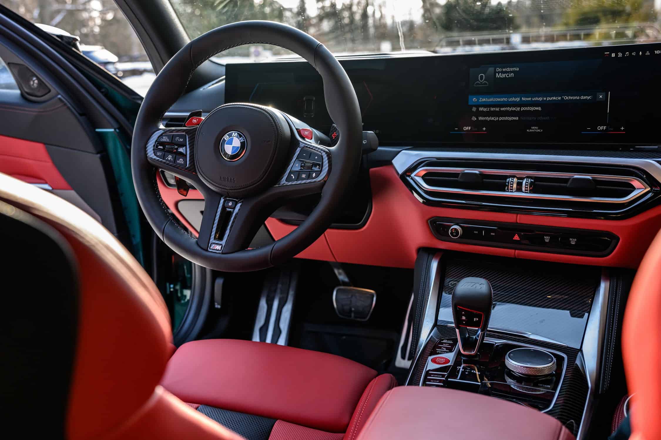There are only two photos depicting the interior, finished in striking Fiona Red leather with loads of carbon fiber on the steering wheel and dashboard. You won’t find an M3 Touring with a six-speed manual since the super wagon comes exclusively as a Competition model with xDrive. This setup echoes the AMG C63 Estate and Audi RS4 Avant as the other two high-performance German family cars also have two pedals and four-wheel drive.