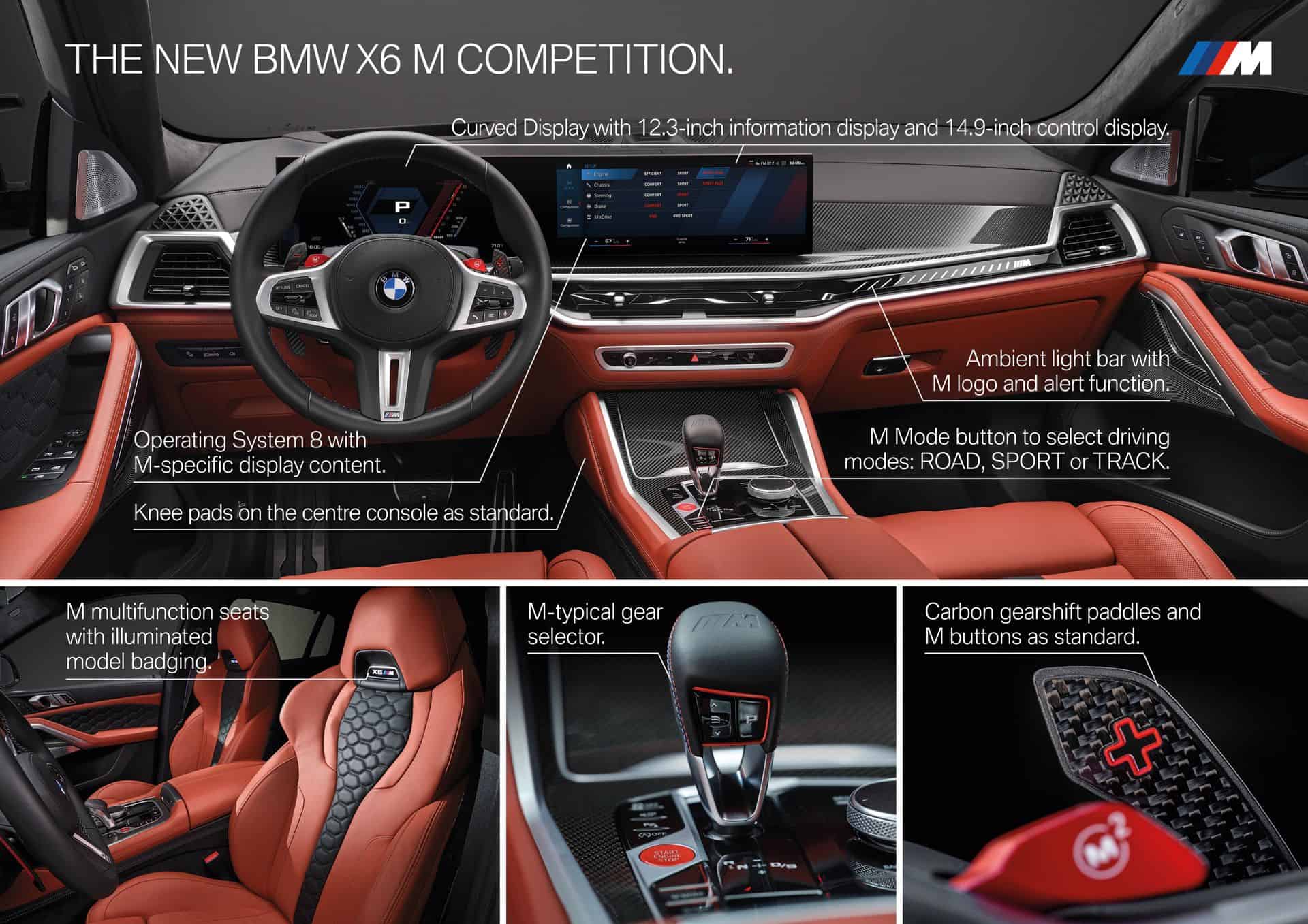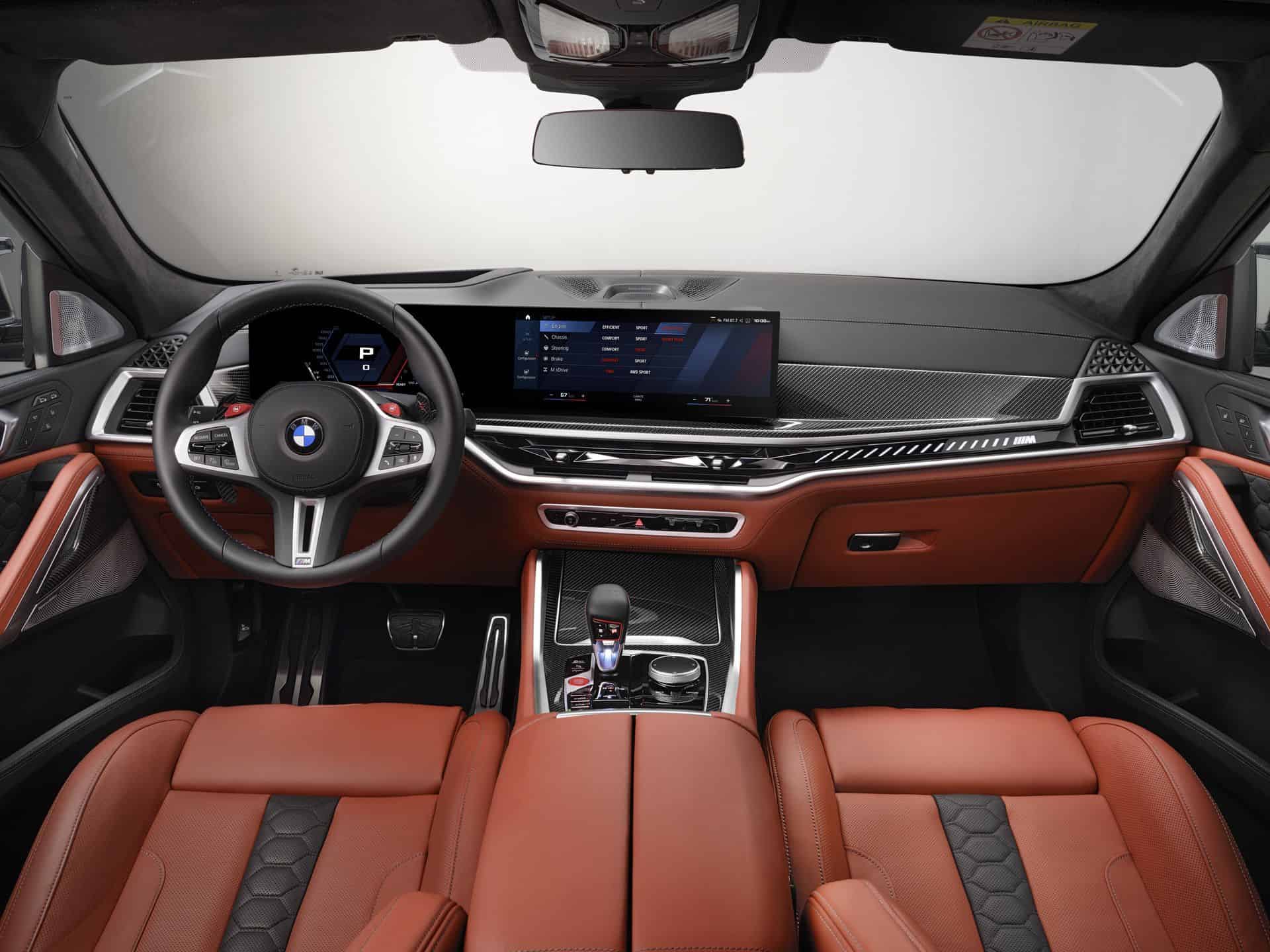 As expected, BMW is giving the 2024 X6 M its latest iDrive technology with a 12.3-inch digital instrument cluster and a 14.9-inch touchscreen housed in a Curved Display. The Operating System 8 has simplified the center console by moving most controls into the large center display. With the facelift, the central air vents are slimmer and the passenger side of the dashboard now hosts an ambient light bar with a prominent M logo.