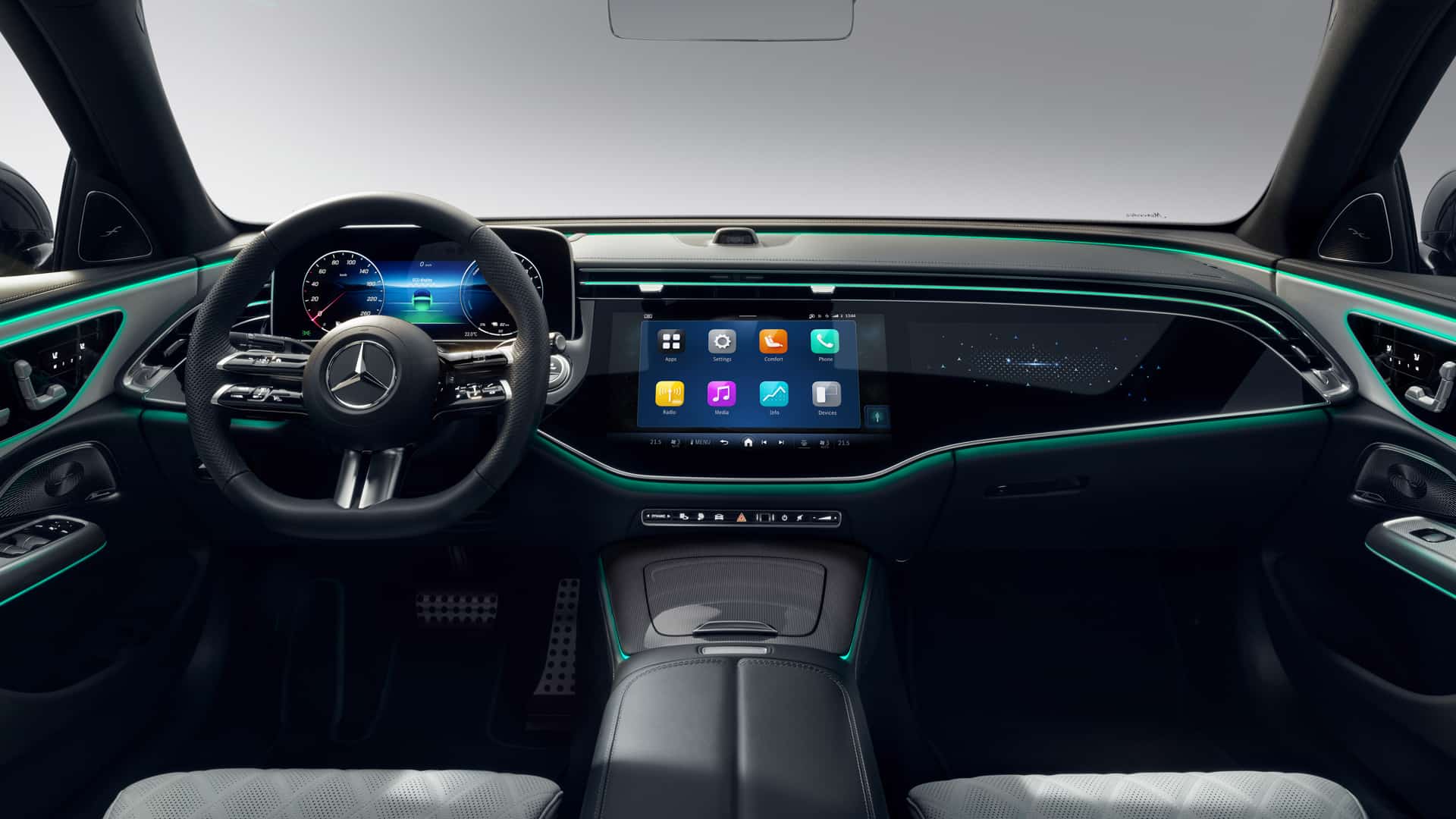 One look at the new E-Class cabin and it’s immediately evident that Mercedes is all-in on the Hyperscreen. The Hyperscreen is Mercedes’ massive new infotainment screen that spans the entirety of the dashboard. However, while it seems like one giant screen, it’s actually one giant housing with two screens inside. The main screen features the normal infotainment system, which seems to have a new UI design that feels like Apple CarPlay, with large, easy to click icons. There’s also a second optional screen just ahead of the passenger, which can control media and phone functions, as well as even play games like Angry Birds (way to be with the times, Mercedes).