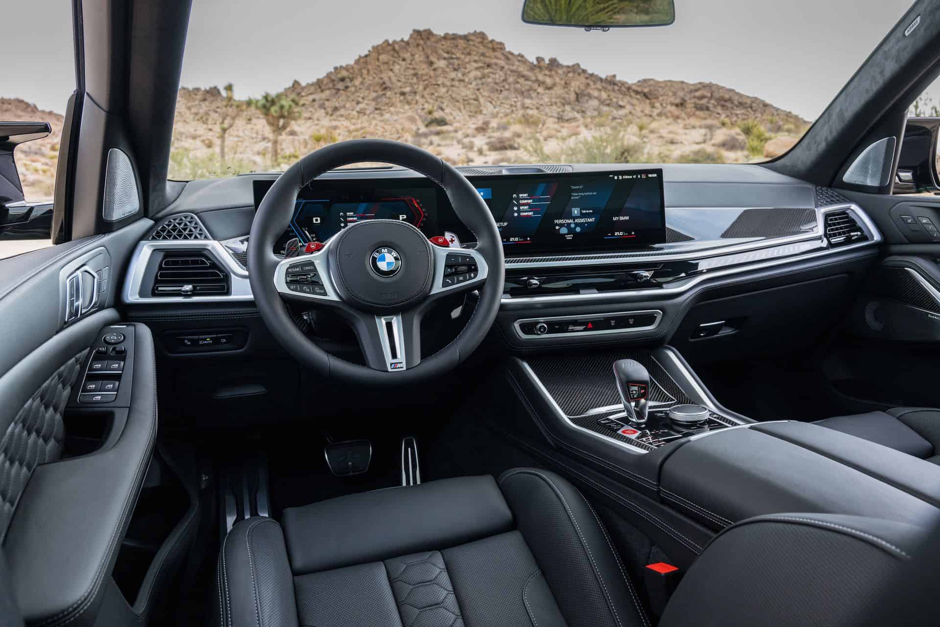 The walkaround video focuses on how the cars have changed on the outside but we all know there’s a big update inside. By transitioning the high-powered SUVs to its latest infotainment system, BMW has reduced the number of physical controls on the center console. In addition, the air vents in the middle are now slimmer to make room for the enlarged touchscreen, now with a 14.9-inch diagonal. On the passenger side of the dashboard, there’s a nifty illuminated M graphic shared with the X7 M60i.