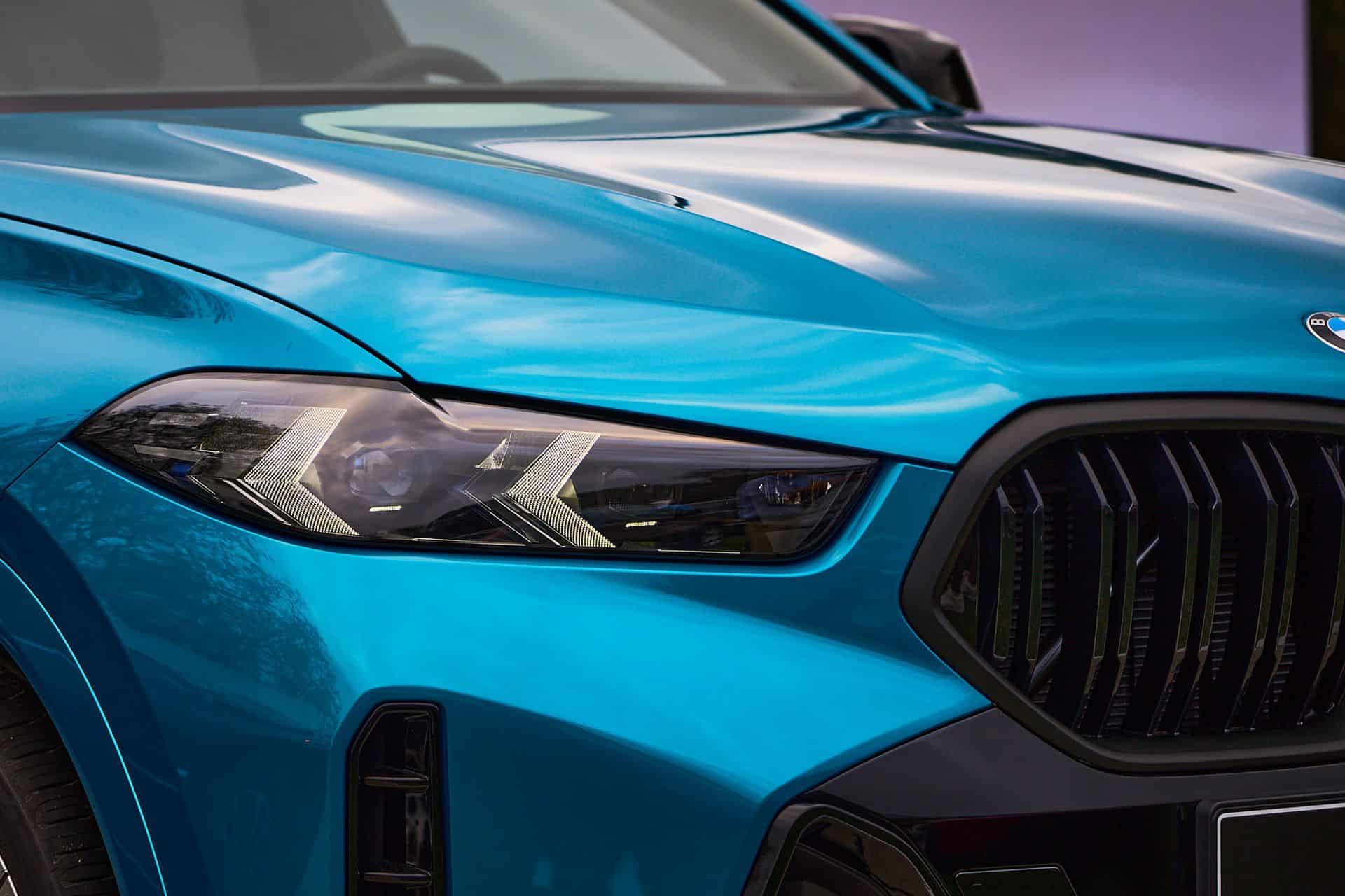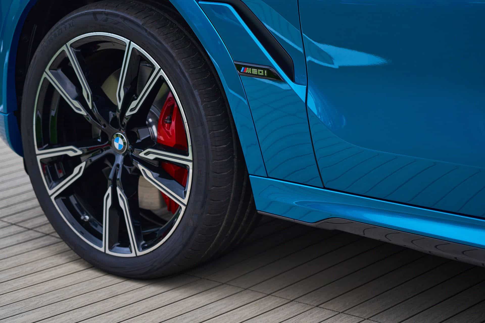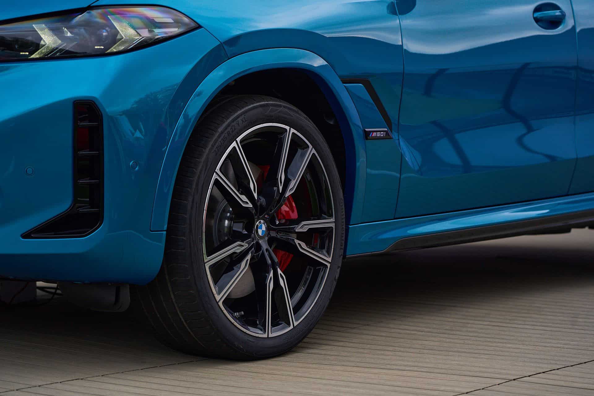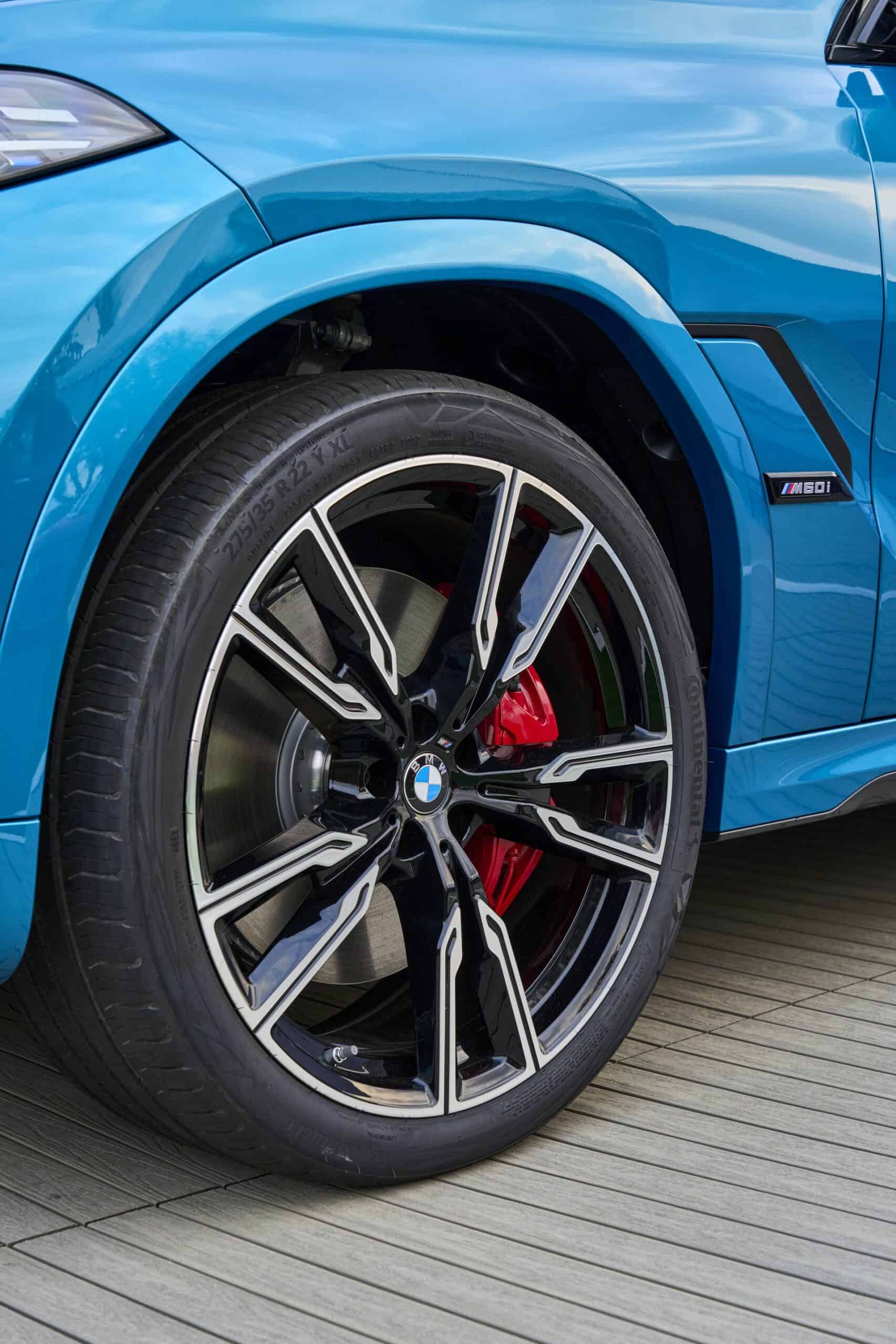 Painted in Atlantis Blue Metallic, the X6 M60i keeps the vertical kidney bars of its M50i predecessor whereas the range-topping X6 M now has horizontal slats to mirror the new M2 and XM. All X6 models get slimmer headlights with the Life Cycle Impulse, and you can now order the M Performance model in the eye-catching Isle of Man Green metallic paint for the first time. Those 22-inch wheels with a bi-color look are the largest available but you can have this size with a different design as well.