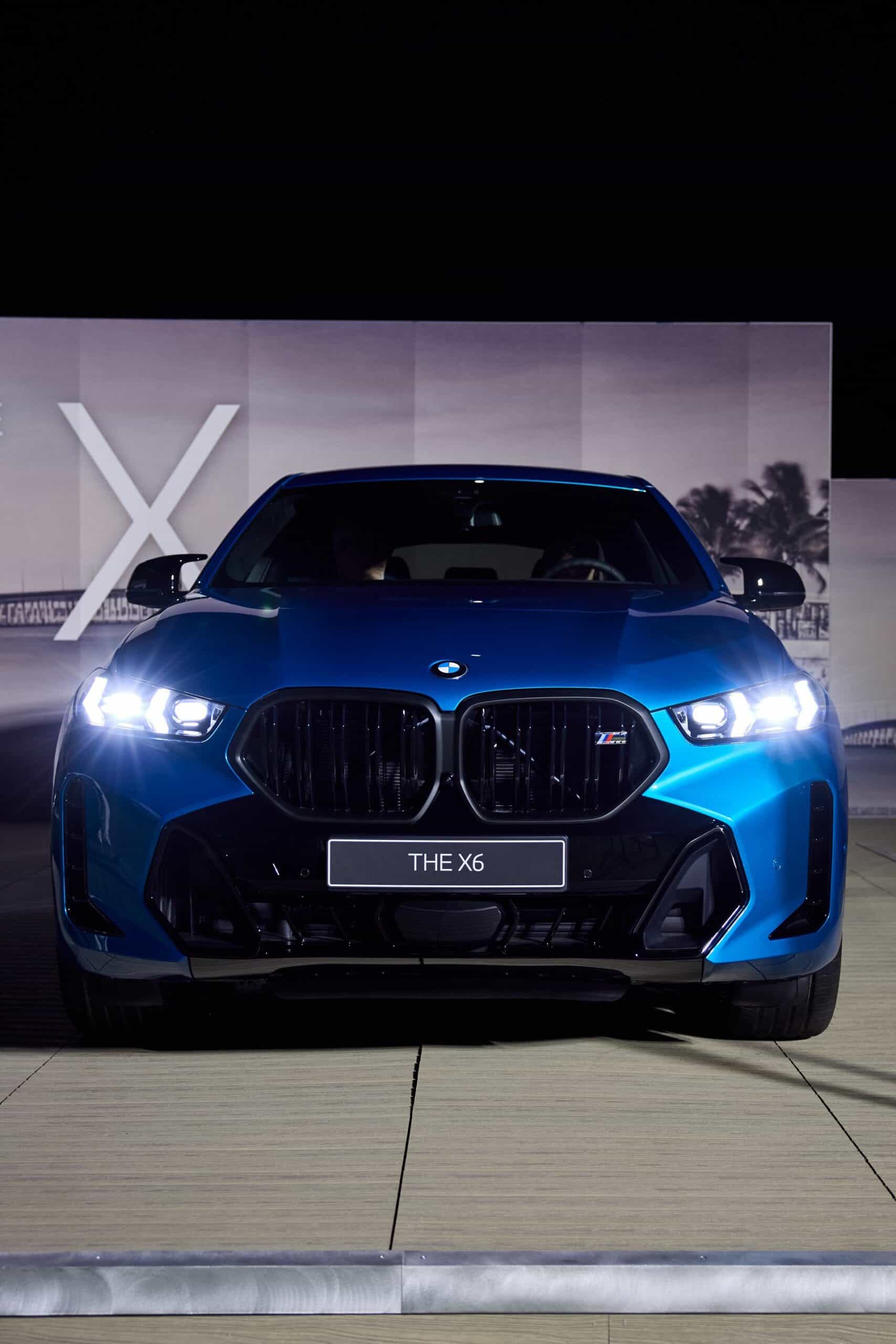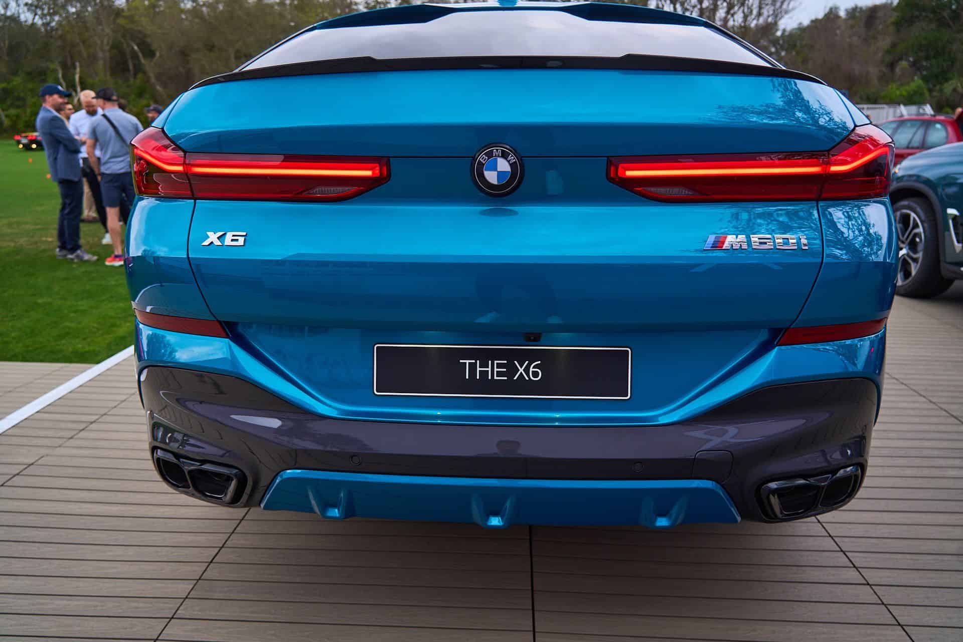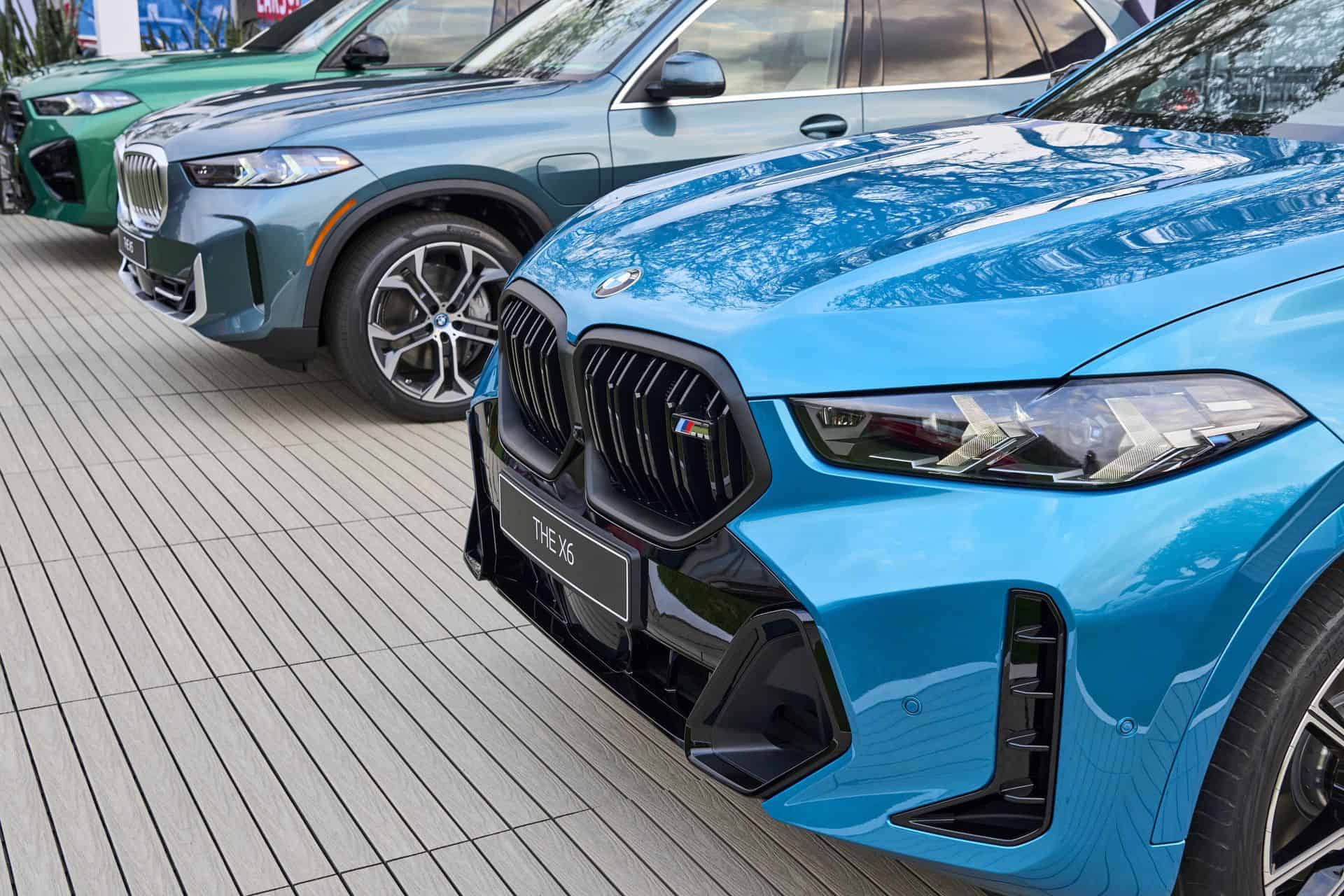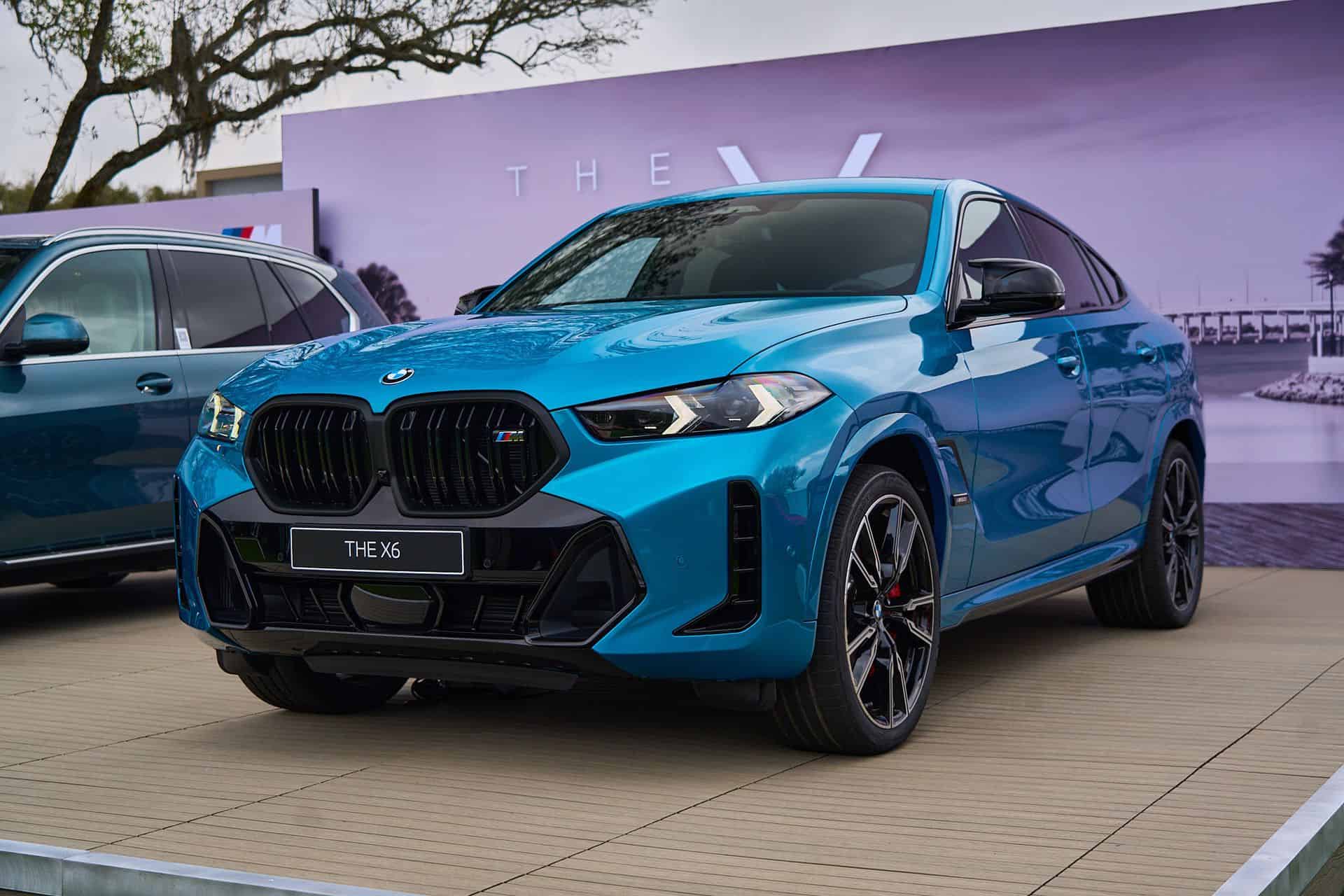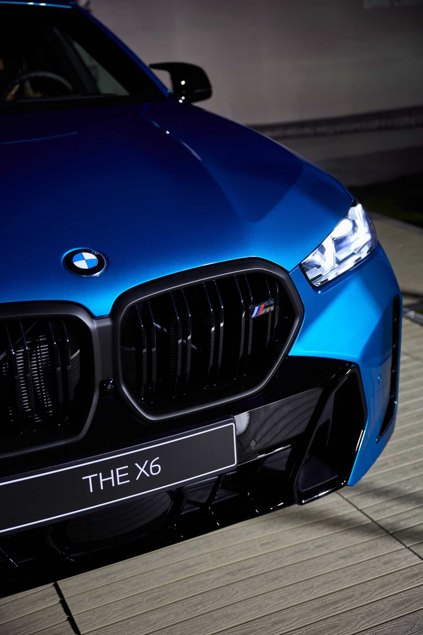 Painted in Atlantis Blue Metallic, the X6 M60i keeps the vertical kidney bars of its M50i predecessor whereas the range-topping X6 M now has horizontal slats to mirror the new M2 and XM. All X6 models get slimmer headlights with the Life Cycle Impulse, and you can now order the M Performance model in the eye-catching Isle of Man Green metallic paint for the first time. Those 22-inch wheels with a bi-color look are the largest available but you can have this size with a different design as well.