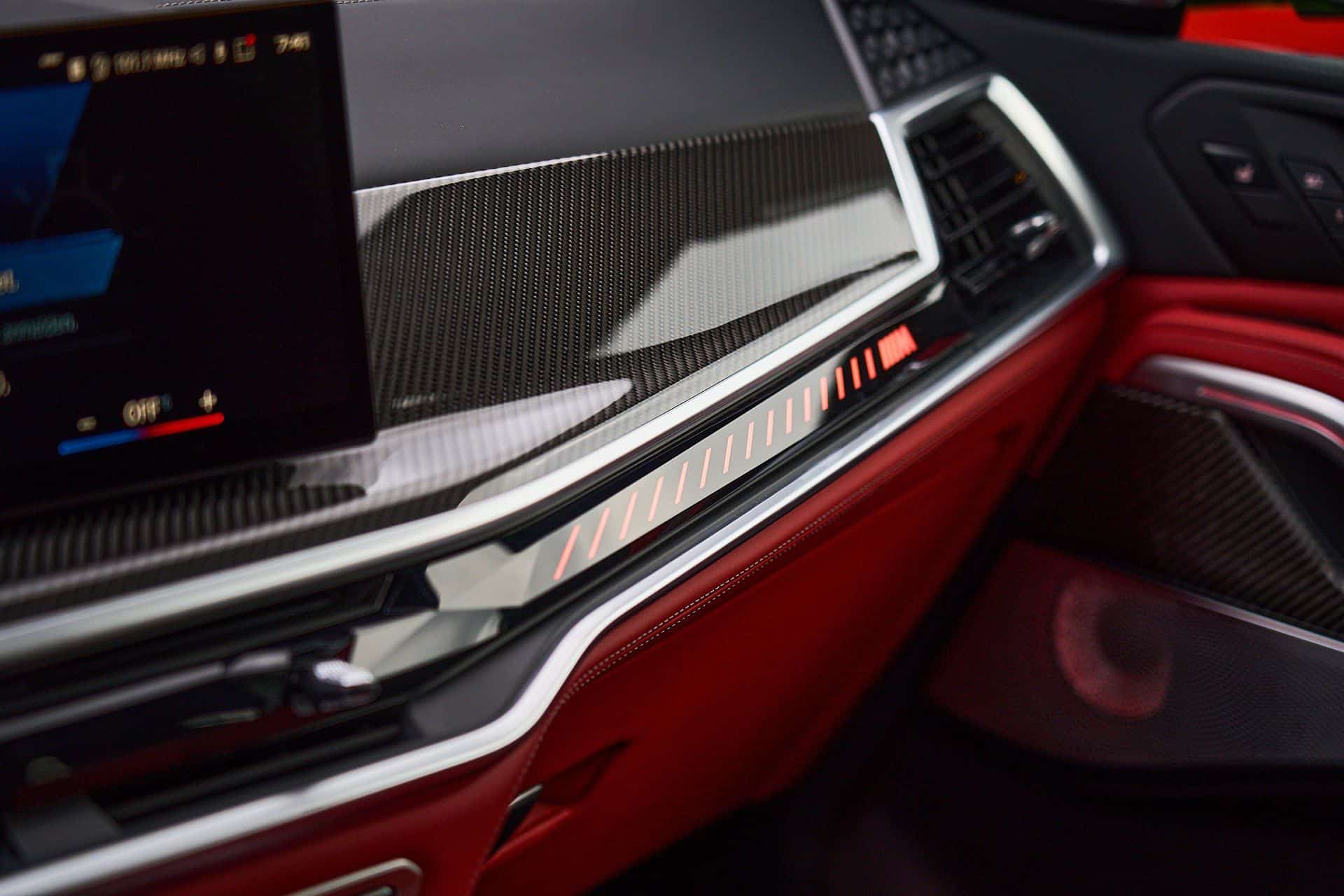 The 2024 X6 M Competition from BMW received their newest iDrive technology which includes a 12.3-inch digital instrument cluster and a 14.9-inch touchscreen to form a large curved display. The iDrive 8 has streamlined the center console by transferring the majority of controls into the sizable center display. Of course, we still dearly miss the ergonomics and utility aspects of the physical buttons and switches. As part of the facelift, the central air vents have been made thinner, and the dashboard’s passenger side now features an ambient light bar that has a noticeable M logo.
