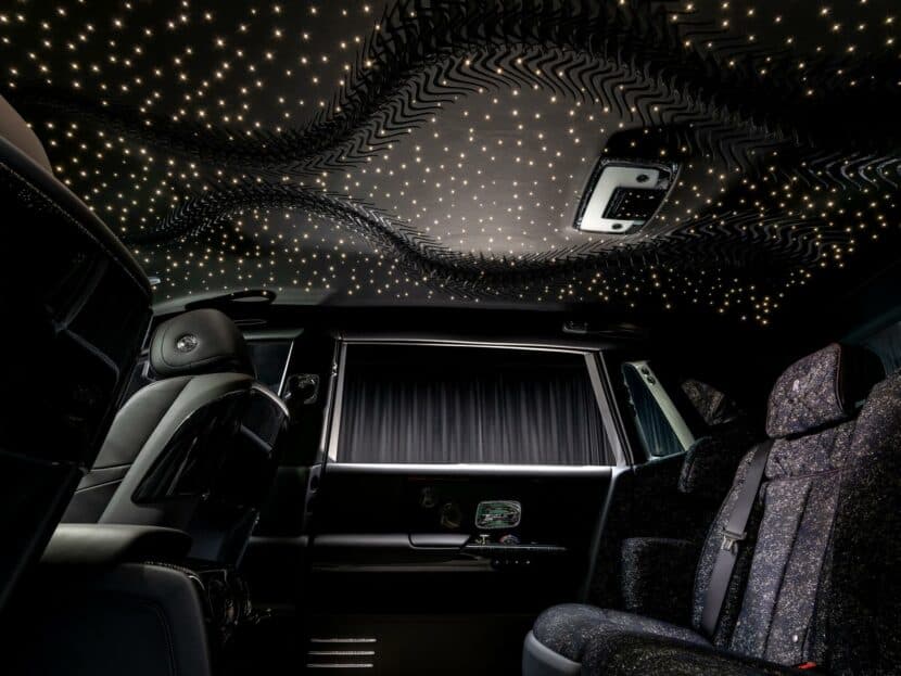 The manual labor also involved individually placing 187 of the 995 fiberoptic stars by hand. Beginning from the rear compartment to the front, these illuminate sequentially to mimic “a feeling of movement. The intricate headliner alone took nearly 700 hours of collective work to complete. An additional 85 petals are found on the Gallery, which is Rolls-Royce speak for the Phantom’s dashboard. These were also meticulously applied by hand.
