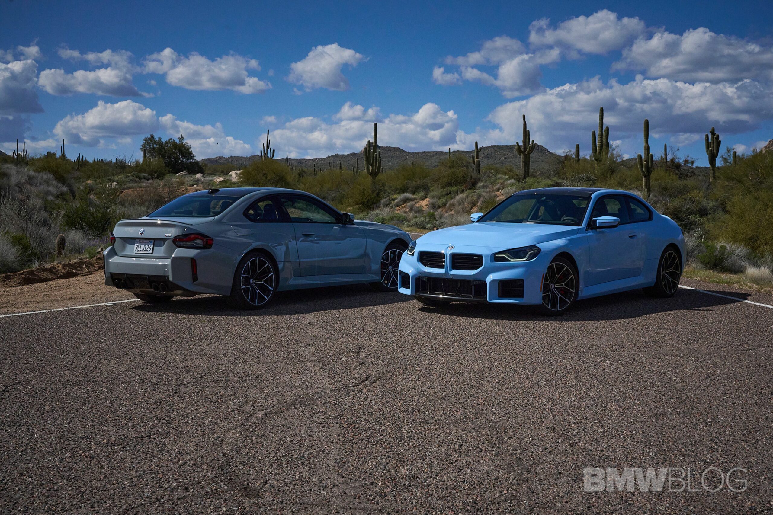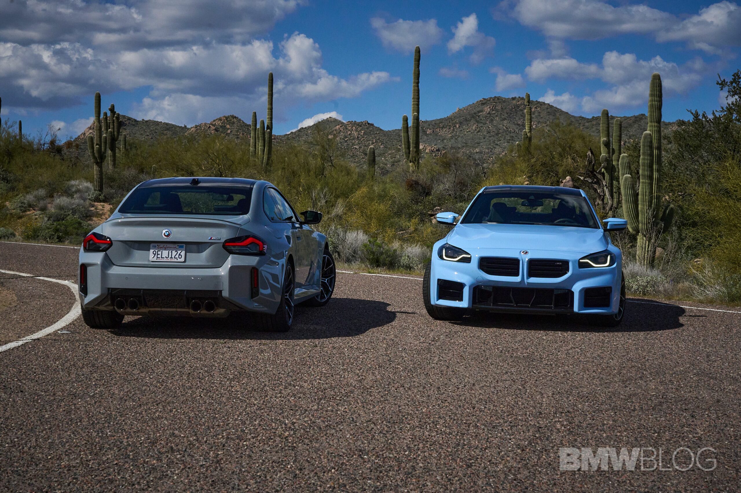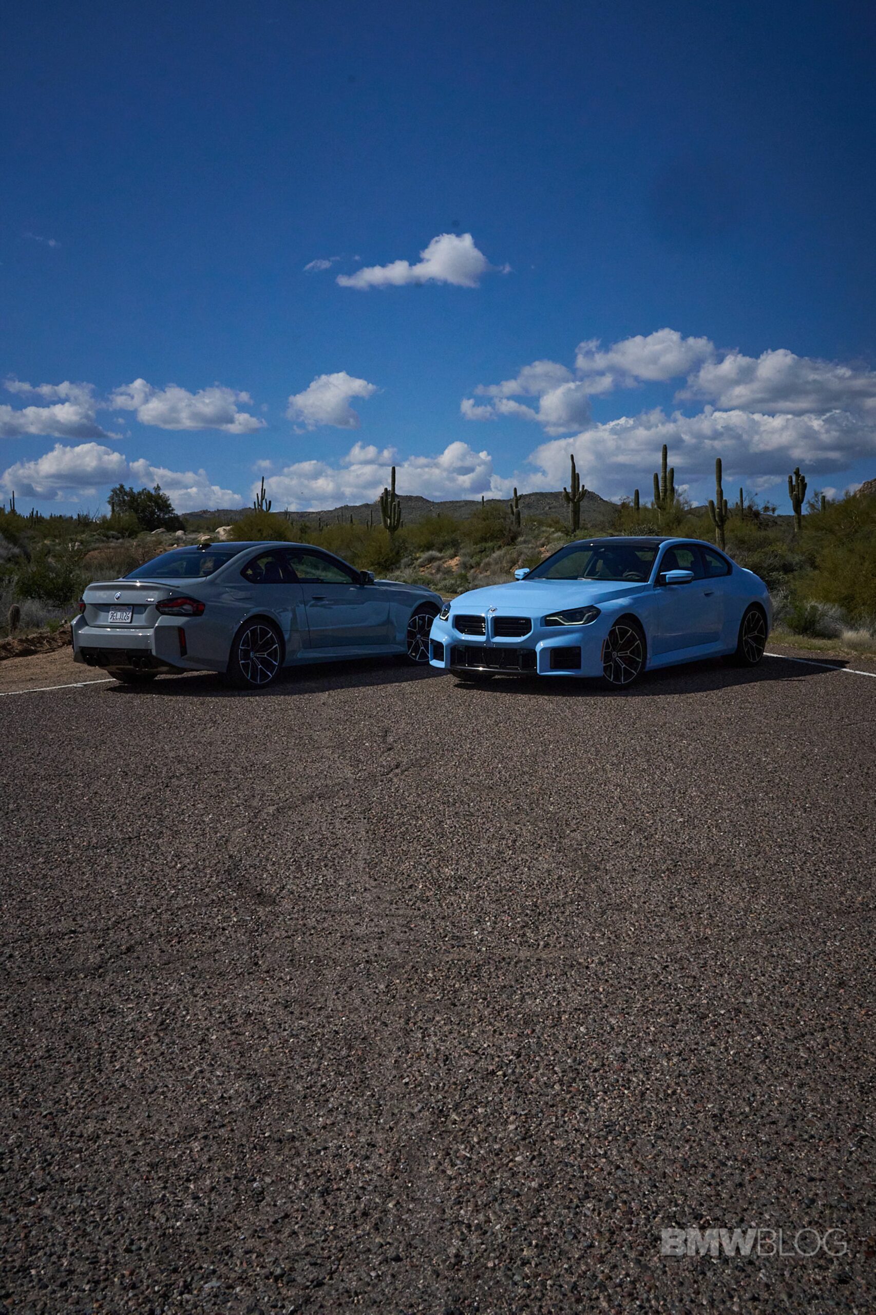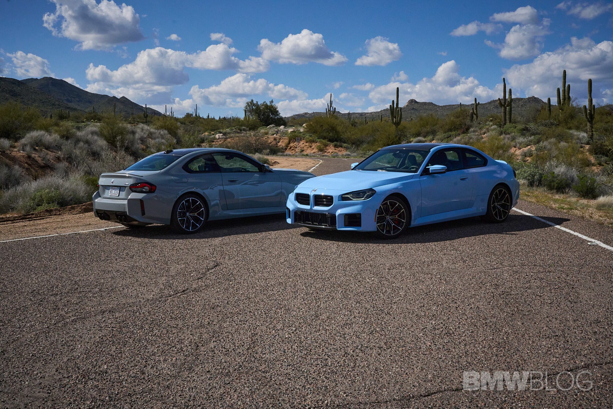 In the meantime, we spent quality time shooting an M2 duo in the familiar Brooklyn Grey shared with other BMWs and the Zandvoort Blue exclusive to the high-performance coupe. Both had the anniversary roundels marking 50 years of M and shared the two-tone (Style 930M) wheels measuring 19 inches at the front and 20 inches at the rear.