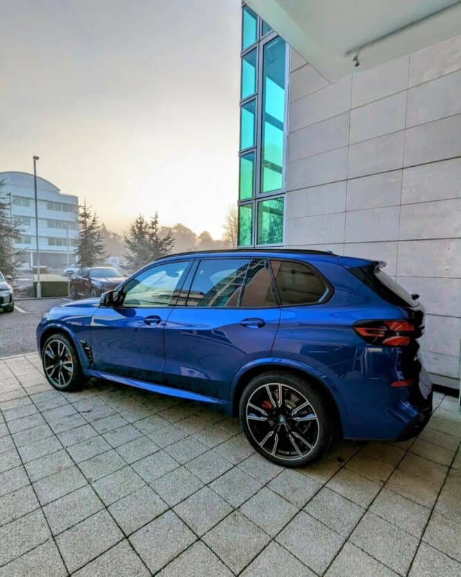 Painted in the optional Tanzanite Blue II Metallic, the 2024 BMW X5 M60i rides on the largest wheels available for the M Performance model. It’s a 22-inch set with a two-tone finish and a V-spoke design, contrasted by red brake calipers (also available in blue). Aside from the obvious design changes such as the slimmer headlights, updated taillights with “X” motif, and redesigned bumpers, there’s now an M badge on the kidney grille.