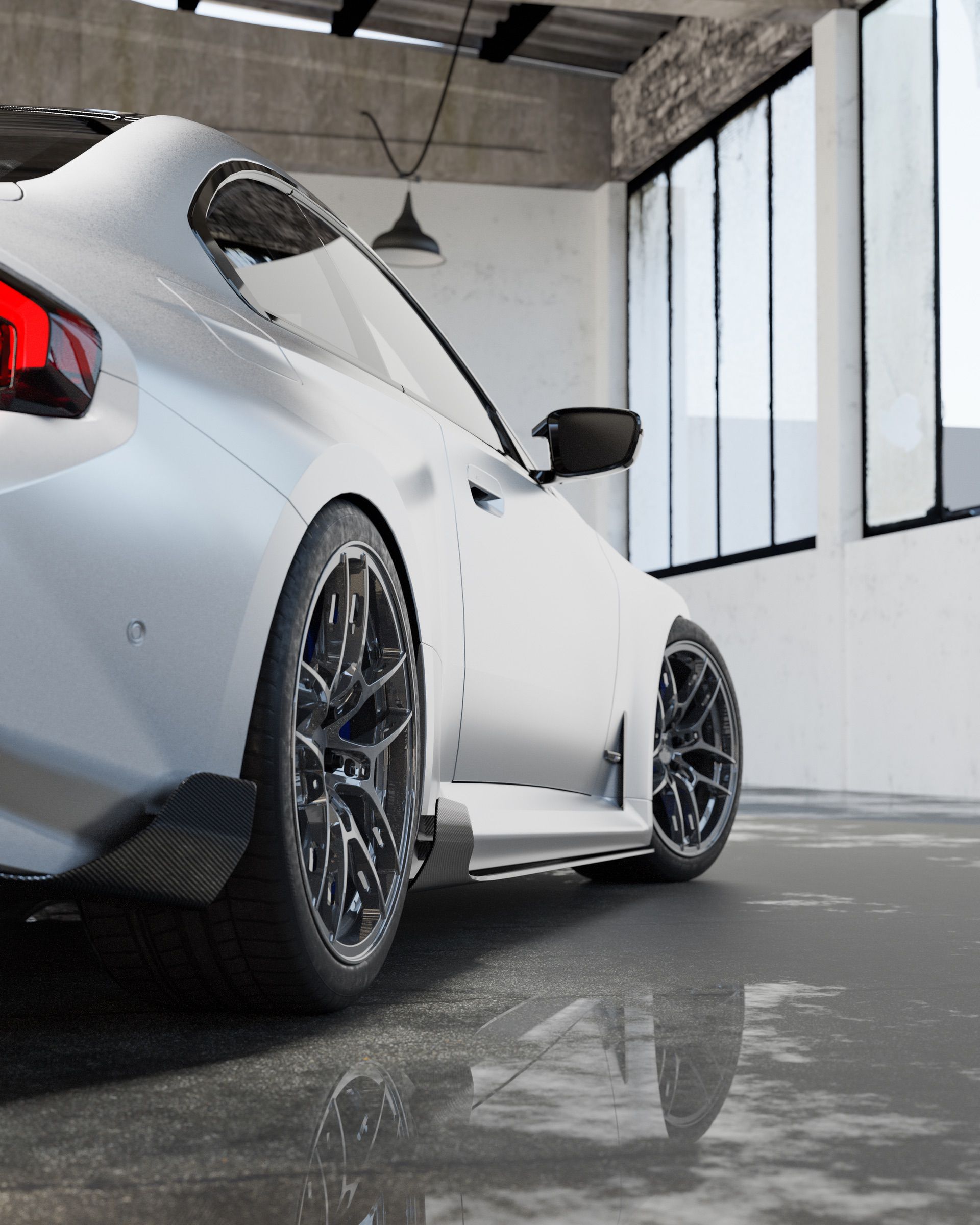 One stand out piece is the carbon fiber front splitter which is said to improve the G87 M2’s aerodynamics by optimizing airflow. Additionally, the lightweight splitter reduces drag, increasing downforce, and directing additional air into the front brake ducts for enhanced cooling. Another upgrade focuses on the side fender trim and side skirts which have integrated canards in the winglet section. The idea here is to complement the vehicle’s aerodynamic package and increasing downforce.