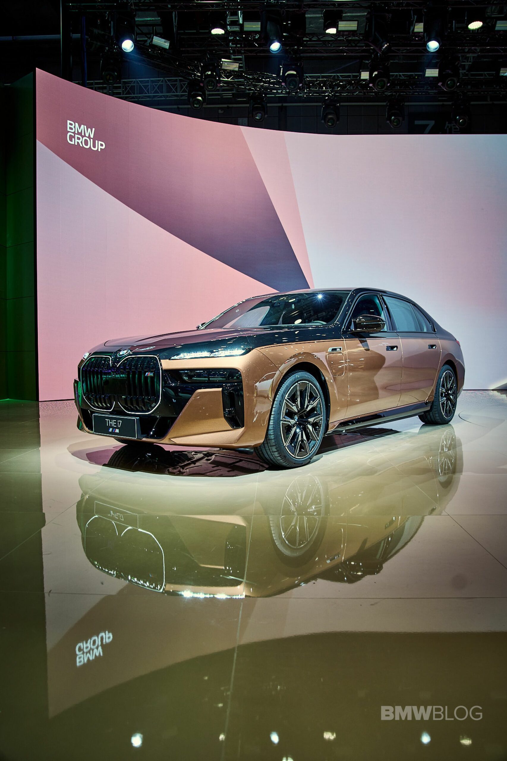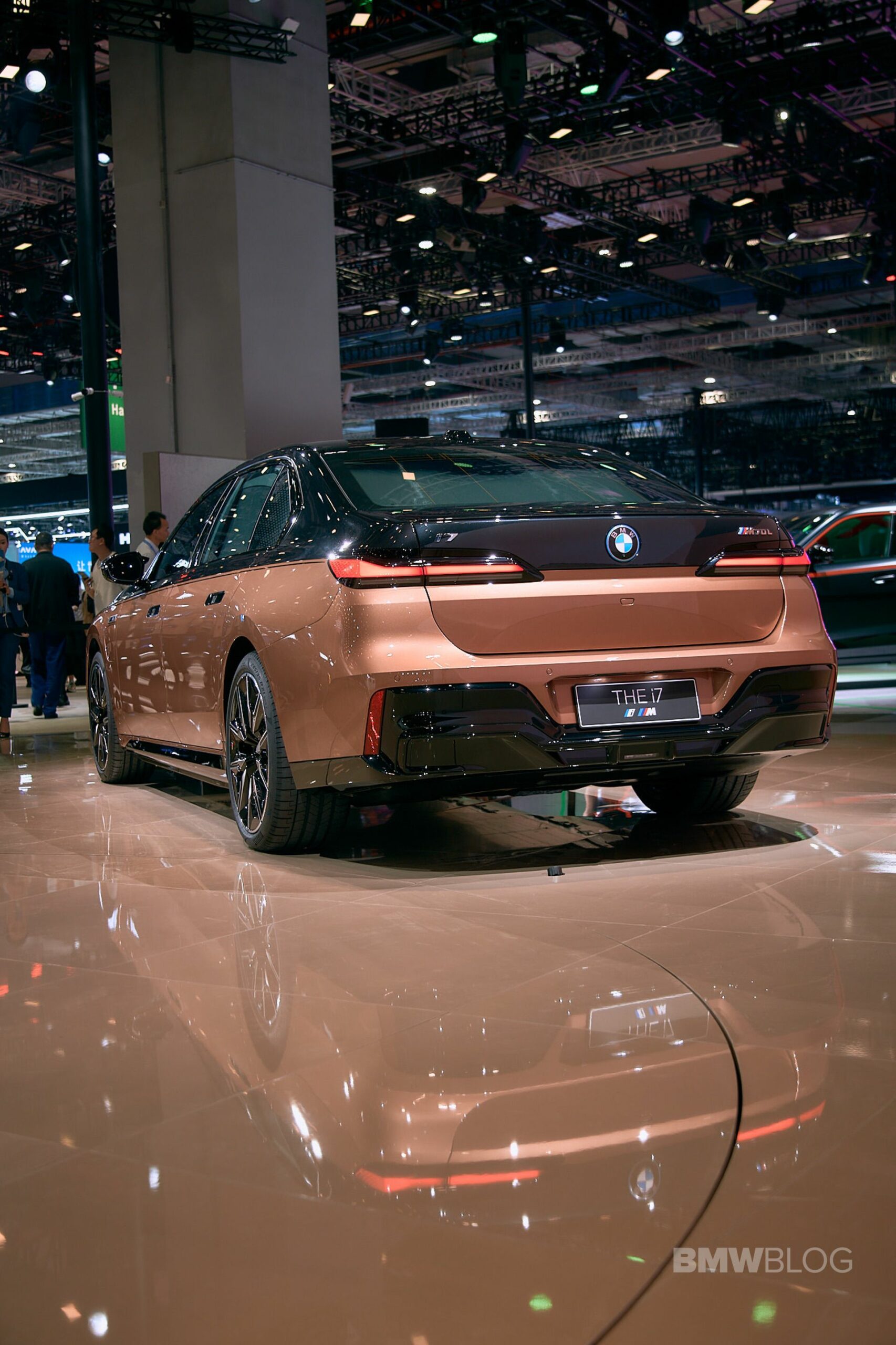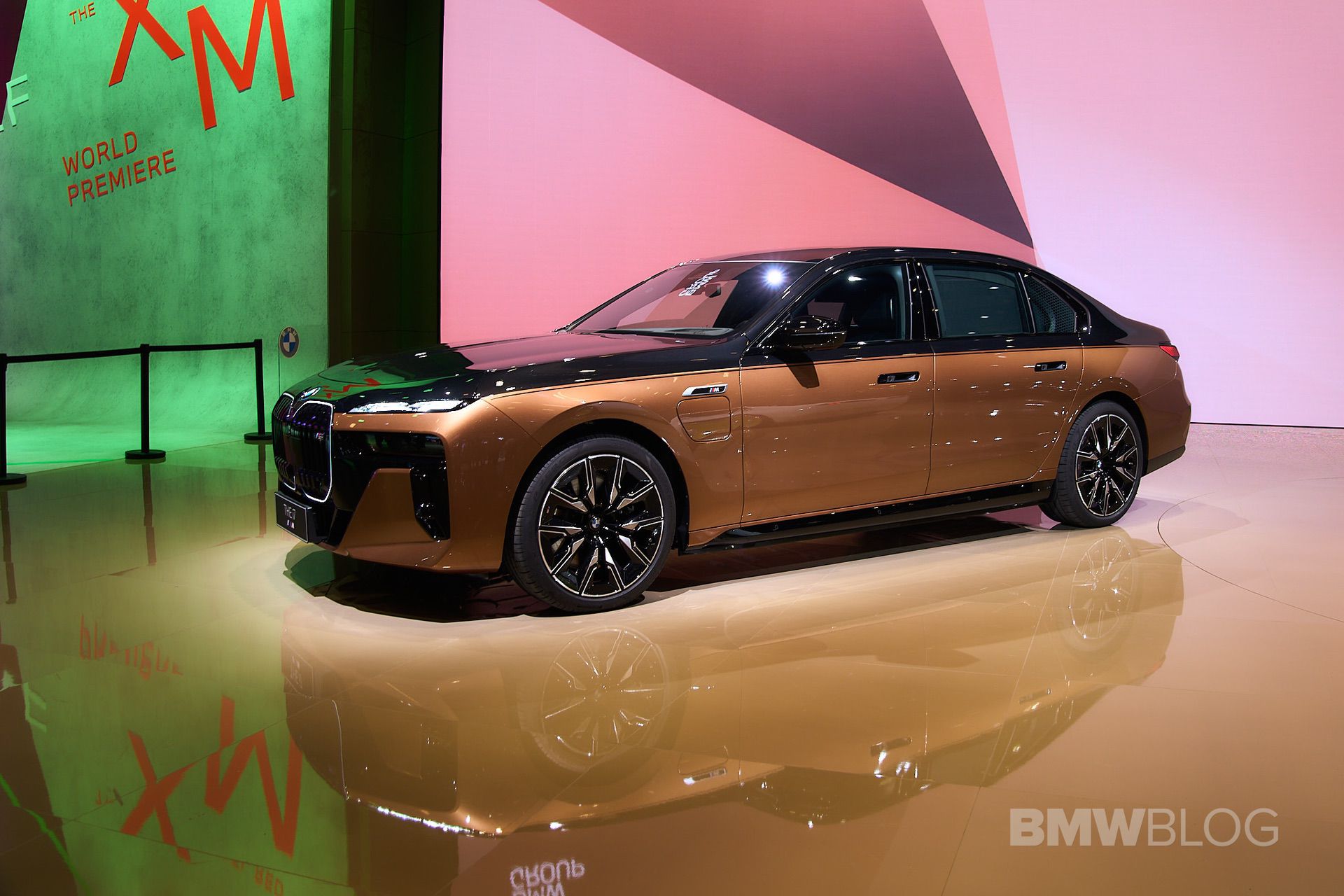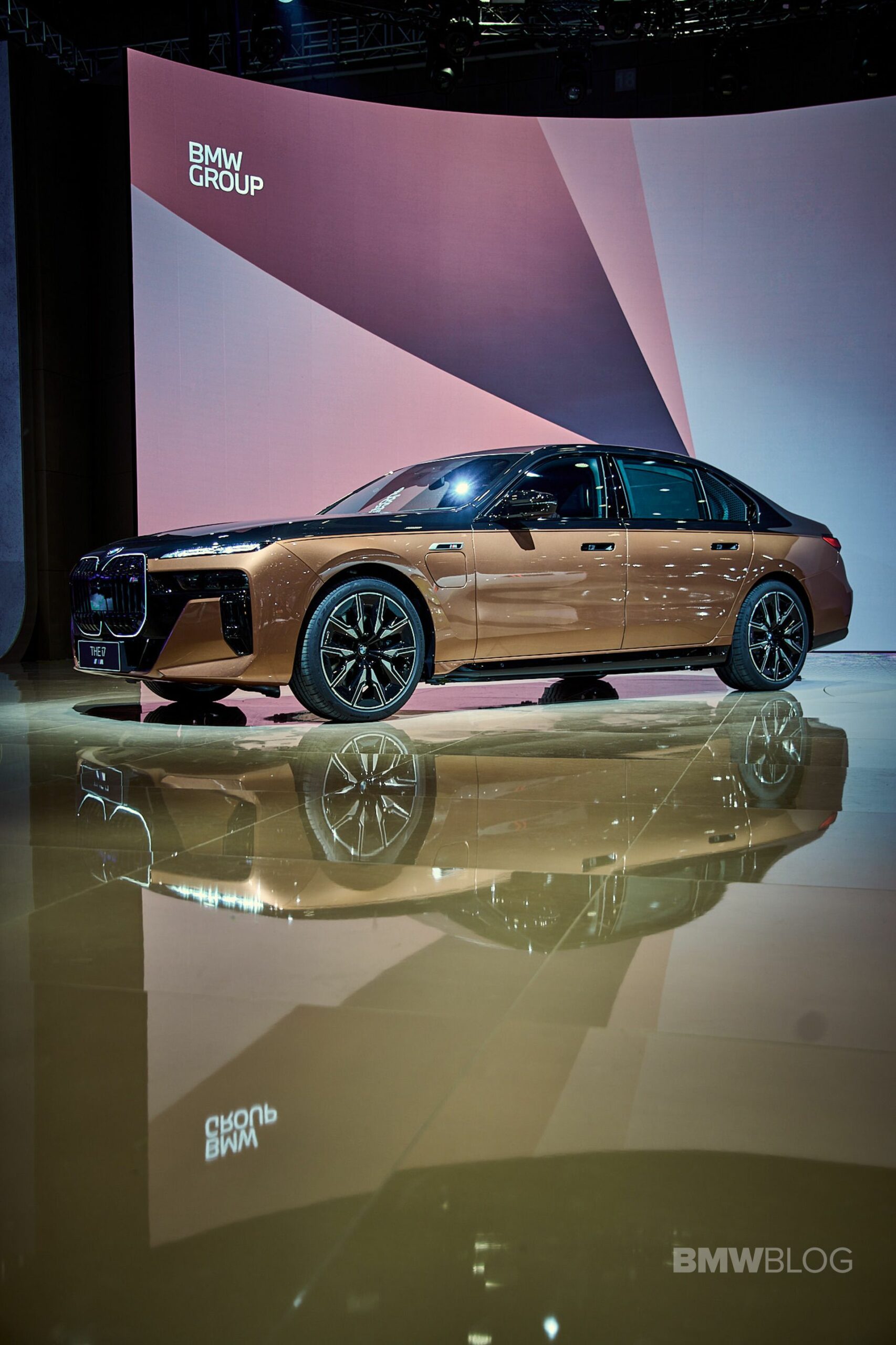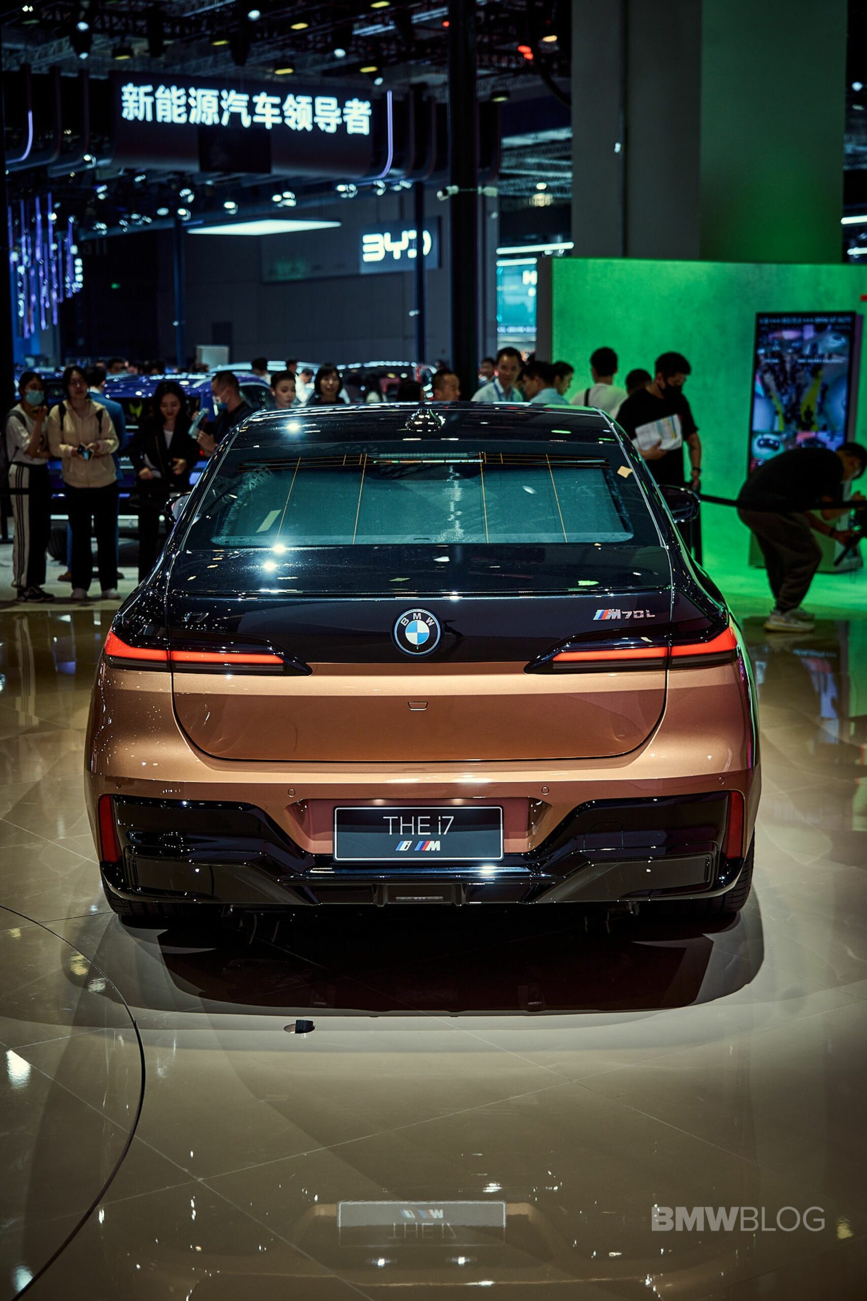 We spent some quality time with the 650-horsepower silent luxobarge and its new Liquid Copper and Black Sapphire color combo. Since the M850i was facelifted last year, BMW has been putting M badges on the grilles of M Performance models, and this i7 M70 is no exception. A massive vehicle deserves a large illuminated kidney grille, and it now has a glossy black surround for the first time on the i7. The showcar from Shanghai has 21-inch wheels with a two-tone look and metallic inserts, with black M Sport brake calipers lurking from behind.
