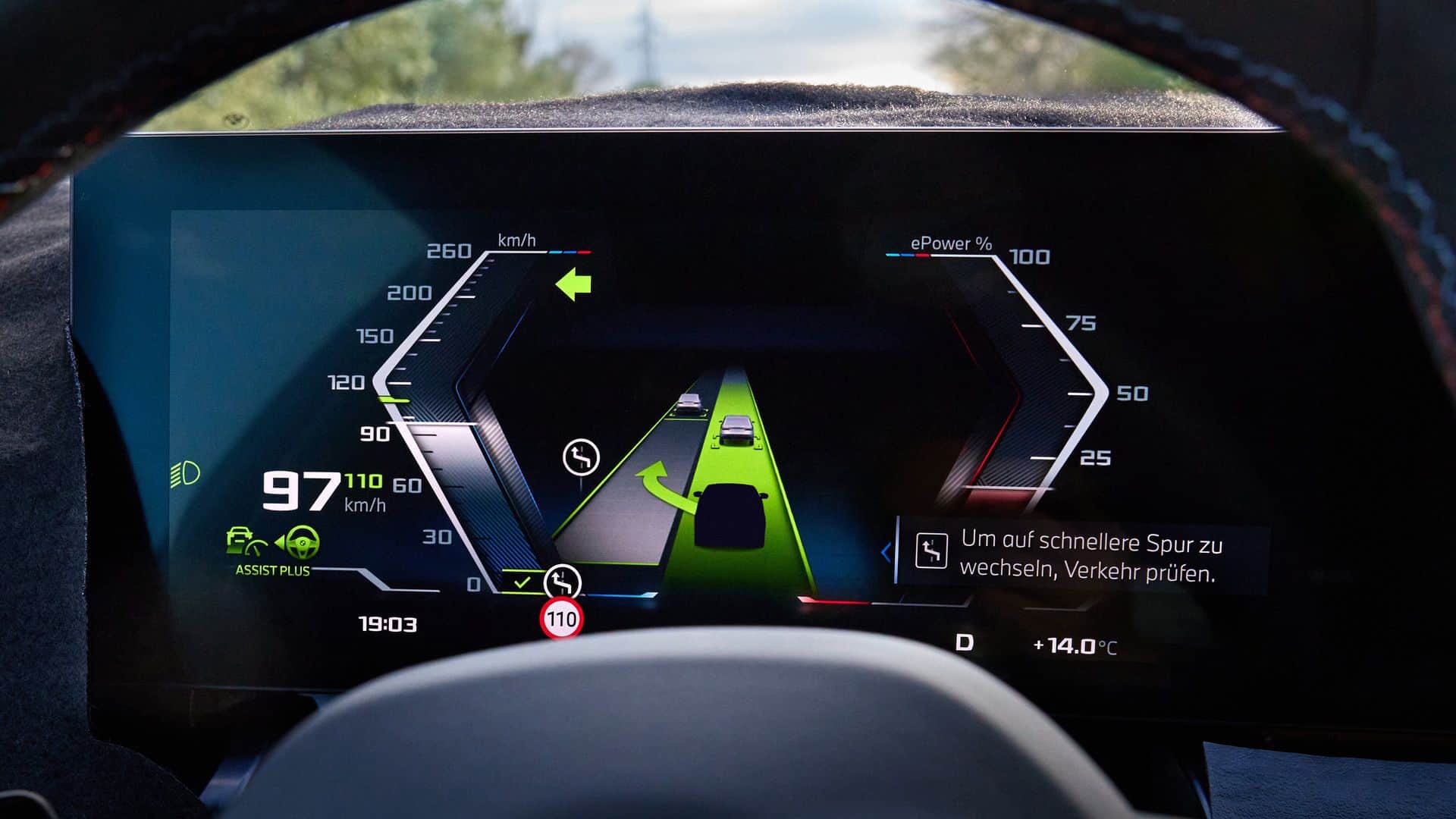 Moving on to a world premiere feature not only for the BMW 5 Series but also for BMW and the entire industry: the Automated Lane Change. An eye-tracking device located behind the steering wheel allows drivers to automatically change lanes by simply moving their head to the left or right. The system undergoes multiple safety checks before initiating a lane change, including searching for a gap on the left or right side. Once a gap is detected, graphics in the dashboard indicate the availability of the maneuver, followed by an audio and visual prompt. To initiate the lane change, the driver simply moves their head in the desired direction, and the system automatically activates the turn signal and begins the procedure.
