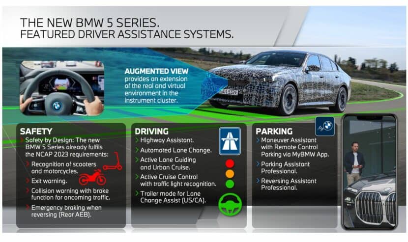 BMW categorizes their driver assist systems under three pillars: Safety, Driving and Parking. Under the firs pillar, the new BMW 5 Series fulfills the NCAP 2023 requirements, including the recognition of scooters and motorcycles, collision warning with brake function for oncoming traffic and emergency braking when reversing. Let’s cover the last pillar before we talk about the most exciting one. So under the Parking category of assist systems, the BMW 5 Series will offer the well known Manuever Assistant with Remote Control Parking via the BMW My App. Additionally, you can spec the car with the Parking Assistant Professional and the Reversing Assistant.