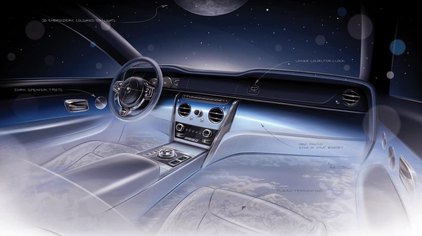 Step inside and you’ll be immediately greeted by the intricate Starlight Headliner with a complex Moon-inspired embroidery. There are no fewer than 250,000 stitches in the ceiling for a process that takes two days to complete. Rolls-Royce has inserted 799 white and 384 blue fiber-optic stars for a grand total of 1,183, with each having been individually positioned in the perforated holes of the leather canvas.