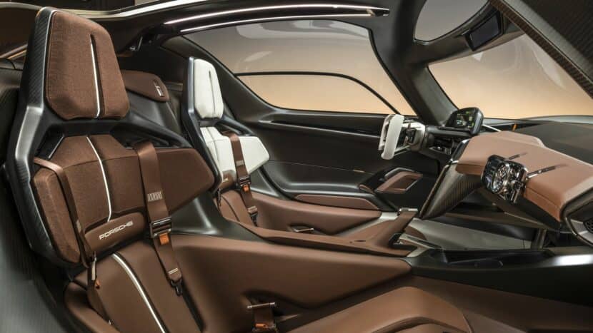 The interior of the Mission X is the real standout. It is the most driver-focused interior Porsche has ever designed, and it perfectly blends digital elements with physical controls. The yoke steering wheel may not make it into production, but the physical controls and knobs will surely add to the driving experience. Other nice elements in the interior include the iconic startup key to the left of the cockpit, the competition harness seat belts, and the analog stopwatch on the passenger’s display.