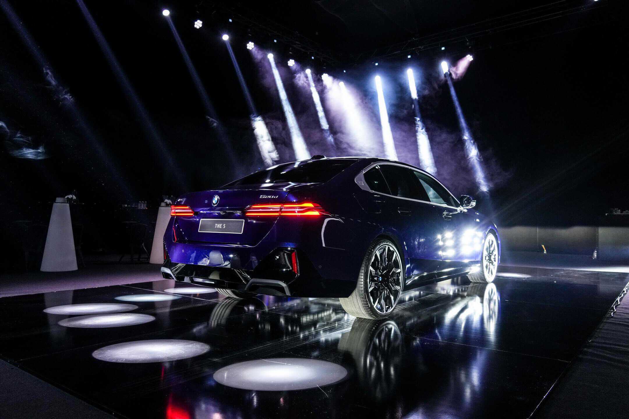 Since it’s not the i5 M60 with its sportier grille design we’ll also see on the next M5, the lesser 5 Series has a conventional kidney grille with vertical silver slats on a shiny black panel. We’re used to seeing BMWs with loads of Shadowline upgrades but this one retains the traditional silver exterior accents, including for the Hofmeister kink where a large “5” logo now calls home. Open the doors and a similar motif is found on the B-pillars.