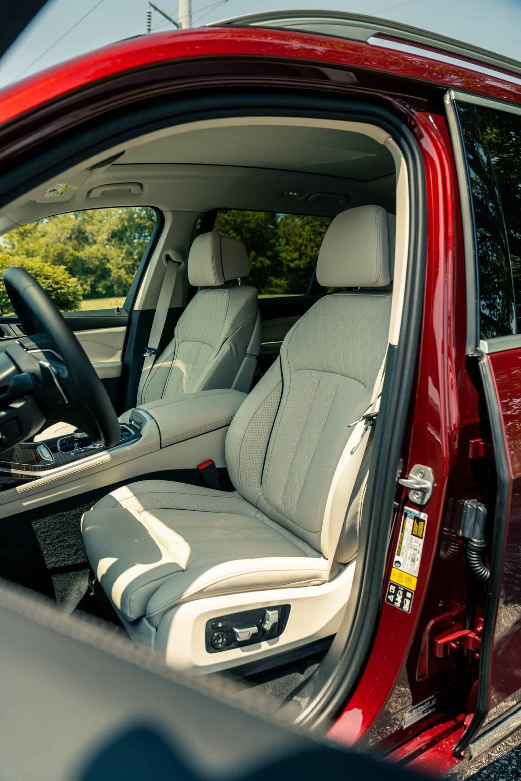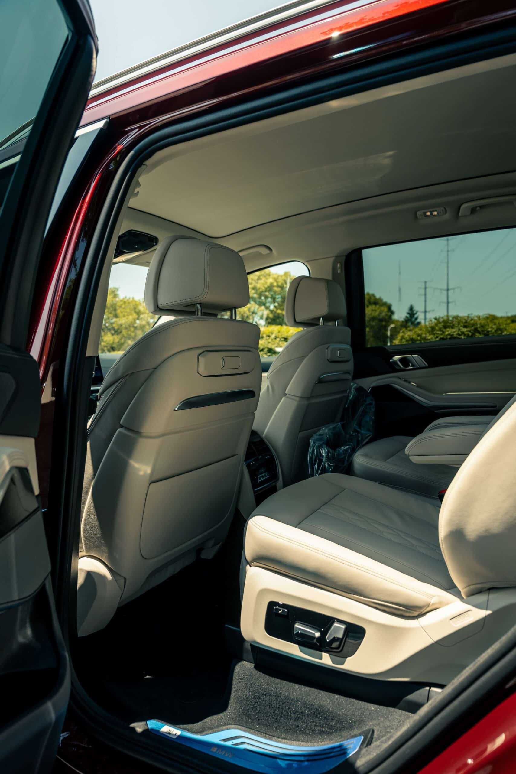 The fullsize luxury SUV showcased by Autohaus BMW St Louis is finished in Aventurin Red Metallic, an attractive no-cost paint option. The stately X7 rides on 21-inch wheels with a Y-spoke design but you can go bigger with a 22-inch set available for an extra $1,300 or a 23-inch set priced at $2,600. Since this xDrive40i doesn’t have the M Sport Package, it keeps the traditional silver and chrome exterior trim we rarely get to see these days on new BMWs.