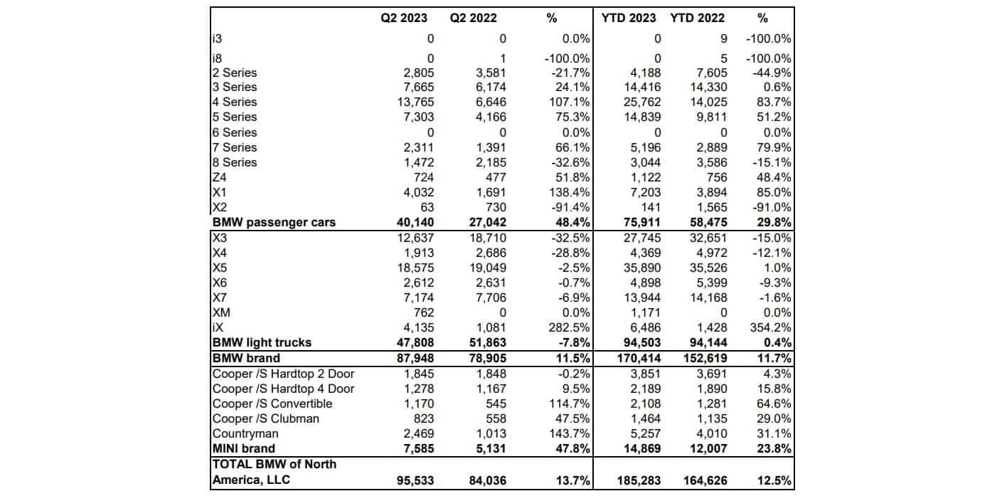 BMW had a great second quarter in the United States where deliveries to customers rose by 11.5% to 87,948 units. A more in-depth look at the numbers shows some surprising changes as demand for the X3 plummeted by 32.5% while its swoopy sibling, the X4, suffered a 28.8% decline. The larger X5, X6, and X7 also had fewer customers than in the second quarter of 2022 while the iX was up by 282.5% to 4,135 units. Fueled by the arrival of the new generation, the X1 enjoyed an impressive 138.4% hike to 4,032 compact crossovers.