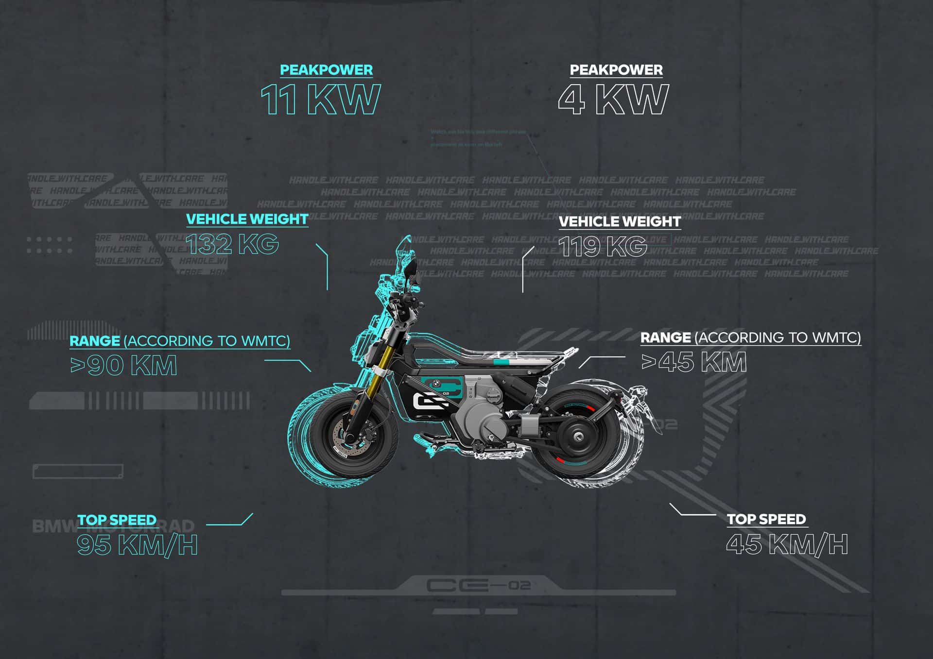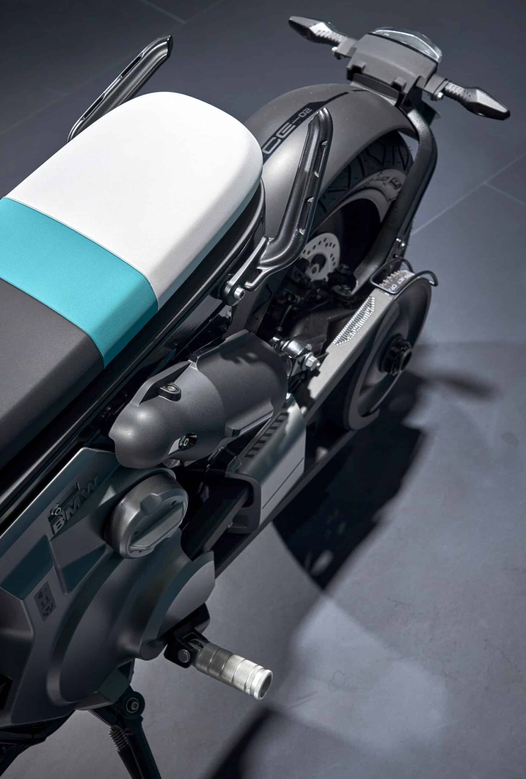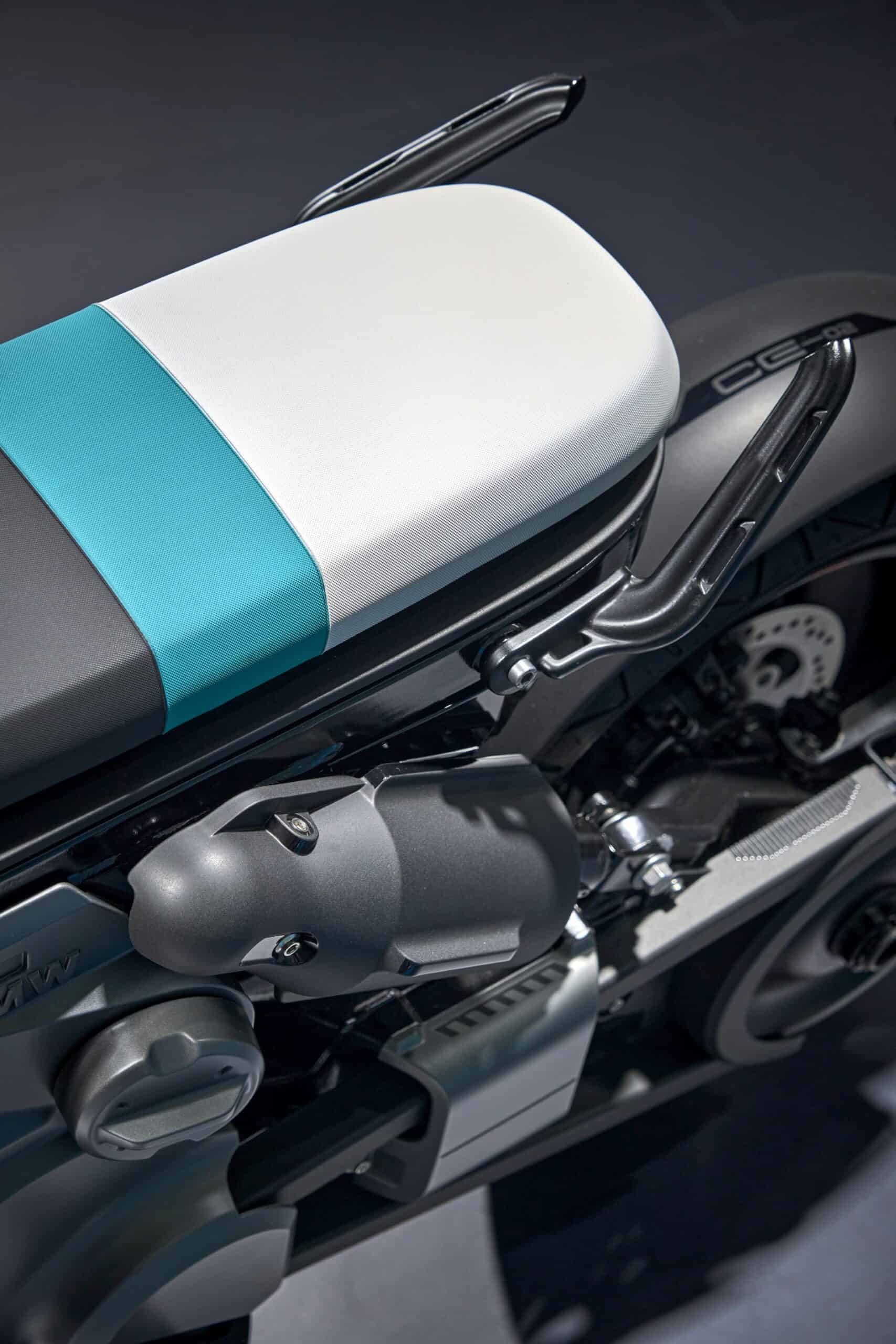 Featuring a tubular steel, double-loop frame, the CE 02 comes painted in Cosmic Black with a black seat as well as contrasting Granite Grey Metallic and Silver accents, plus nine decals. Spring for the Highline Package and BMW Motorrad will throw in forks anodized in gold, a tape design combined with a petrol hue, and a whopping 22 decals. This more expensive version also has the seat finished in a combination of white, petrol, and black.