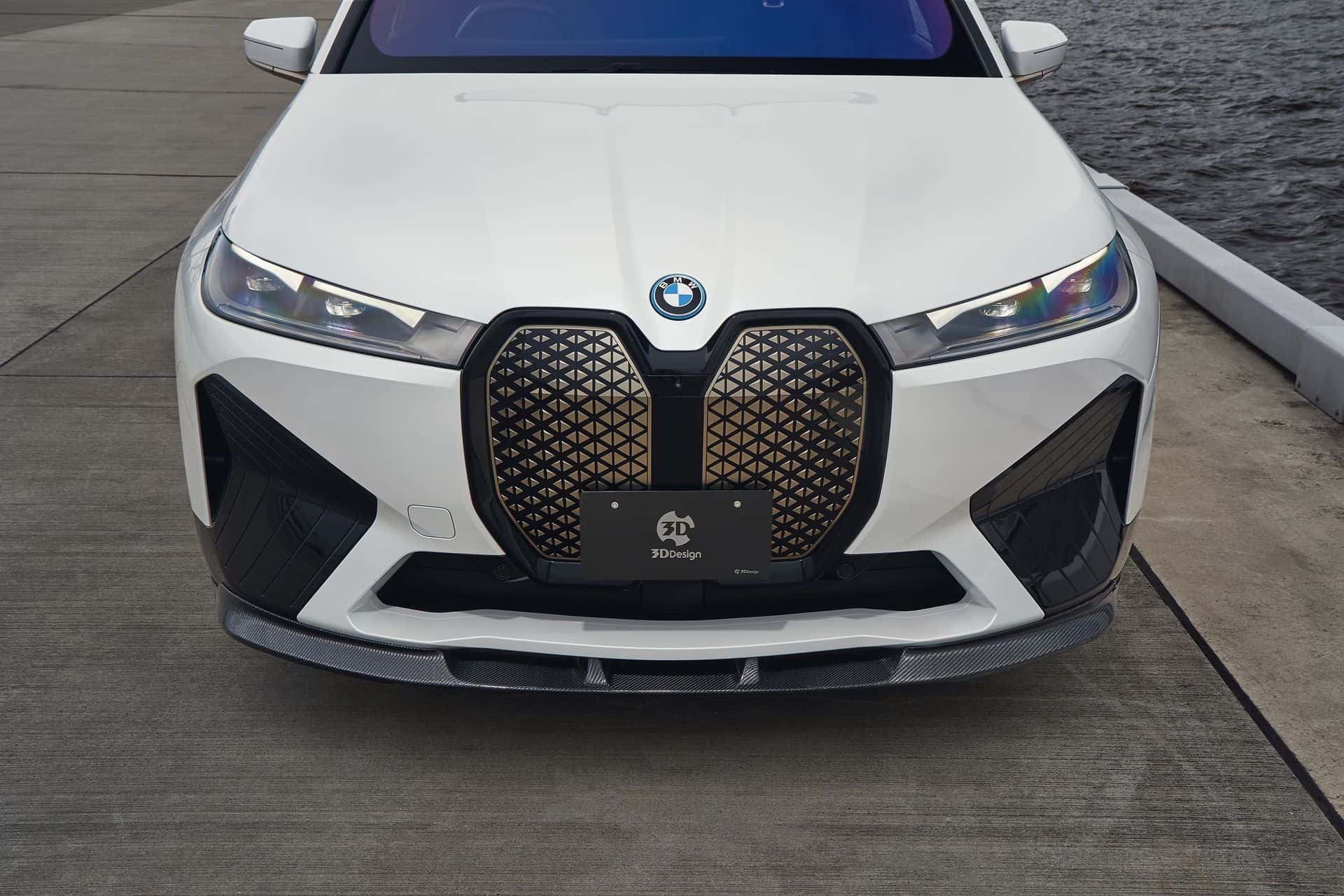 The front lip spoiler by 3D Design is engineered to complement the “Sport package” bumper and the performance-oriented BMW iX M60 variant. Crafted with precision, the carbon fiber construction adds a touch of aggression to the front end of the iX, enhancing its aerodynamic efficiency and visual presence. The sporty design element accentuates the electric SUV’s dynamic character while maintaining a cohesive aesthetic with the overall design language.