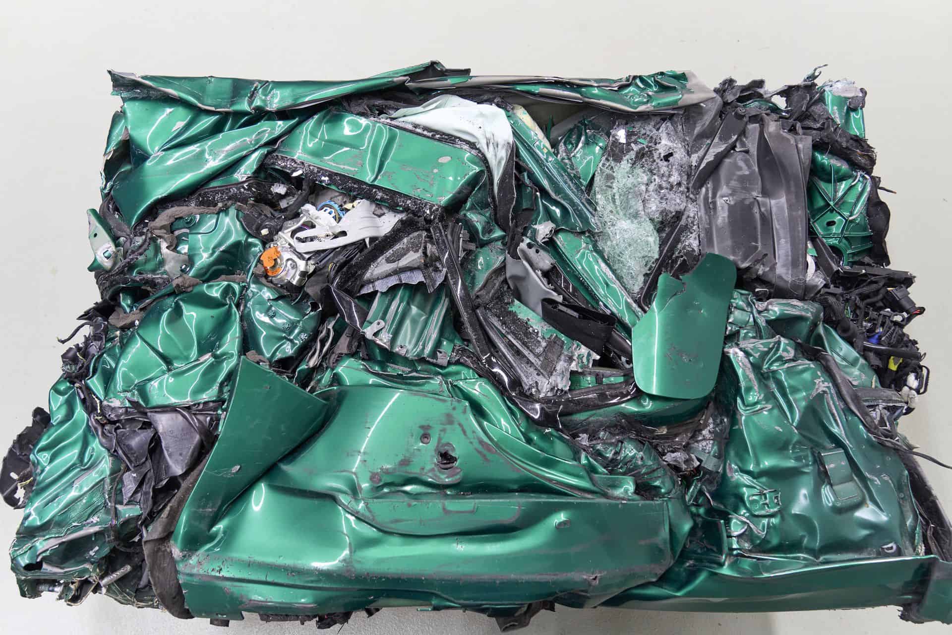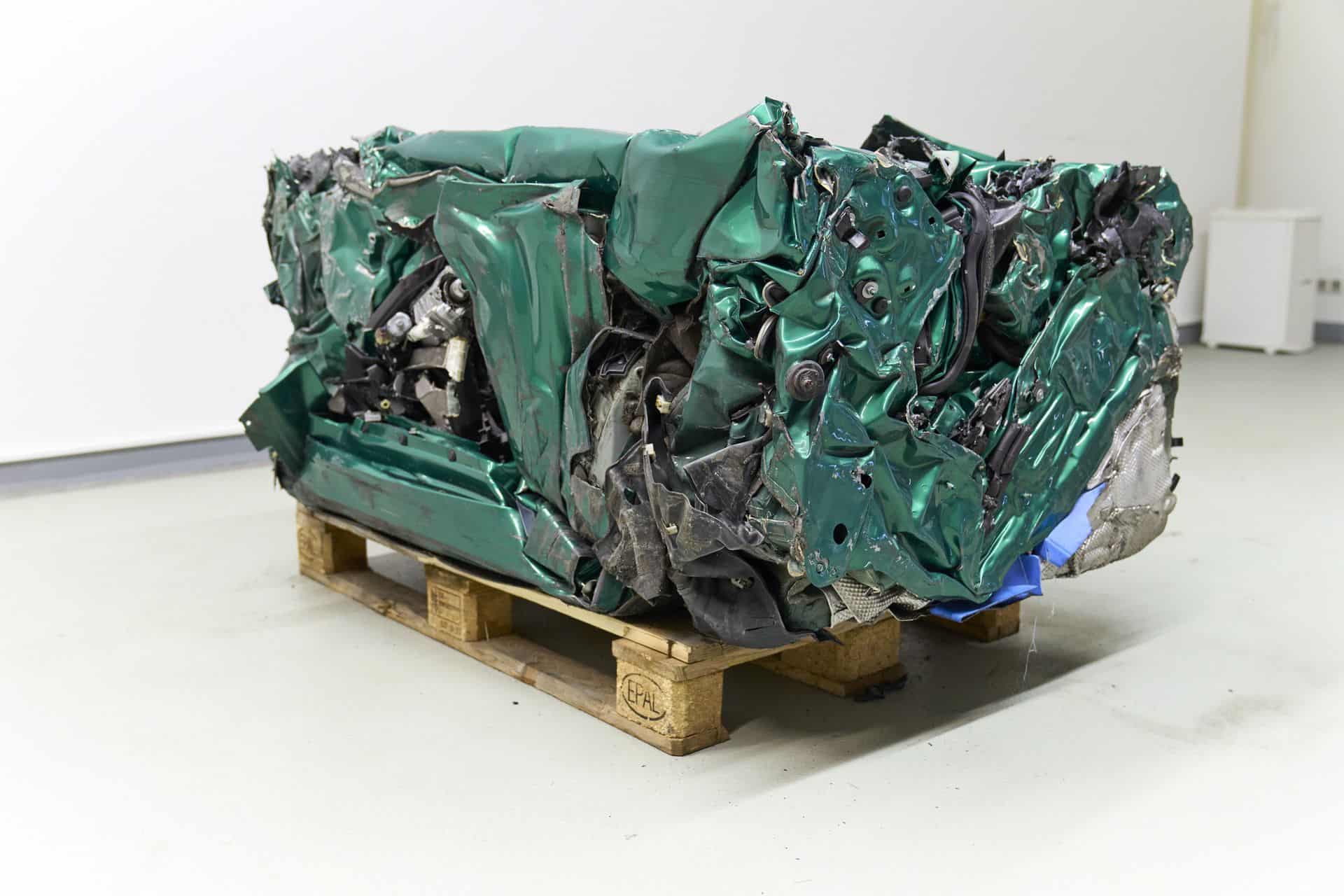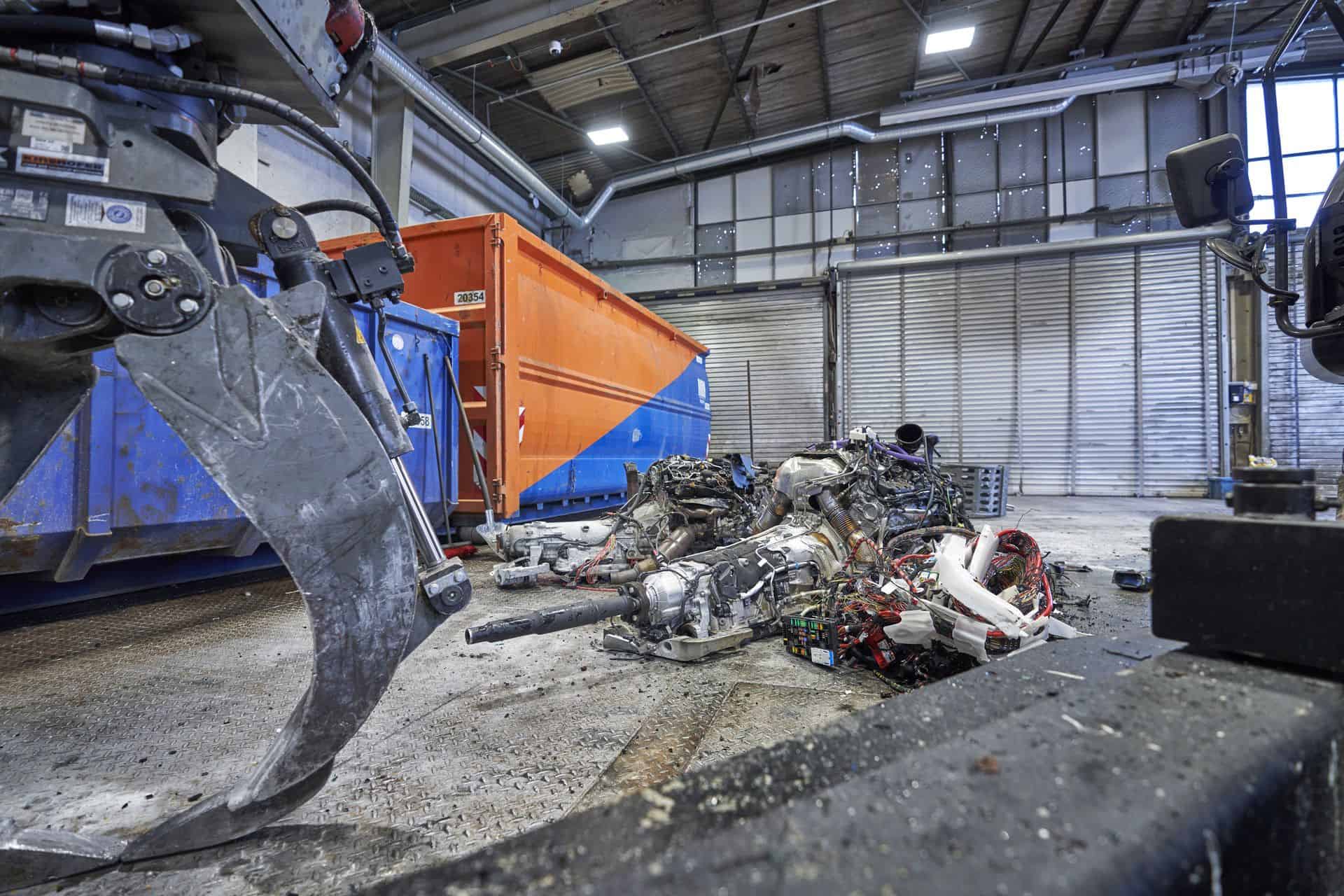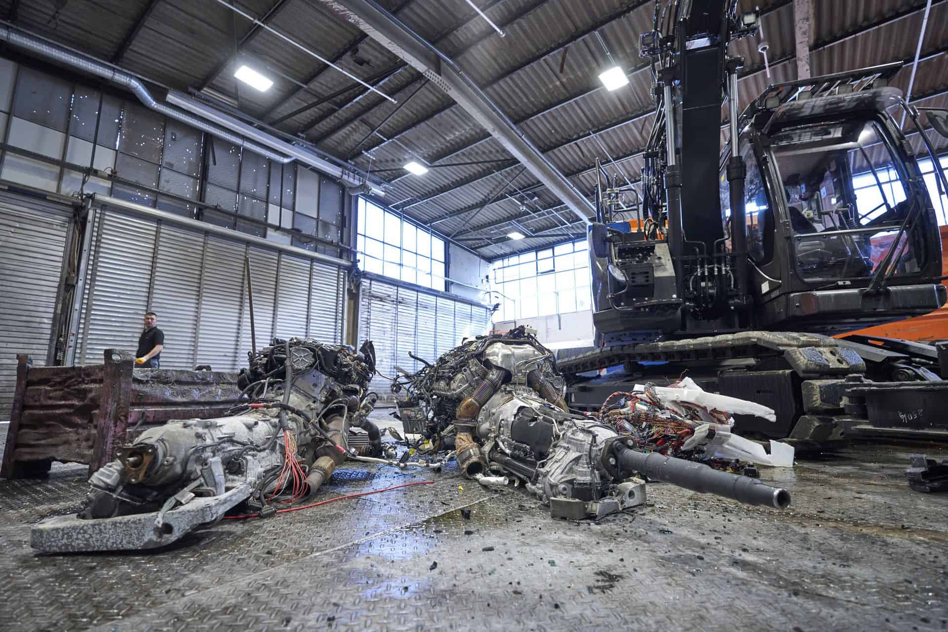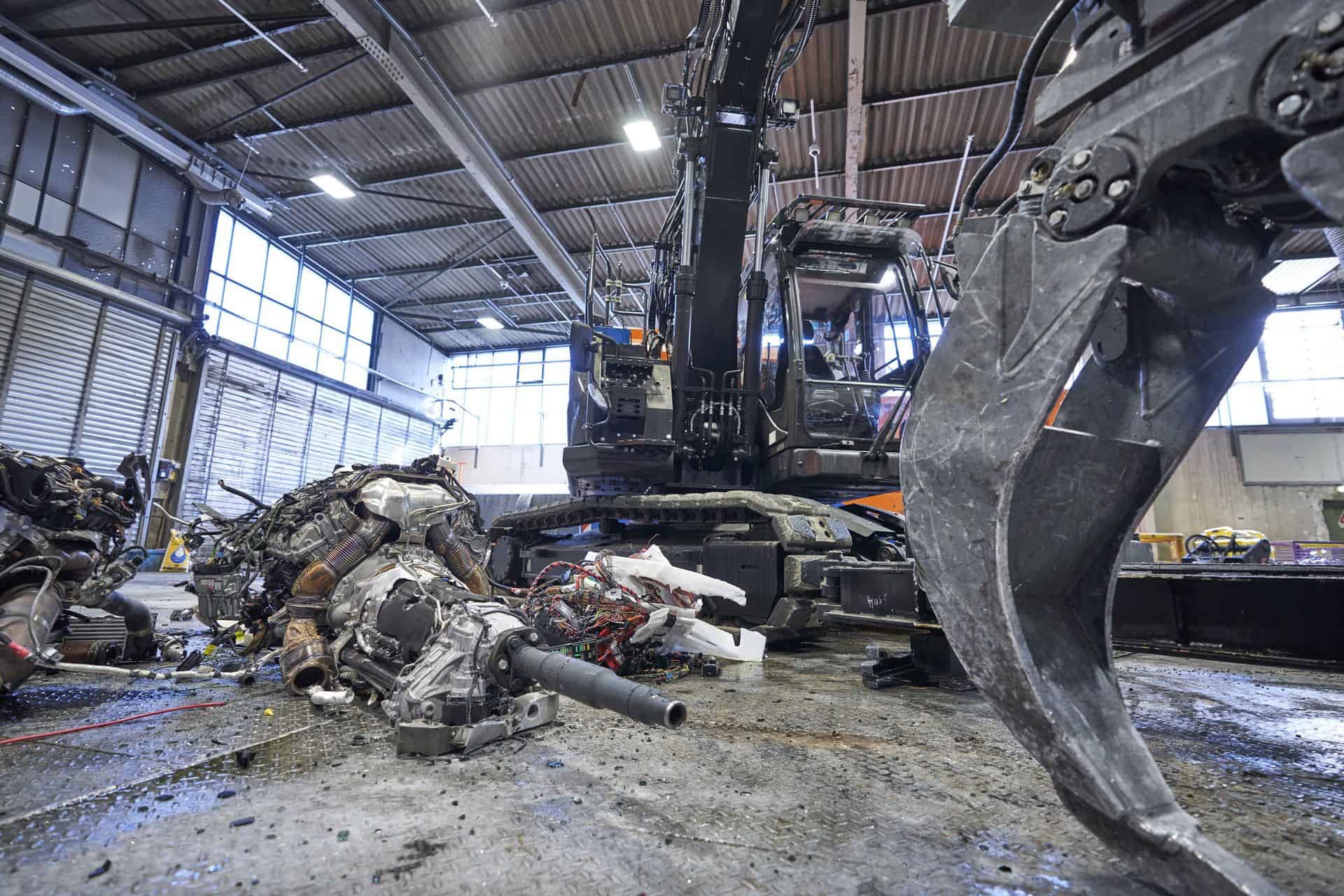 Afterward – or if the vehicle isn’t an EV – parts are scavenged. From software history and manual diagnosis, technicians can determine what can be sold as certified used parts. After detonating the airbags and draining the fluids, it’s time to get dirty. A small excavator powered by recycled EV components removes the engine, wiring harness, and interior. All that’s left is to send the chassis through a heavy-duty compactor, compressing the vehicle into a cube.