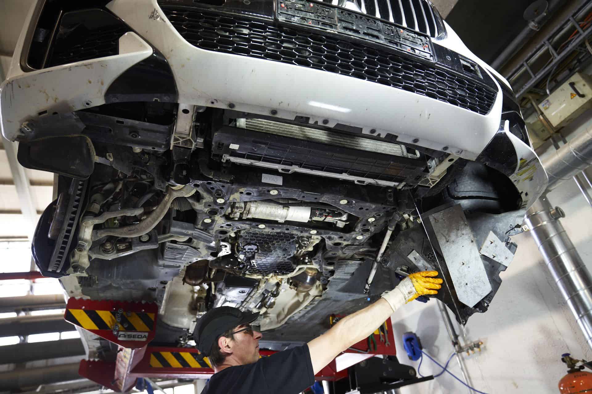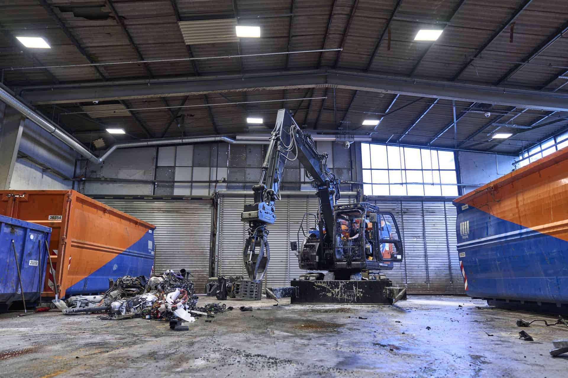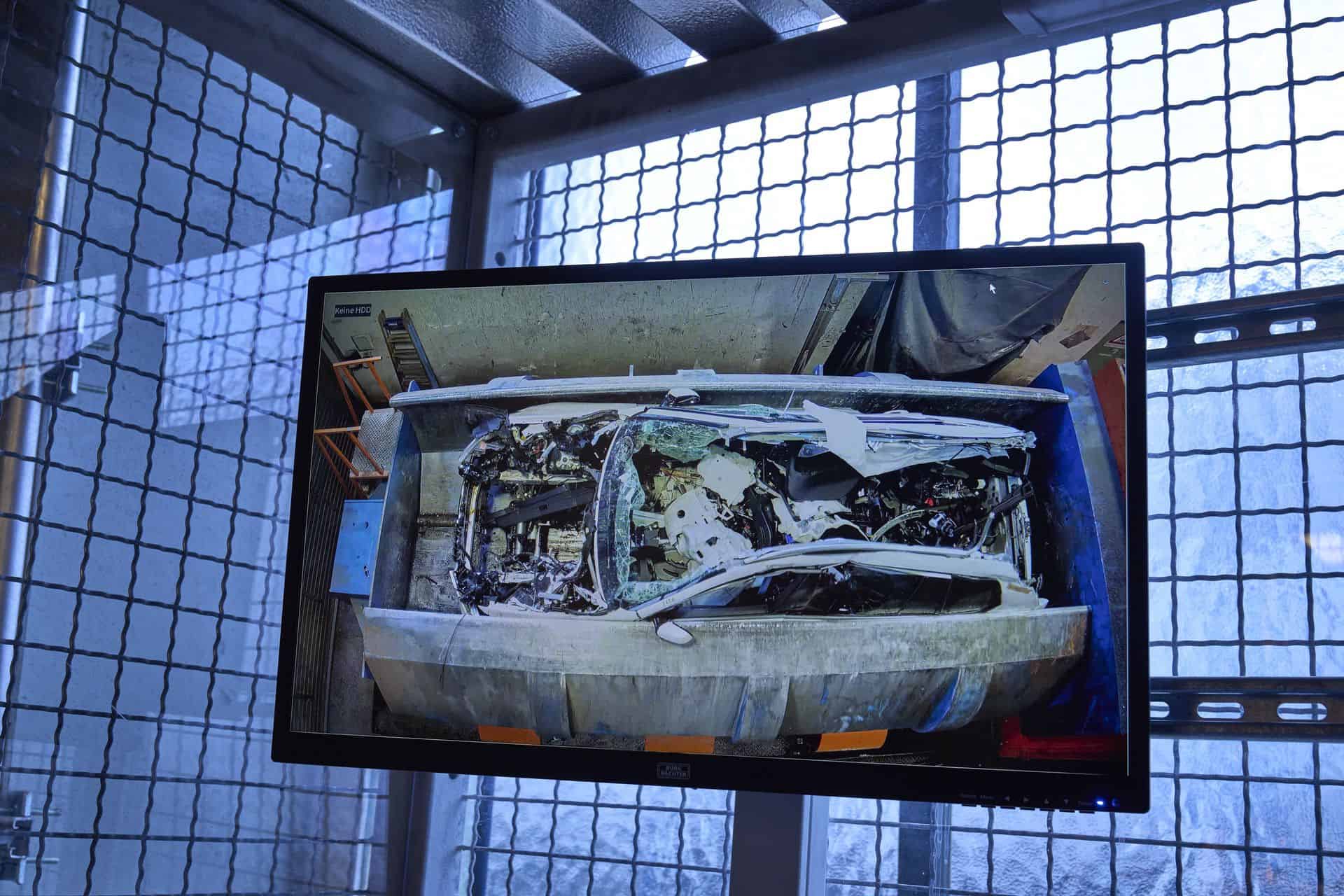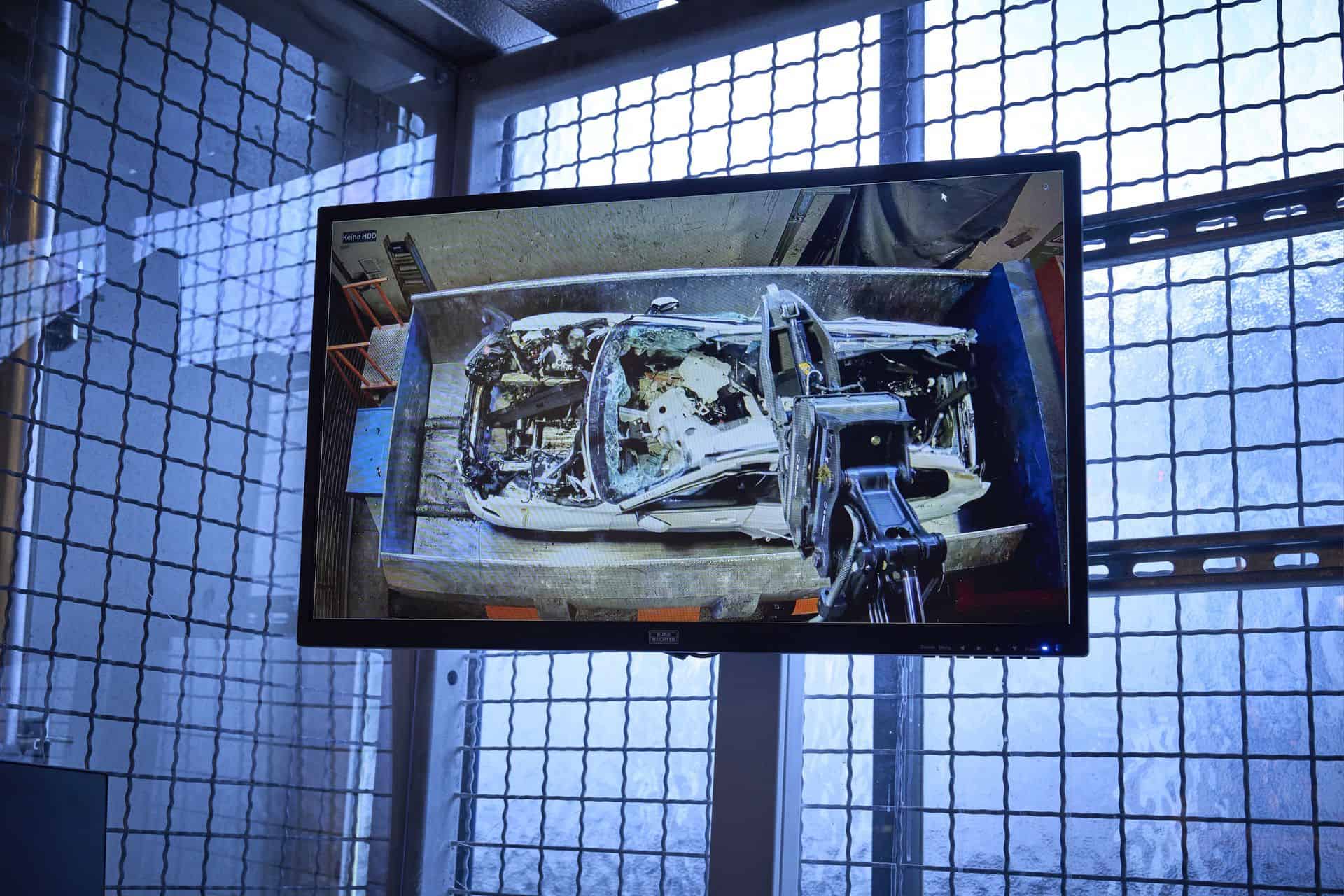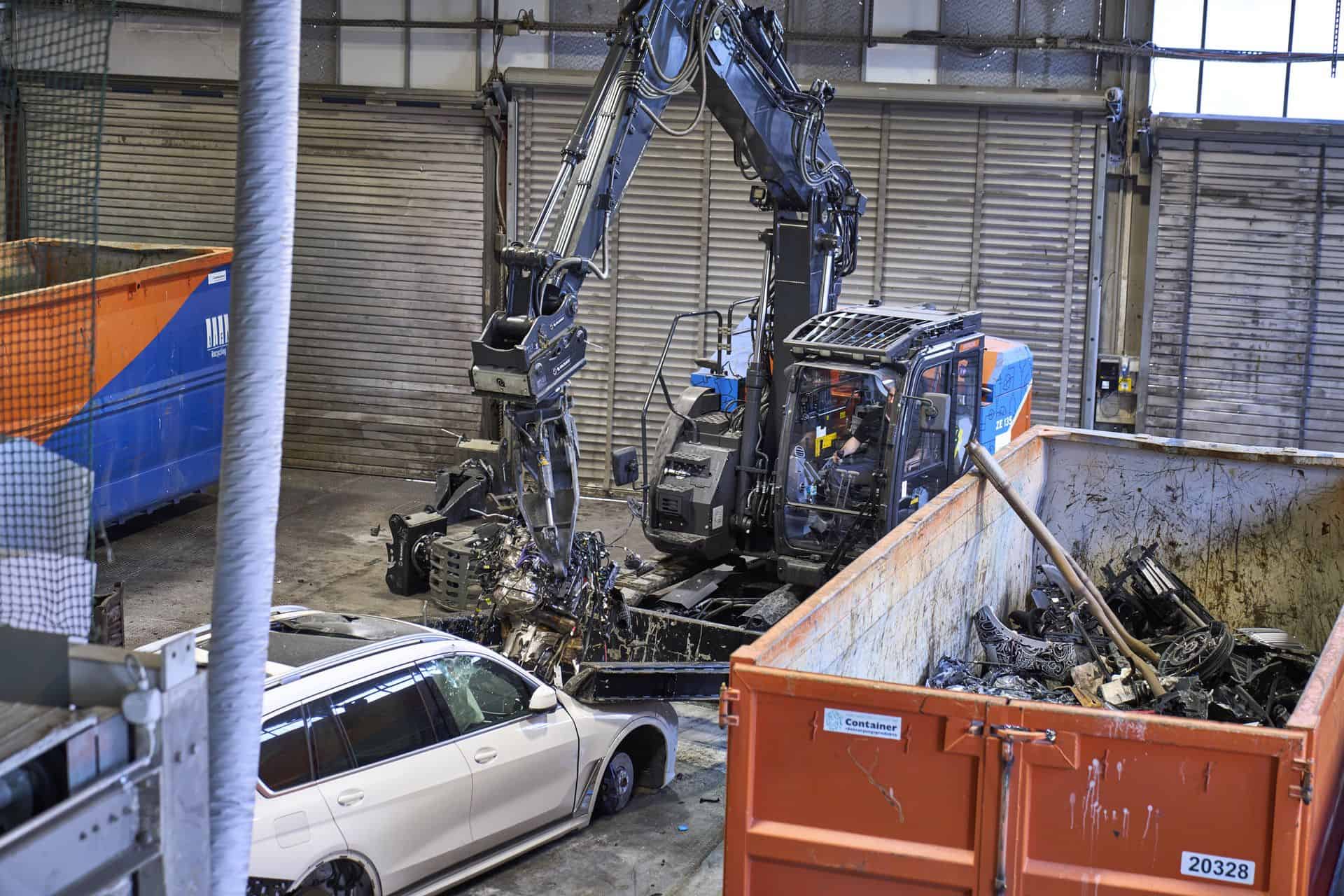 Afterward – or if the vehicle isn’t an EV – parts are scavenged. From software history and manual diagnosis, technicians can determine what can be sold as certified used parts. After detonating the airbags and draining the fluids, it’s time to get dirty. A small excavator powered by recycled EV components removes the engine, wiring harness, and interior. All that’s left is to send the chassis through a heavy-duty compactor, compressing the vehicle into a cube.