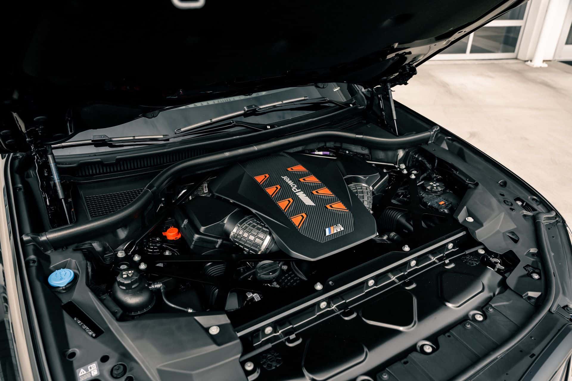 This 2024 BMW X5 M Competition has the black Extended Merino Leather upholstery and a carbon fiber trim, not to mention the optional panoramic Sky Lounge LED roof. One subtle change on the inside implemented with the mid-cycle update is the ambient light bar on the passenger side of the dashboard. It boasts the M letter on the X5 M whereas the lesser ones get an X instead.