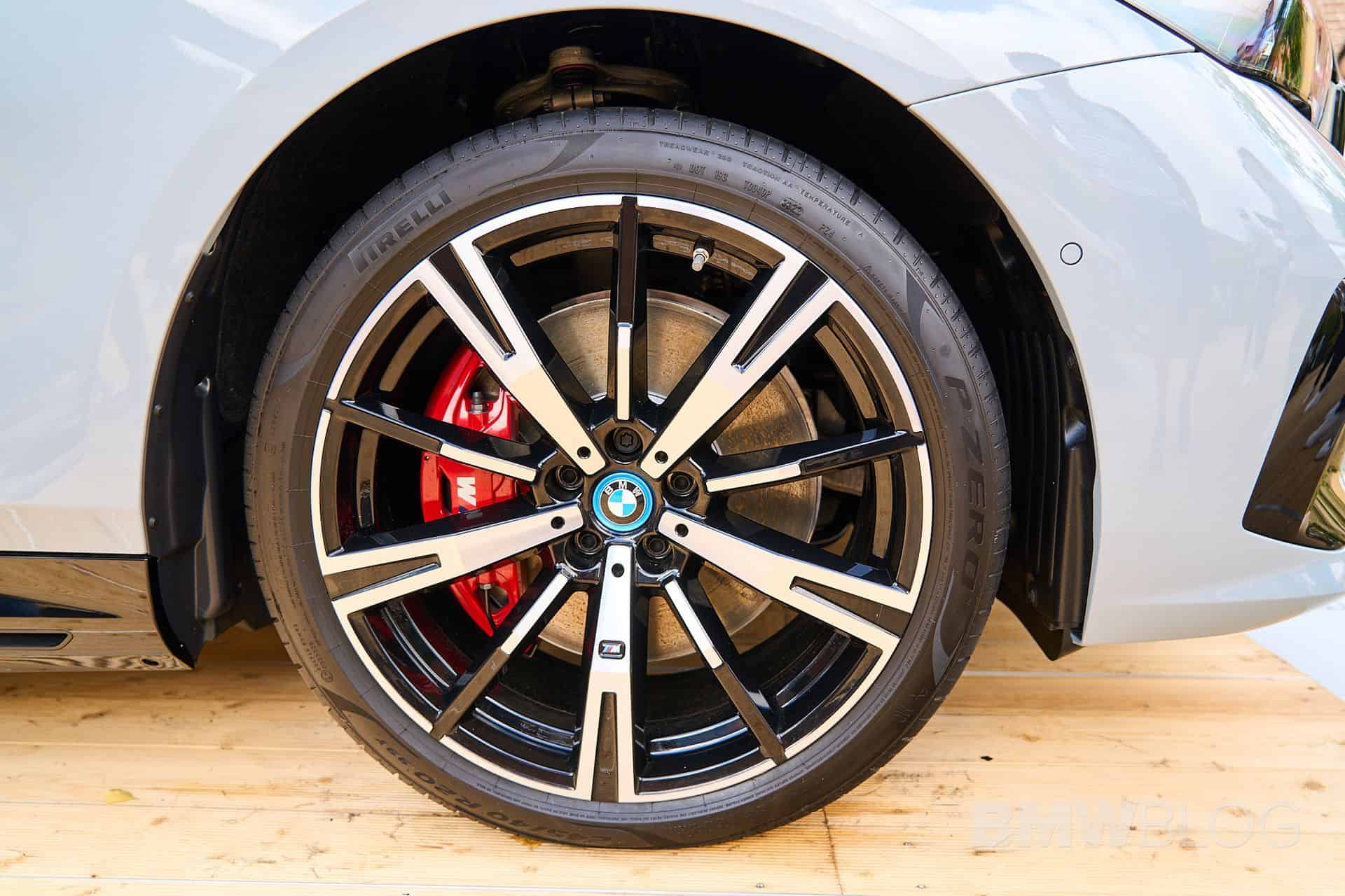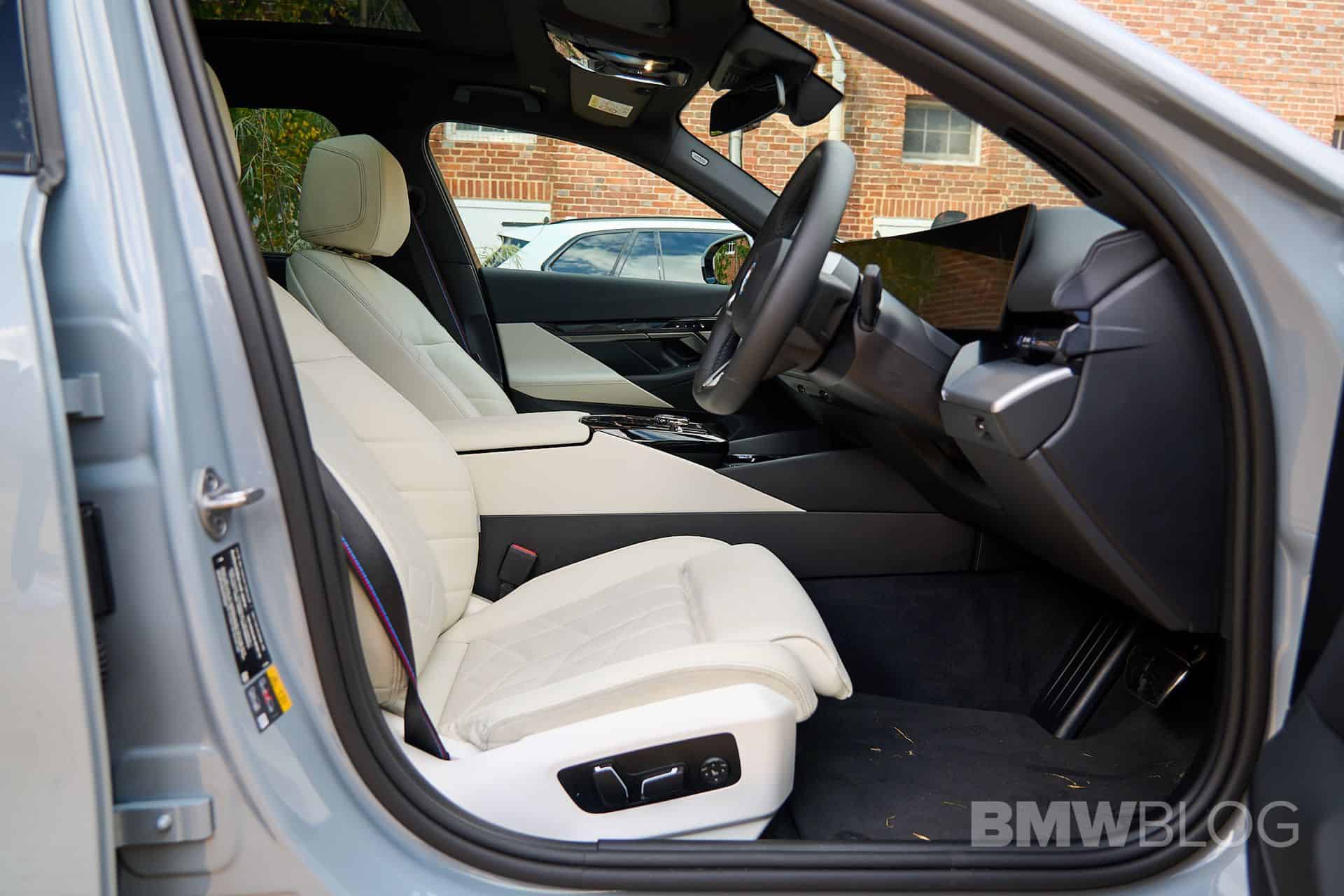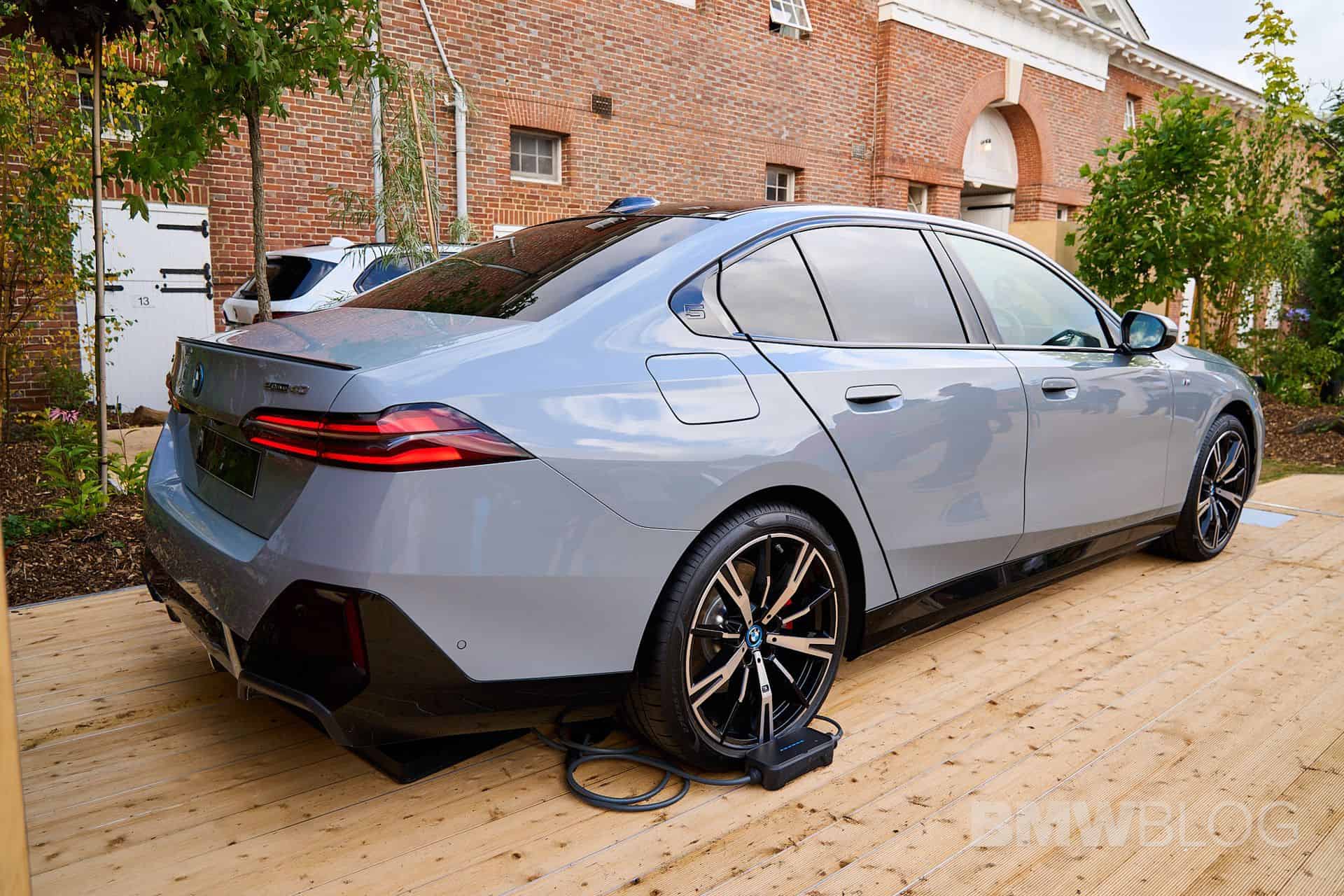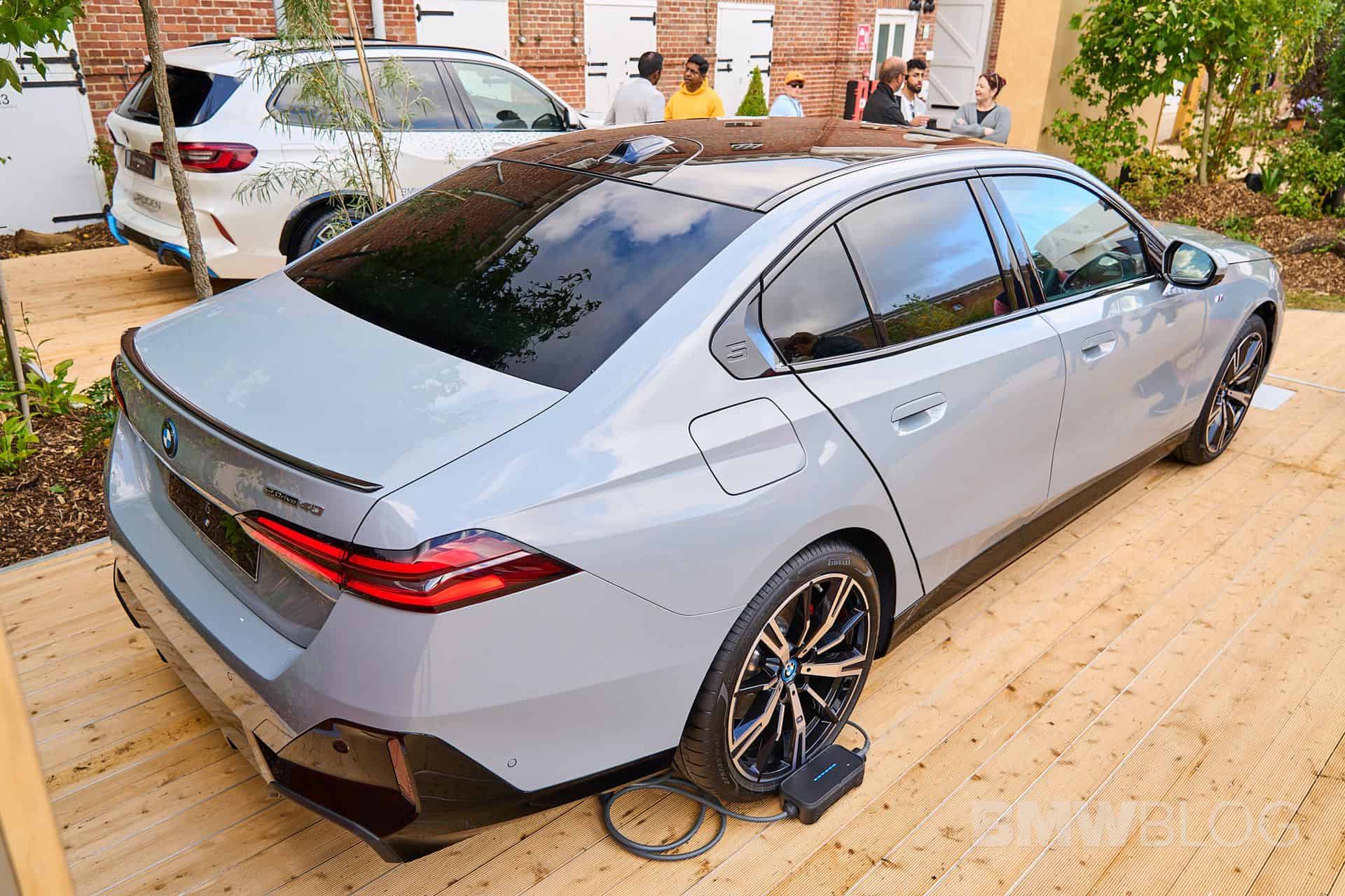 This i5 is not completely standard since it has a few upgrades to make it look better at the event. For starters, it’s dressed in M Sport attire – a $3,000 option in the US – with a Brooklyn Grey paint, 20-inch two-tone wheels, and red brake calipers. Naturally, BMW brought a right-hand-drive car to the event, featuring Smoke White upholstery. That’s actually Veganza, which is marketing speak for vegan leather. In fact, the 5 Series G60 is the company’s first production car to offer a truly vegan interior.