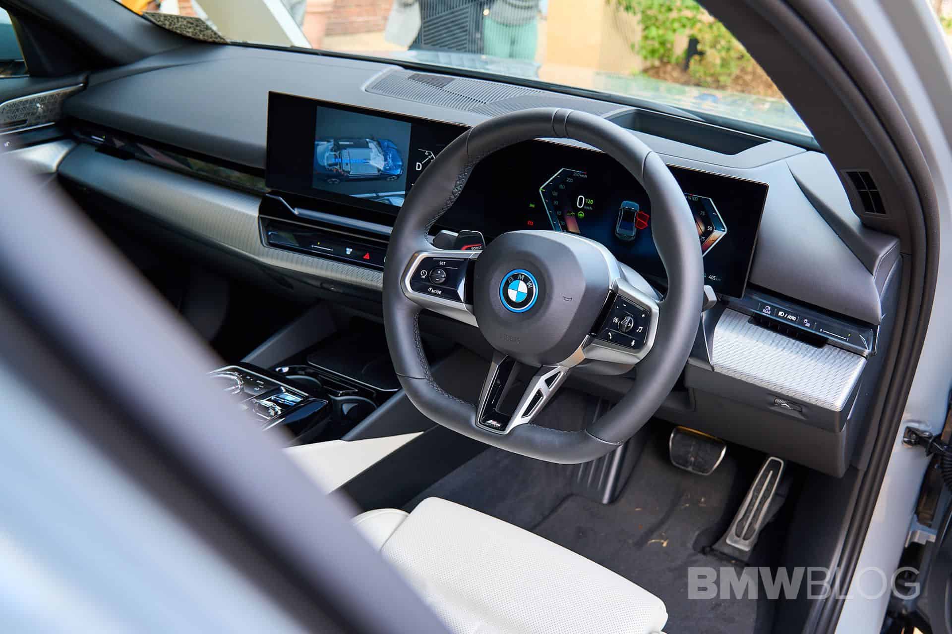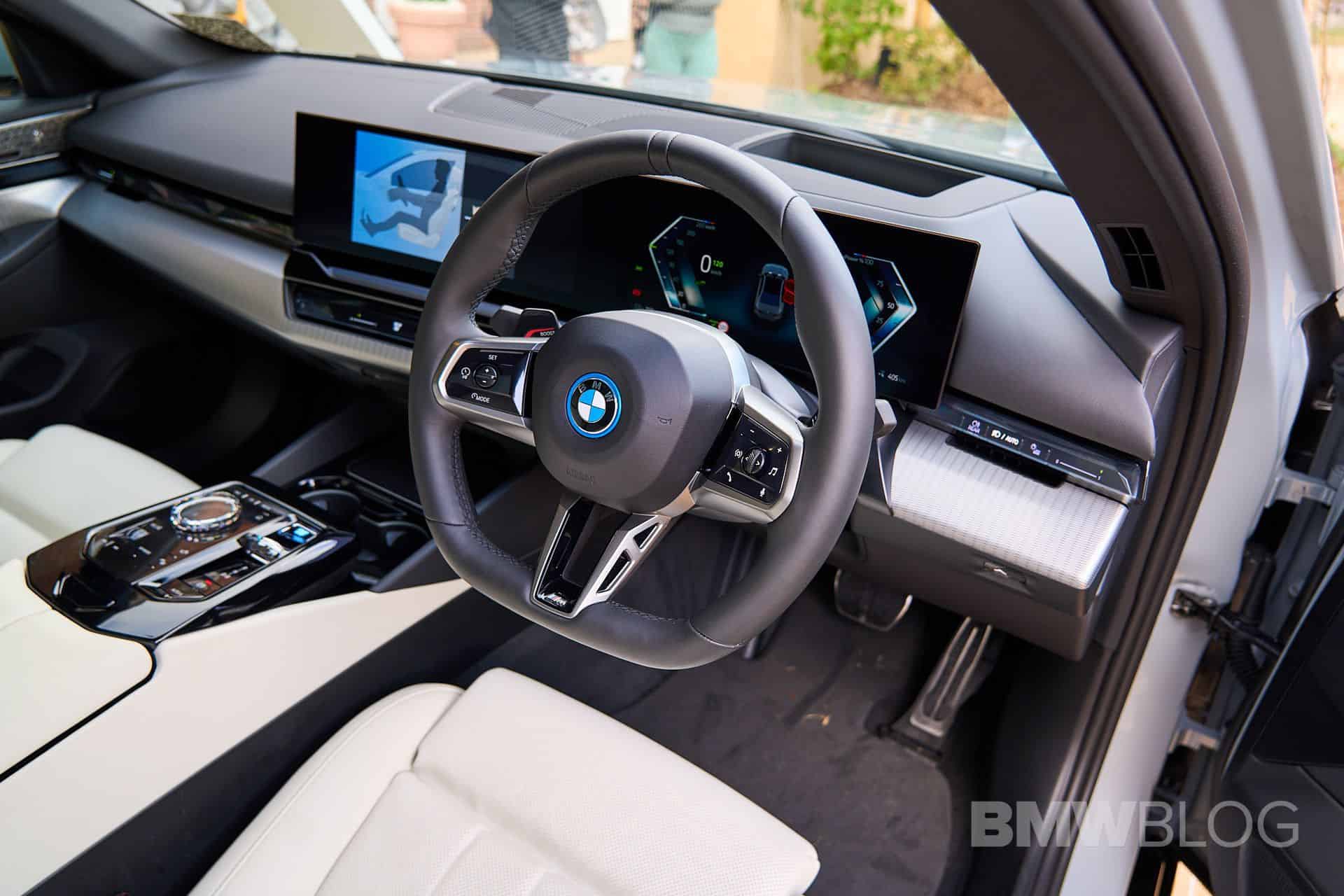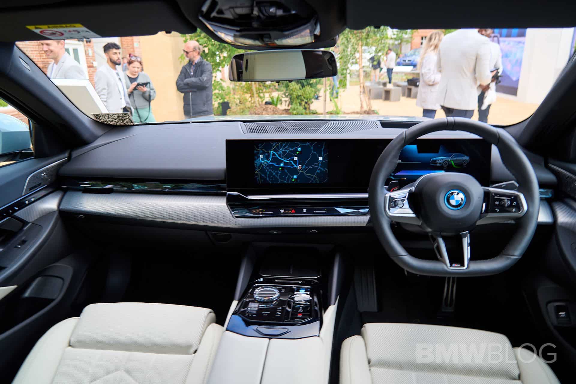 The car at Goodwood showcased an Aluminum Rhombicle trim on the dashboard, along with a decent amount of glossy black accents, and a flat-bottomed steering wheel. Much like the i7 M70 displayed at the same event, the i5 is among the first BMWs to get the iDrive 8.5 infotainment with the QuickSelect functionality that the X1 is also getting for its iDrive 9 setup.