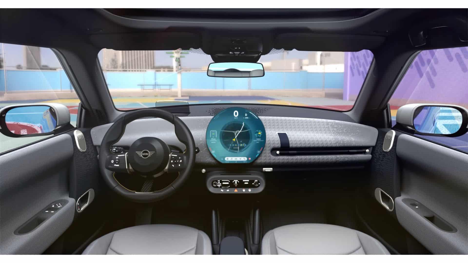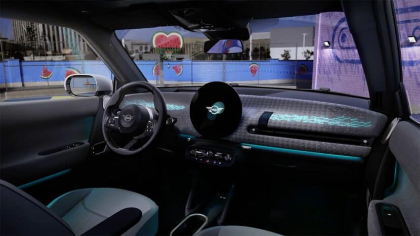 Next, the steering wheel is going to be smaller than the one you’ll find in current MINIs. We’re being told it has a sportier design, but that’s up to you to decide. Moreover, everything in this steering design is entirely vegan. Surprisingly, if you weren’t aware of it, you’d mistake it for genuine leather. MINI has also reintroduced the two-spoke steering wheel as a prominent feature in their latest MINI lineup. Interestingly, the center spoke is cleverly crafted from fabric. Fun fact: you can change the color of that strap.