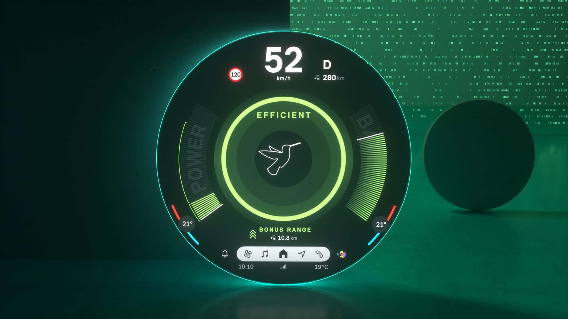 Located at the screen’s center is The start menu is ergonomically placed in the screen’s center offering a range of personalized content that can be easily selected and launched by swiping to the side. A fixed status bar is placed in the lower section of the screen is the fixed status bar with menu items such as “Navigation,” “Media,” “Telephony,” “All Apps,” and, situationally, “Home” for direct access.