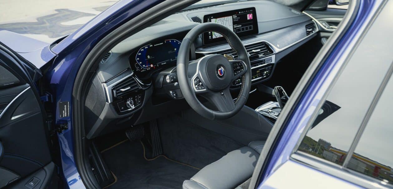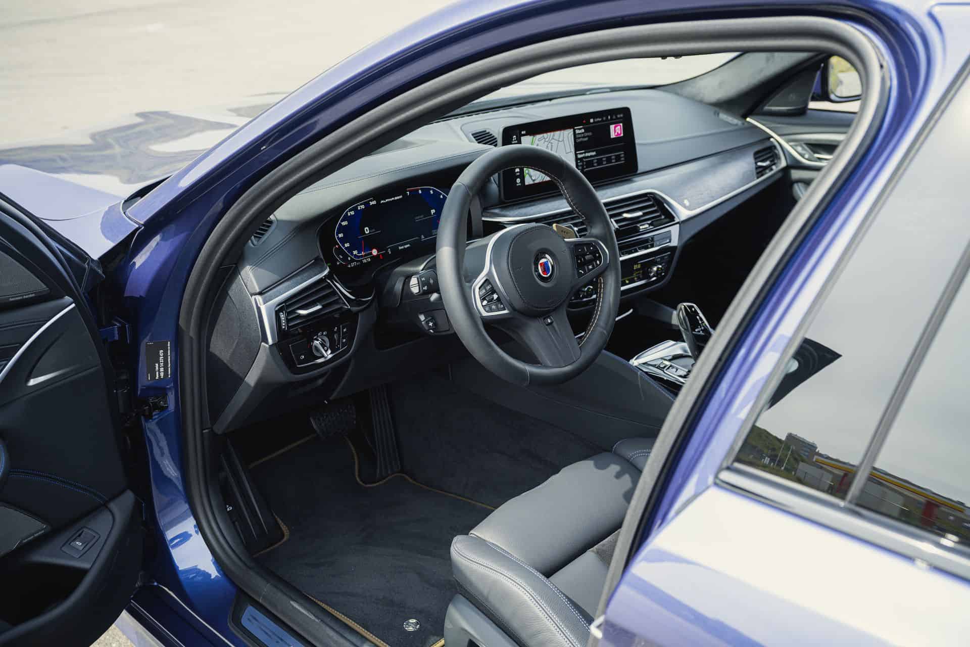 For those wanting ultimate customization inside the cabin, you can ask ALPINA‘s in-house saddlery to fulfill your dreams and create an individual full-leather interior made from LAVALINA leather. This is the same material you find standard on the steering wheel, which comes with Marron Volciano stitching – a stitch color which proved to be totally out of tune with all the other blue stitching inside the interior. The final touches are the ALPINA-themed digital dash, open-pore wood trim on the dashboard, B5 GT emblems on the floor mats, and bespoke aluminum shift paddles, painted in the same Marron Volciano.