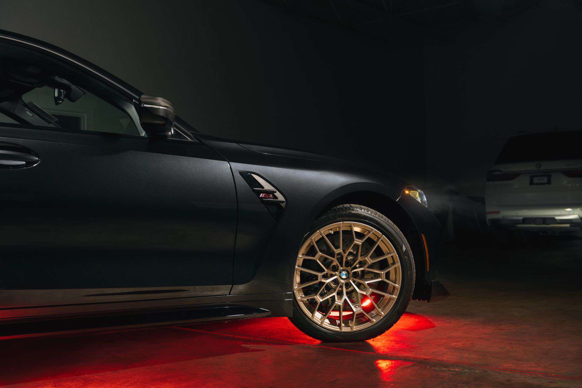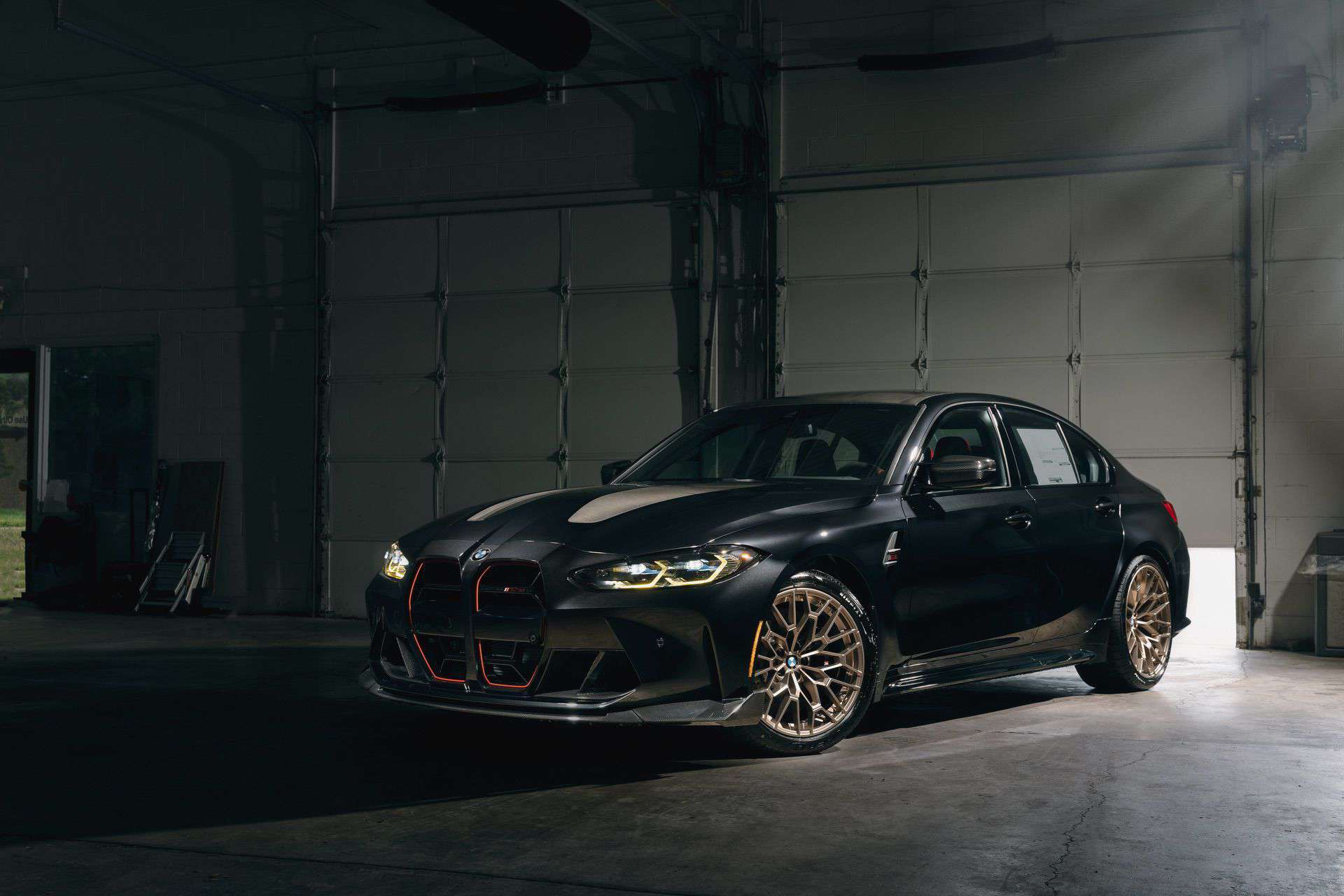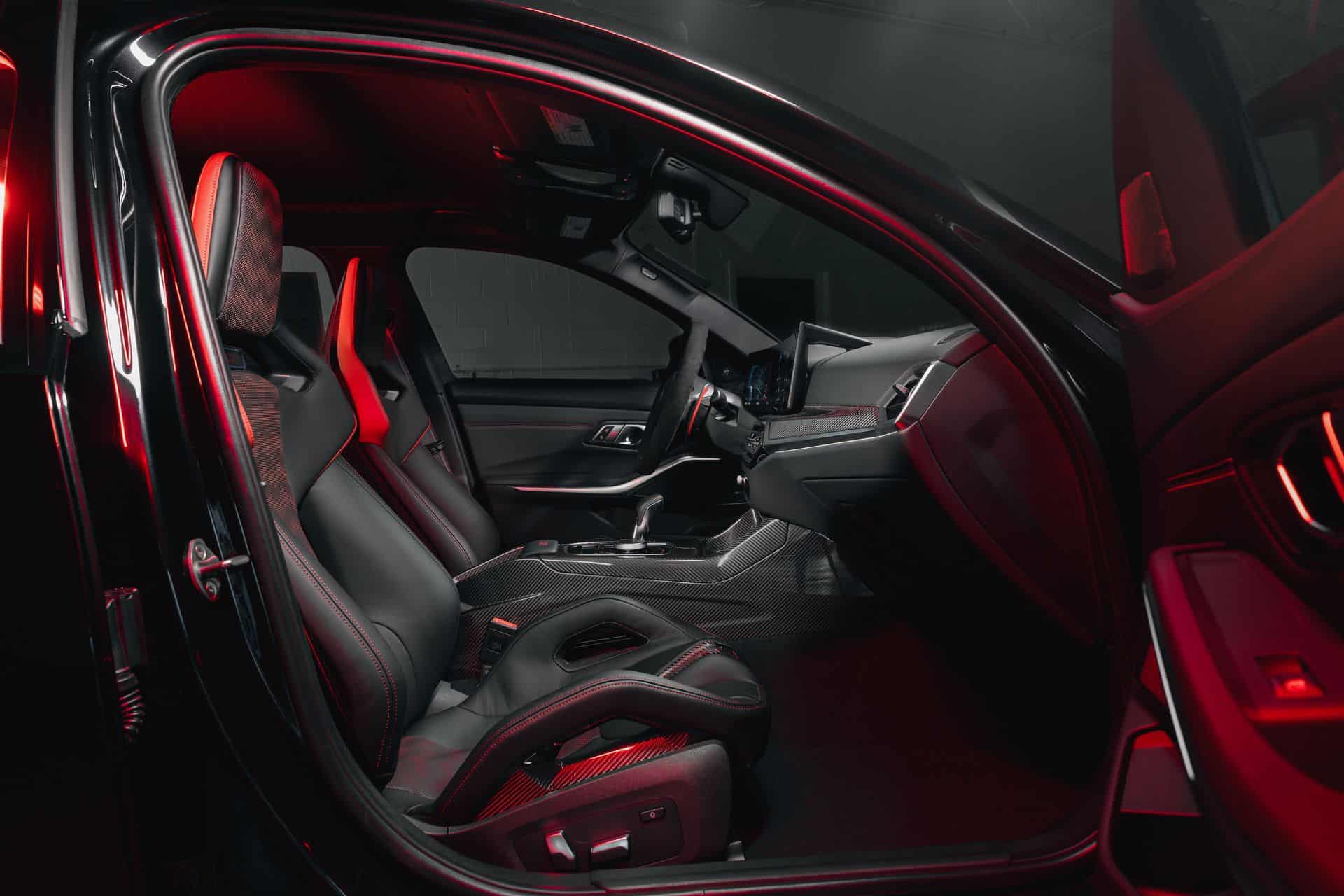 The elegant black paint complements the M3 CS impeccably, harmonizing flawlessly with its striking red accents and even the gold-painted wheels. To complete this ideal pairing, the interior features exquisite Merino leather in black, tastefully adorned with Mugello red accents. Notably, the yellow headlights stand out even more intriguingly against the backdrop of the deep black paint job.