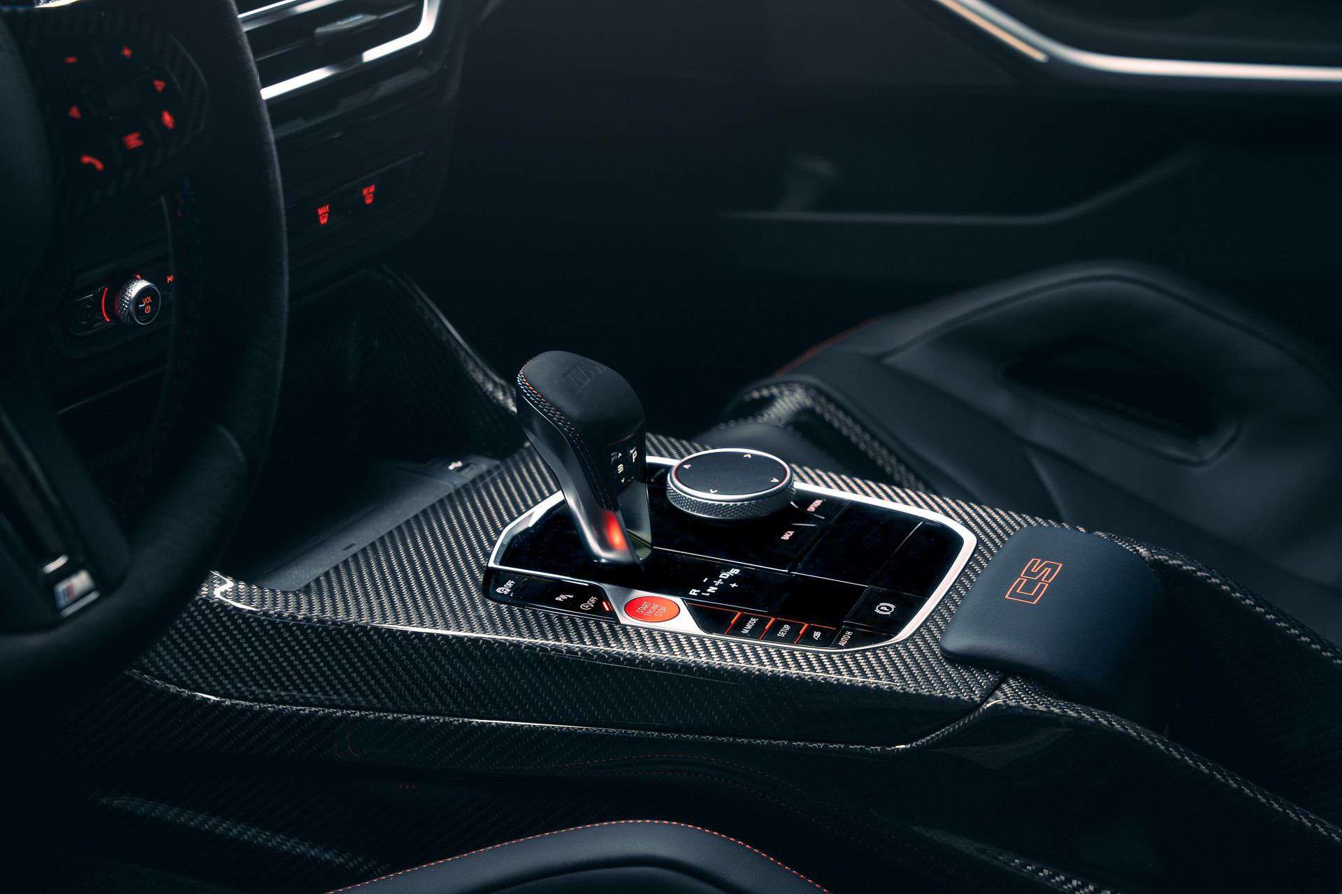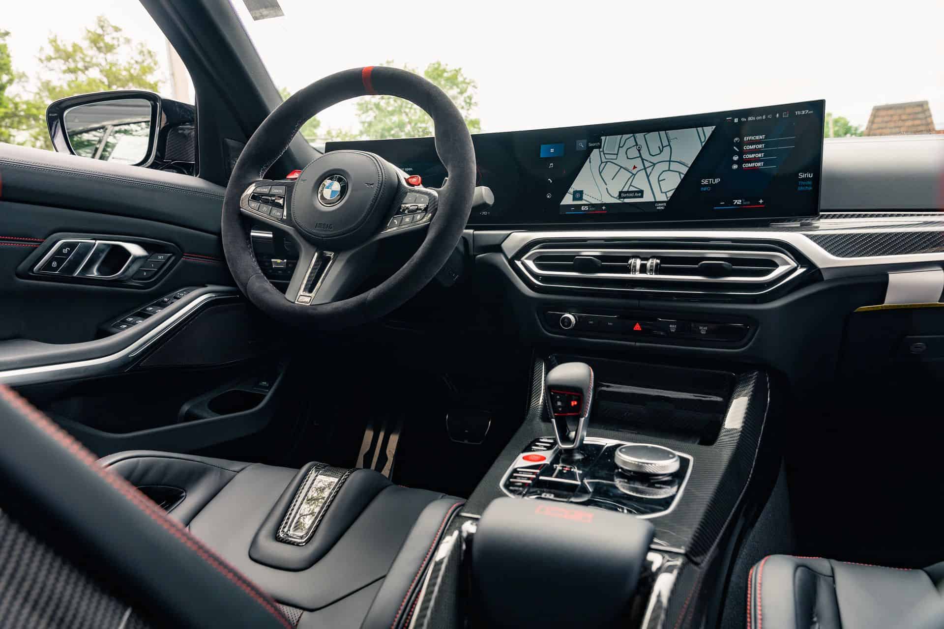 As captivating as its exterior, the interior of the 2024 BMW M3 CS leaves a lasting impression. Inside, you’ll be greeted by carbon bucket seats donning a striking two-tone color combination, complemented by a sleek carbon fiber center console. An interesting tidbit to note is the absence of cup holders, mirroring the characteristic of the M4 CSL. The most significant upgrades compared to the CSL model are the inclusion of iDrive 8 and a generously-sized curved display.