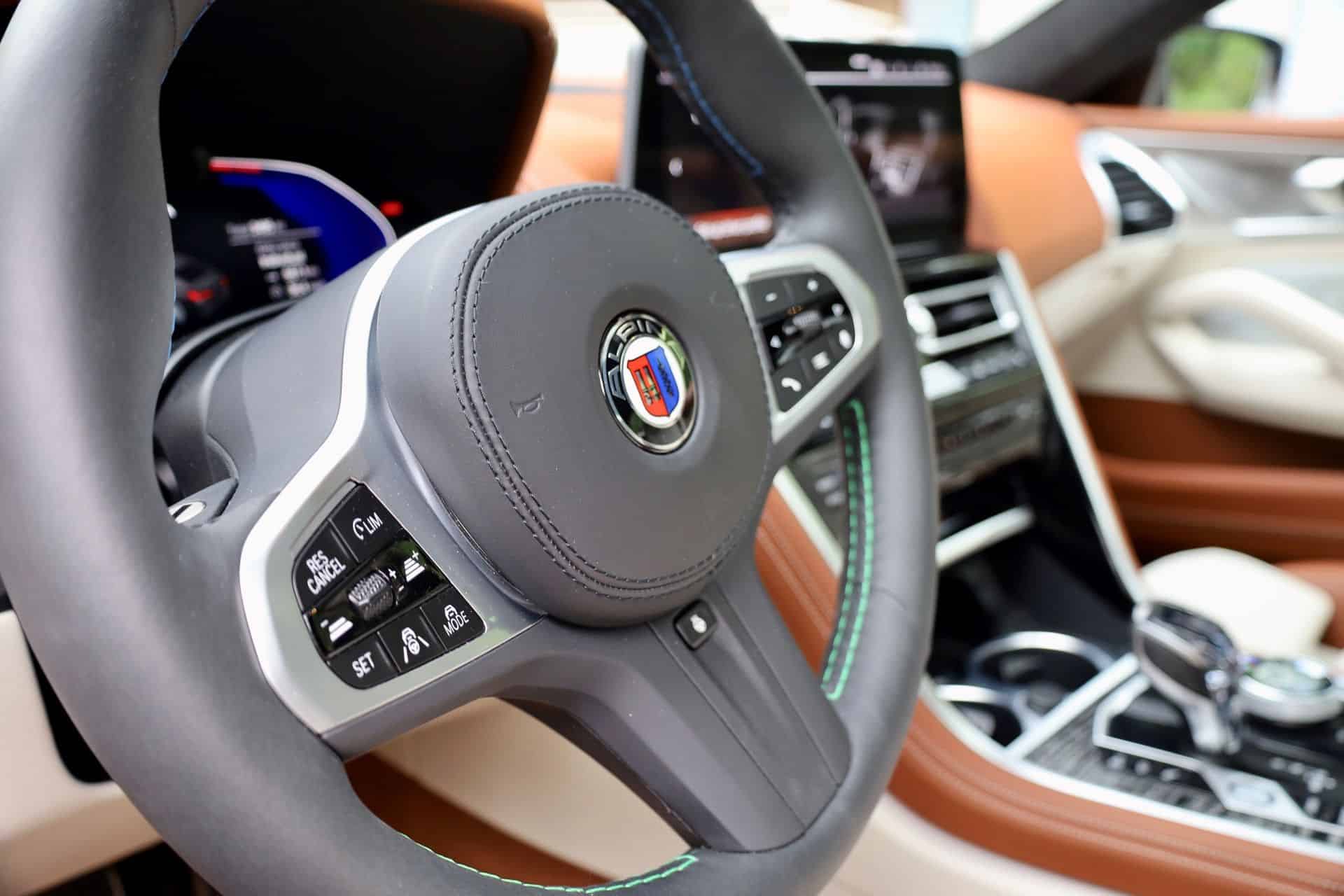 From behind the wheel, there’s no mistake that you’re not driving an ordinary 8 Series. Which, it should be said, is far from ordinary in its own right. The BMW ALPINA B8 Gran Coupe gets a unique LAVALINA leather steering wheel with blue and green stitching and an ALPINA roundel replacing the BMW one that normally sits in the center of the wheel. Behind the wheel, an ALPINA-specific gauge cluster design is visible. It looks similar to the regular one but features a cool blue color scheme (green in Sport modes). The 210-mph speedometer is a classy touch.
